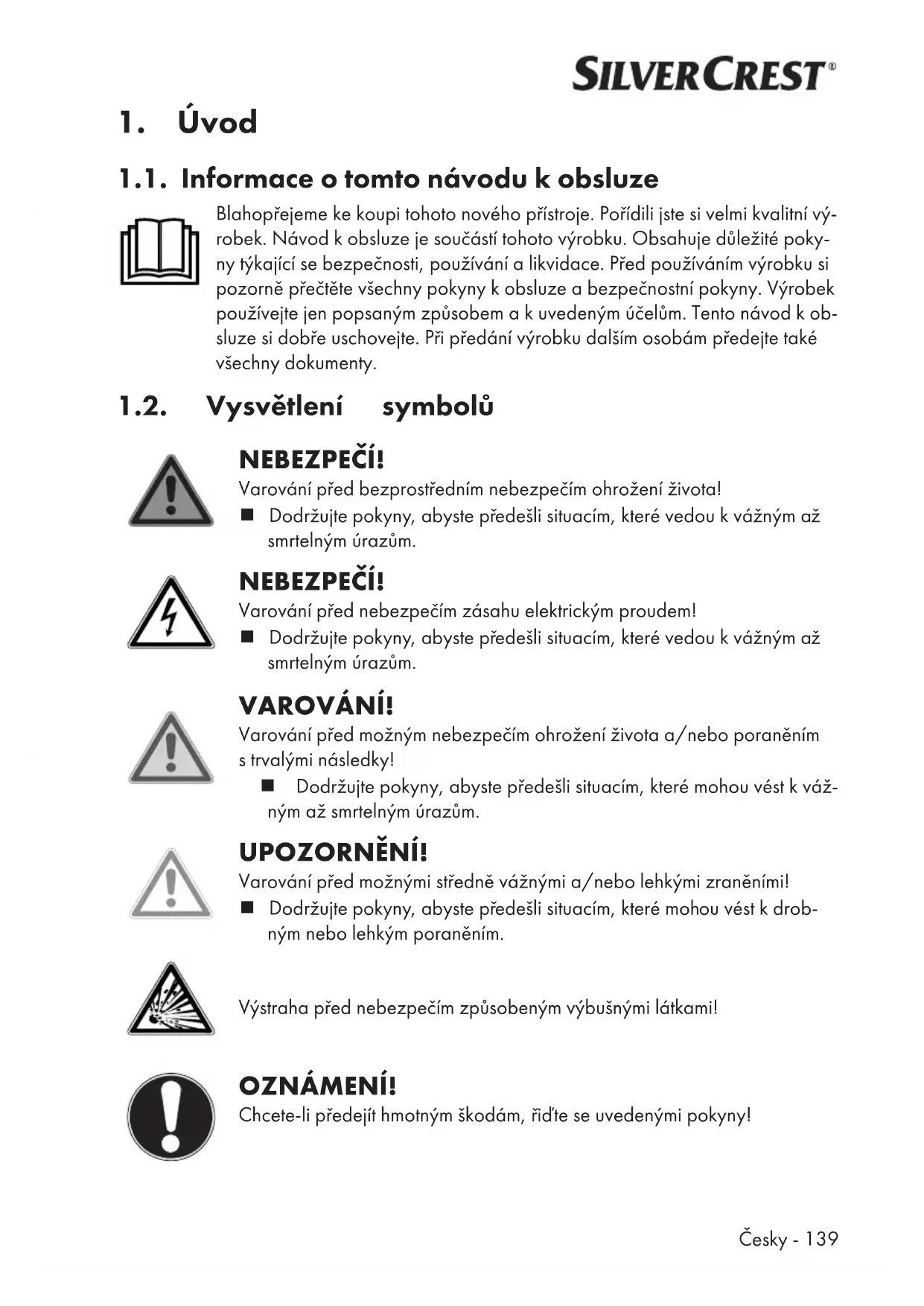 1.1. Informace otomto návodu kobsluze Blahopřejeme ke koupi tohoto nového přístroje. Pořídili jste si velmi kvalitní vý- robek. Návod kobsluze je součástí tohoto výrobku. Obsahuje důležité poky- ny týkající se bezpečnosti, používání alikvidace. Před používáním výrobku si pozorně přečtěte všechny pokyny kobsluze abezpečnostní pokyny. Výrobek používejte jen popsaným způsobem akuvedeným účelům. Tento návod kob- sluze si dobře uschovejte. Při předání výrobku dalším osobám předejte také všechny dokumenty. 1.2. Vysvětlení symbolů NEBEZPEČÍ! Varování před bezprostředním nebezpečím ohrožení života! Dodržujte pokyny, abyste předešli situacím, které vedou kvážným až smrtelným úrazům. NEBEZPEČÍ! Varování před nebezpečím zásahu elektrickým proudem! Dodržujte pokyny, abyste předešli situacím, které vedou kvážným až smrtelným úrazům. VAROVÁNÍ! Varování před možným nebezpečím ohrožení života a/nebo poraněním strvalými následky! Dodržujte pokyny, abyste předešli situacím, které mohou vést kváž- ným až smrtelným úrazům. UPOZORNĚNÍ! Varování před možnými středně vážnými a/nebo lehkými zraněními! Dodržujte pokyny, abyste předešli situacím, které mohou vést kdrob- ným nebo lehkým poraněním. Výstraha před nebezpečím způsobeným výbušnými látkami! OZNÁMENÍ! Chcete-li předejít hmotným škodám, řiďte se uvedenými pokyny!140 - Česky Další informace opoužívání spotřebiče! Dbejte upozornění uvedených vnávodu kobsluze!
