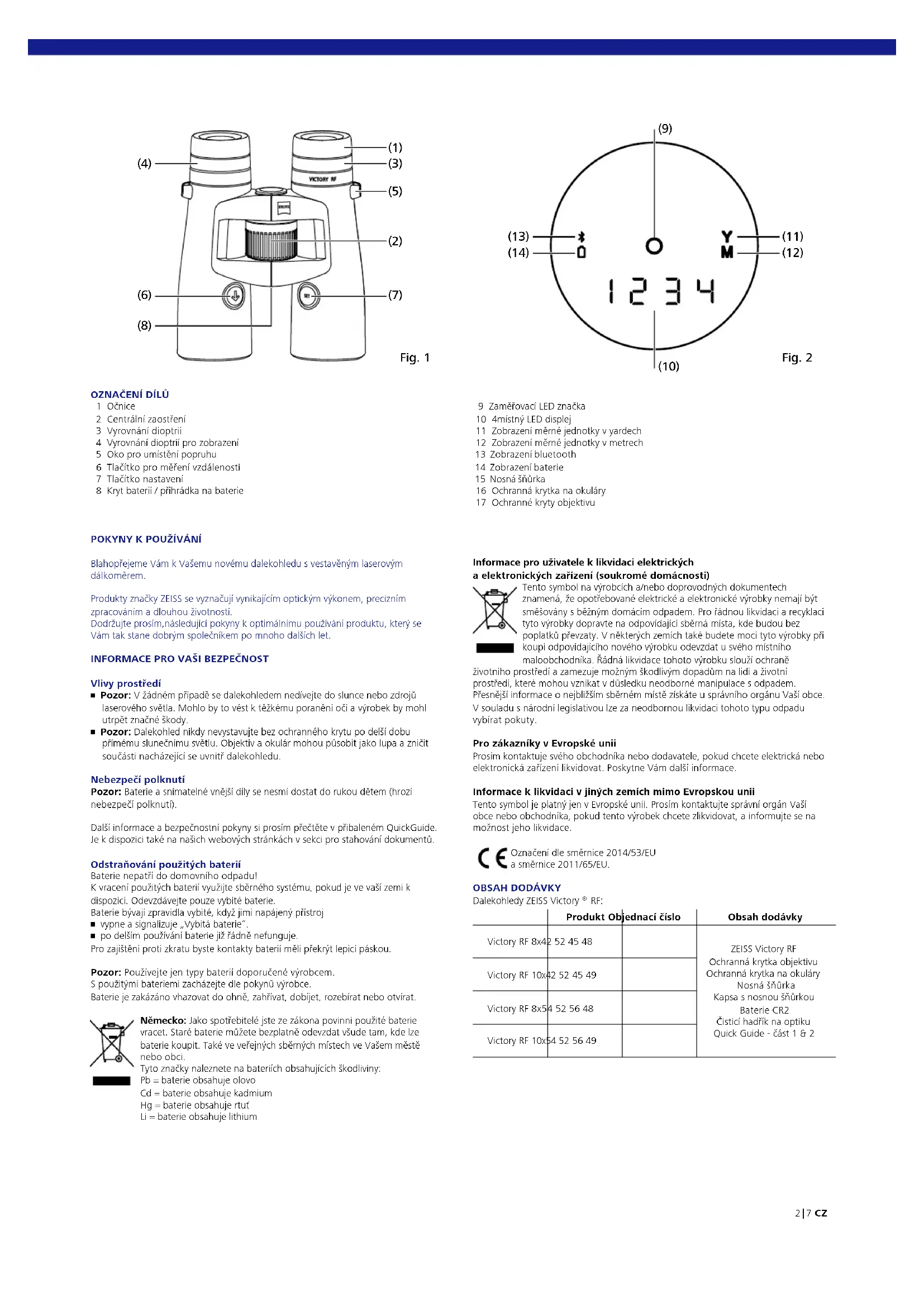 RF: Produkt Objednací číslo Obsah dodávky Victory RF 8x42 52 45 48 ZEISS Victory RF Ochranná krytka objektivu Ochranná krytka na okuláry Nosná šňůrka Kapsa s nosnou šňůrkou Baterie CR2 Čisticí hadřík na optiku Quick Guide - část 1 & 2 Victory RF 10x42 52 45 49 Victory RF 8x54 52 56 48 Victory RF 10x54 52 56 49 (5) (3) (1) Fig. 1 (7) (4) (6) (8) (2) Fig. 2 (12) (11) (14) (13) (9) (10) 9 Zaměřovací LED značka 10 4místný LED displej 11 Zobrazení měrné jednotky v yardech 12 Zobrazení měrné jednotky v metrech 13 Zobrazení bluetooth 14 Zobrazení baterie 15 Nosná šňůrka 16 Ochranná krytka na okuláry 17 Ochranné kryty objektivu
