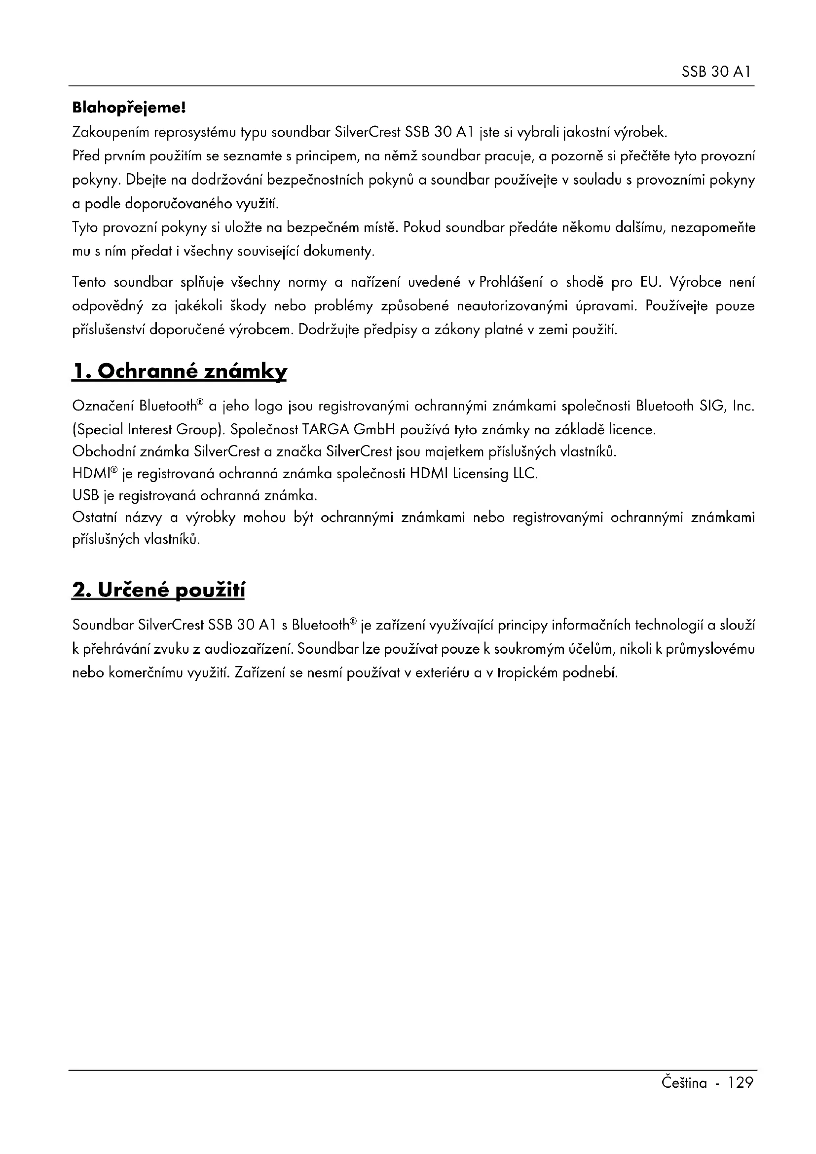 13. Prohlášení o shodě ............................................................................................... 149 14. Informace o záruce a servisu ................................................................................ 150SSB 30 A1 Čeština - 129 Blahopřejeme! Zakoupením reprosystému typu soundbar SilverCrest SSB 30 A1 jste si vybrali jakostní výrobek. Před prvním použitím se seznamte s principem, na němž soundbar pracuje, a pozorně si přečtěte tyto provozní pokyny. Dbejte na dodržování bezpečnostních pokynů a soundbar používejte v souladu s provozními pokyny a podle doporučovaného využití. Tyto provozní pokyny si uložte na bezpečném místě. Pokud soundbar předáte někomu dalšímu, nezapomeňte mu s ním předat i všechny související dokumenty. Tento soundbar splňuje všechny normy a nařízení uvedené v Prohlášení o shodě pro EU. Výrobce není odpovědný za jakékoli škody nebo problémy způsobené neautorizovanými úpravami. Používejte pouze příslušenství doporučené výrobcem. Dodržujte předpisy a zákony platné v zemi použití.