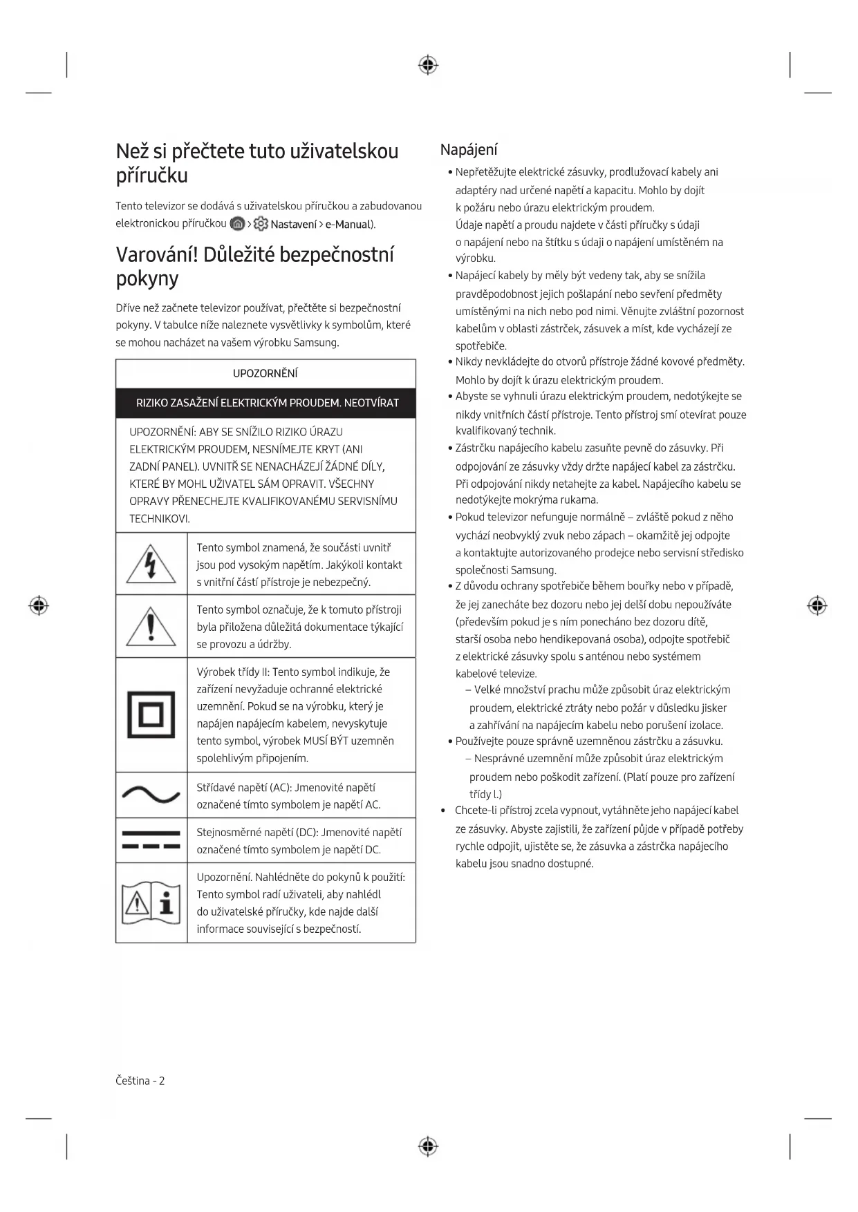 - Obrázky anákresy vtéto uživatelské příručce slouží pouze pro referenci amohou se lišit od skutečného vzhledu spotřebiče. Provedení aspecifikace spotřebiče se mohou změnit bez předchozího upozornění. V případě opravy produktu provedené neautorizovaným poskytovatelem servisních služeb, neodbornou opravou nebo opravou svépomocí, nenese společnost Samsung odpovědnost za žádné škody na výrobku, zranění ani za jiné problémy týkající se bezpečnosti výrobku způsobené výše zmíněným pokusem o opravu produktu, pokud nebyla provedena striktně v souladu s těmito pokyny pro opravu a údržbu. Záruka se nevztahuje na žádná poškození produktu způsobené pokusem o opravu produktu jinou osobou, nežli certifikovaným servisním střediskem společnosti Samsung. Navštivte samsung.com/support, kde najdete další informace o externím napájecím adaptéru a dálkovém ovládání související se směrnicí EU o spotřebě energie - nařízení ErP. Čeština - 8Pokyny křádné likvidaci tohoto spotřebiče (likvidace elektrických aelektronických zařízení) (platí vzemích se zavedenými systémy třídění odpadu) Toto označení na výrobku, na příslušenství avtištěných materiálech znamená, že by se tento výrobek ajeho elektronická příslušenství (např. nabíječka, sluchátka či kabel USB) na konci životnosti neměly likvidovat společně sjiným domovním odpadem. Oddělením od jiných druhů odpadu azodpovědnou recyklací podpoříte trvale udržitelné opakované využití materiálních zdrojů, zabráníte znečištění životního prostředí nebo poškození zdraví způsobenému neřízenou likvidací odpadu. Domácí uživatelé by měli kontaktovat buď maloobchodního prodejce, ukterého tento výrobek zakoupili, nebo úřad místní správy avyžádat si informace otom, kam ajak mohou tyto jednotky dopravit za účelem recyklace bezpečné pro životní prostředí. Firemní uživatelé by se měli obrátit na svého dodavatele azkontrolovat podmínky kupní smlouvy. Tento výrobek ajeho elektronická příslušenství by neměla být slučována sjiným hospodářským odpadem. Správná likvidace baterií vtomto spotřebiči (platí vzemích se zavedenými systémy třídění odpadu) Toto označení na baterii, vpříručce nebo na obalu znamená, že by baterie na konci své životnosti neměla být likvidována společně sjiným komunálním odpadem. Případně vyznačené chemické značky Hg, Cd nebo Pb upozorňují na to, že baterie obsahuje rtuť, kadmium nebo olovo vmnožství překračujícím referenční úrovně stanovené směrnicí 2006/66/ES. Pokud nebudou baterie správně zlikvidovány, mohou tyto látky poškodit zdraví osob nebo životní prostředí. Vzájmu ochrany přírodních zdrojů aopětovného použití materiálů vás žádáme, abyste oddělili baterie od ostatních typů odpadu arecyklovali je vrámci místního systému recyklace baterií. Čeština - 9 ČeštinaFør du læser denne brugervejledning Denne brugervejledning og en integreret e-Manual følger med tv’et ( > Indstillinger > e-Manual). Advarsel! Vigtige sikkerhedsinstruktioner Læs sikkerhedsinstruktionerne, inden du anvender dit tv. Se tabellen herunder for en forklaring på symboler, der kan forekomme på dit Samsung-produkt. FORSIGTIG RISIKO FOR ELEKTRISK STØD. MÅ IKKE ÅBNES. FORSIGTIG: BAGPANELET MÅ IKKE FJERNES, DA DER ER RISIKO FOR ELEKTRISK STØD. DER ER INGEN INDVENDIGE DELE, DER KAN REPARERES AF BRUGEREN. ALLE