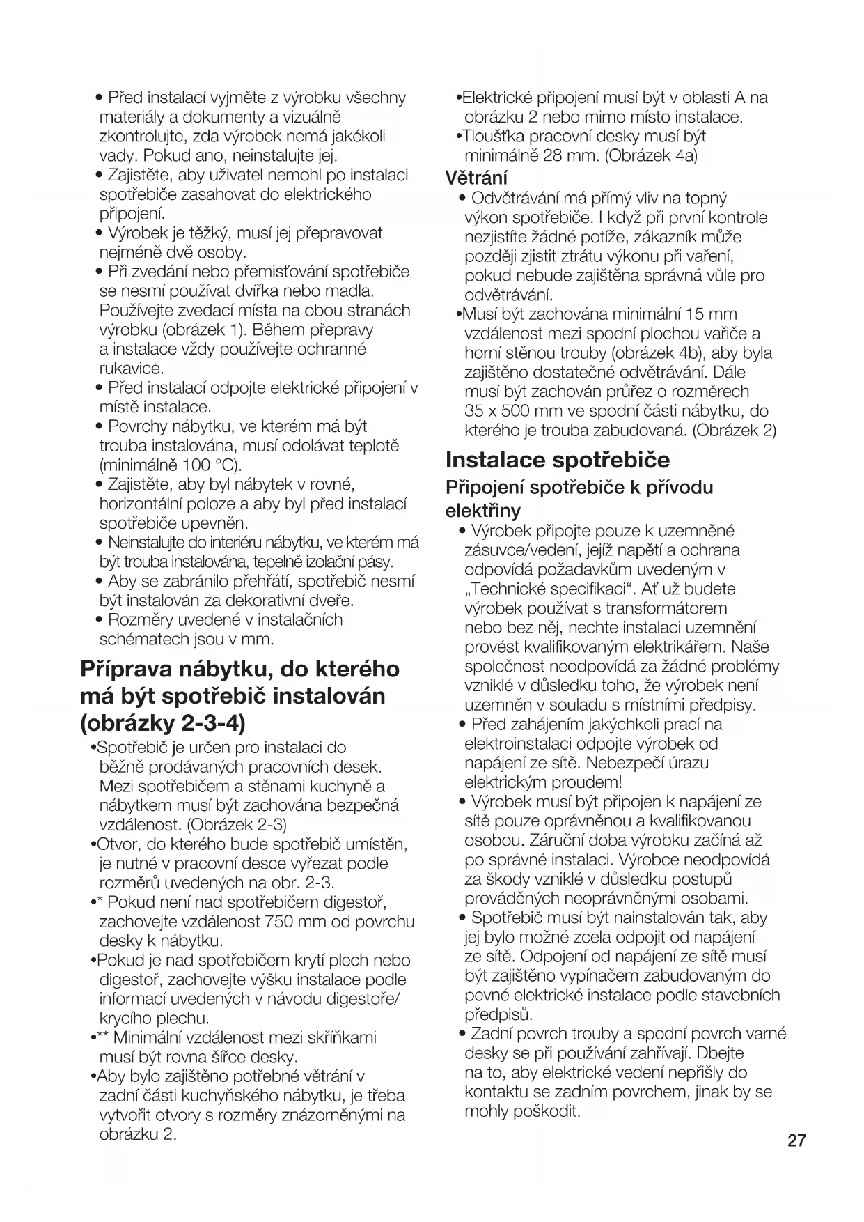 - Odvětrávání má přímý vliv na topný výkon spotřebiče. I když při první kontrole nezjistíte žádné potíže, zákazník může později zjistit ztrátu výkonu při vaření, pokud nebude zajištěna správná vůle pro odvětrávání.