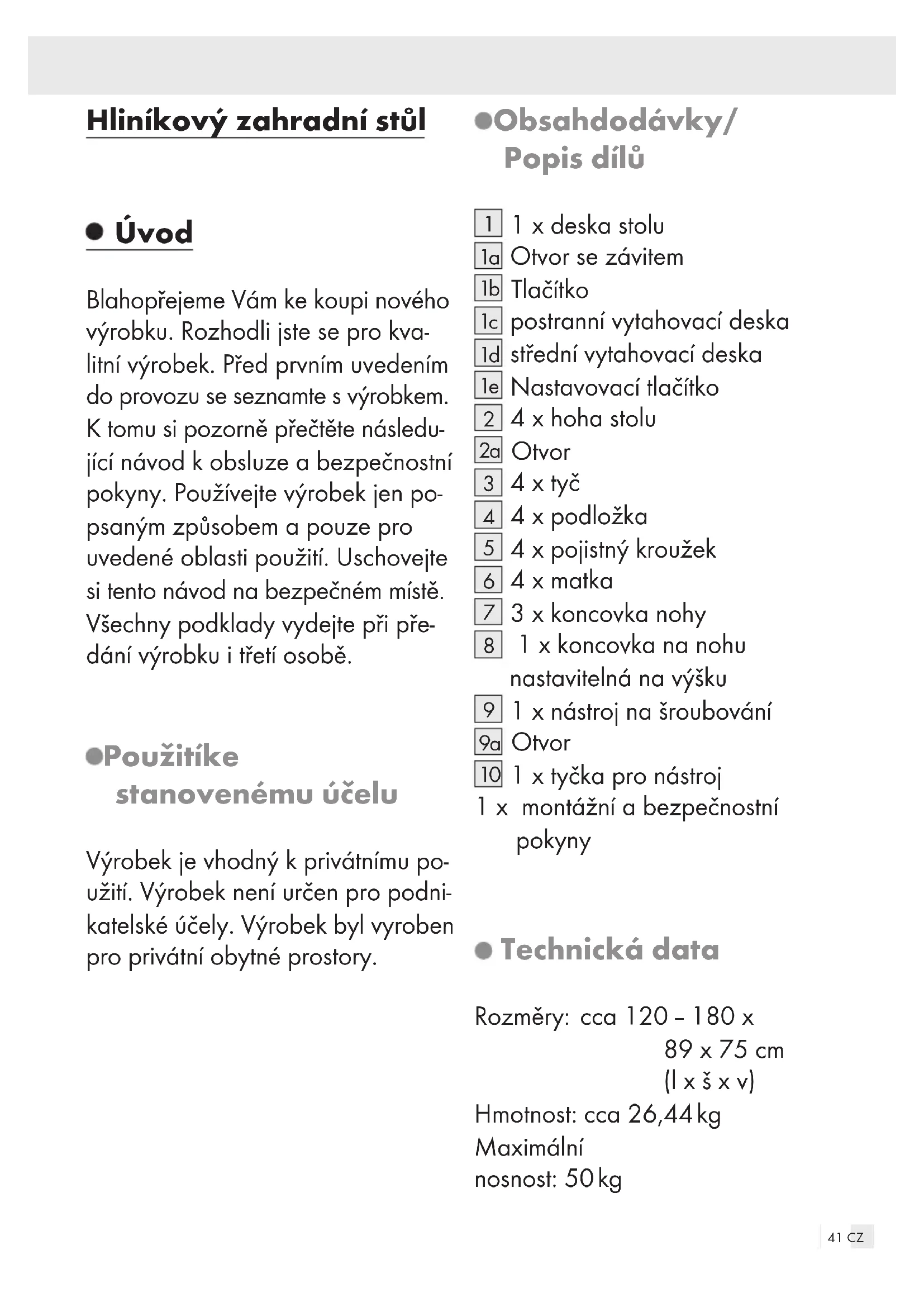 1 x tyčka pro nástroj 1 x montážní a bezpečnostní pokyny Technická data Rozměry: cca 120 – 180 x 89 x 75 cm (l x š x v) Hmotnost: cca 26,44 kg Maximální nosnost: 50 kg 352156_352161_352176_2007_flo_Aluminium_Gartentisch_content_OS.indd 41352156_352161_352176_2007_flo_Aluminium_Gartentisch_content_OS.indd 41 12.08.20 16:2212.08.20 16:2242 CZ Bezpečnostní upozornění