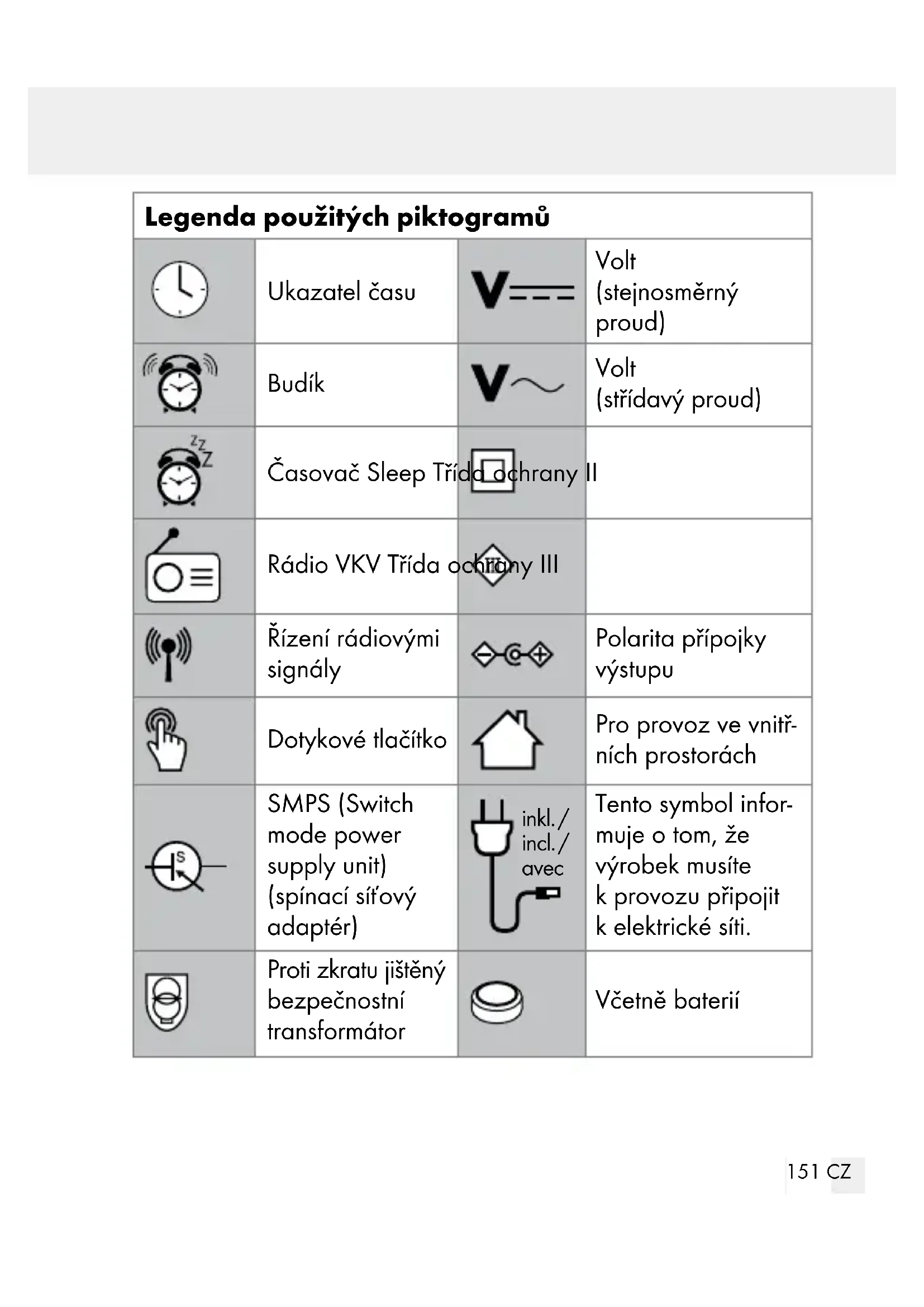 ŽIVOTA A ÚRAZU MALÝCH I VĚTŠÍCH DĚ TÍ! Nenechávejte děti nikdy bez dohledu sobalovým materiálem. Hrozí nebezpečí udušení obalovým materiálem. Děti často podcení nebezpečí. Tento výrobek mohou používat děti od 8 let, osoby se sníže- nými fyzickými, smyslovými nebo duševními schopnosti nebo s nedostatečnými zkušenostmi a znalostmi, jestliže budou pod dohledem nebo byly poučeny o bezpečném používání výrobku a chápou nebezpečí, která z jeho používání vyplývají. Svý- robkem si děti nesmí hrát. Děti nesmí bez dohledu provádět čištění ani uživatelskou údržbu výrobku. Před použitím se ujistěte, že dané síťové napětí souhlasí spotřebným provozním napětím síťového adaptéru (100–240 V∼ 50 / 60 Hz)! Před uvedením do provozu se ujistěte, že je světelný budík, síťový adaptér a kabelové spojení vbezvadném stavu! Poško- zený výrobek nikdy nepoužívejte!156 CZ Síťový adaptér musí být zapojen do snadno přístupné zásuvky, aby bylo možné vnouzovém případě výrobek snadno odpojit od přívodu elektrického proudu. Tento výrobek neobsahuje díly, ukterých by mohl uživatel provádět údržbu. Osvětlovací prostředky nelze vyměnit. Neumisťujte na výrobek otevřený oheň (např. svíčku). Výrobek je vhodný kpoužití pouze sdodaným síťovým adap- térem CZH024050300EUWH.