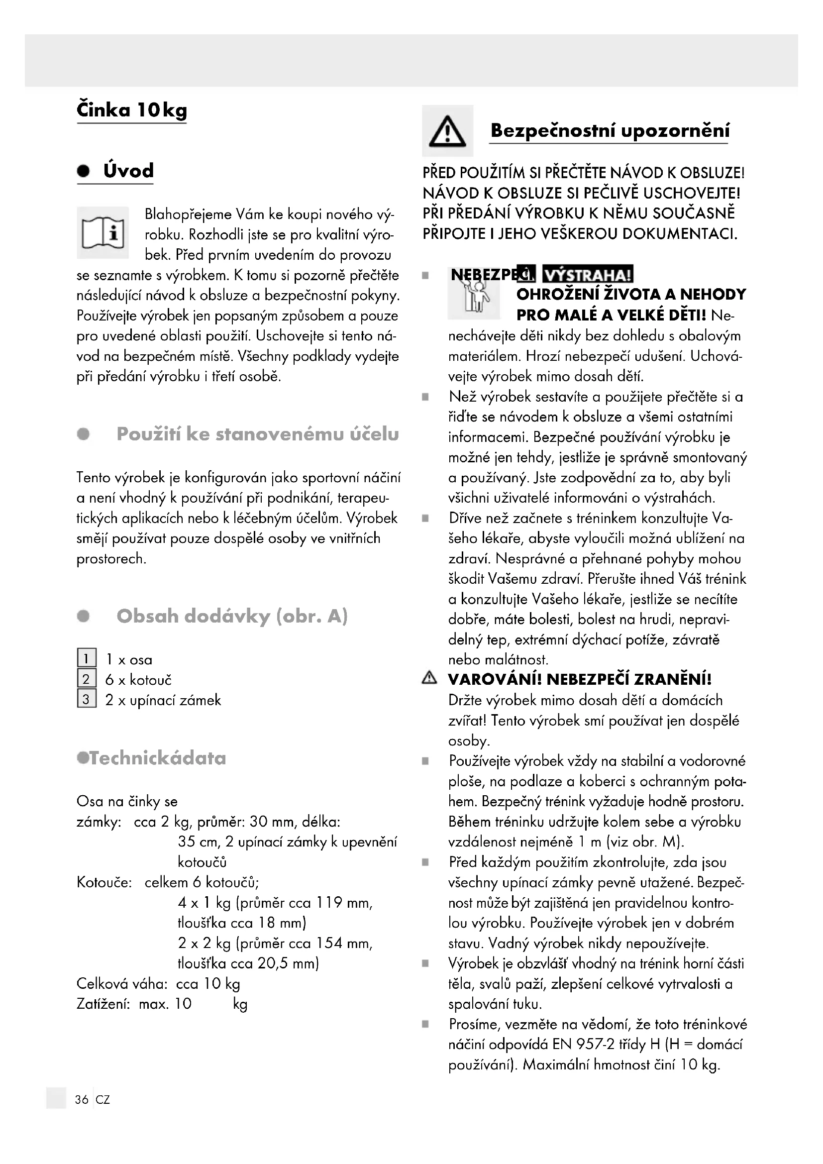 PRO MALÉ A VELKÉ DĚTI! Ne- nechávejte děti nikdy bez dohledu sobalovým materiálem. Hrozí nebezpečí udušení. Uchová- vejte výrobek mimo dosah dětí. Než výrobek sestavíte a použijete přečtěte si a řiďte se návodem k obsluze a všemi ostatními informacemi. Bezpečné používání výrobku je možné jen tehdy, jestliže je správně smontovaný a používaný. Jste zodpovědní za to, aby byli všichni uživatelé informováni o výstrahách. Dříve než začnete s tréninkem konzultujte Va- šeho lékaře, abyste vyloučili možná ublížení na zdraví. Nesprávné a přehnané pohyby mohou škodit Vašemu zdraví. Přerušte ihned Váš trénink a konzultujte Vašeho lékaře, jestliže se necítíte dobře, máte bolesti, bolest na hrudi, nepravi- delný tep, extrémní dýchací potíže, závratě nebo malátnost. VAROVÁNÍ! NEBEZPEČÍ ZRANĚNÍ! Držte výrobek mimo dosah dětí a domácích zvířat! Tento výrobek smí používat jen dospělé osoby. Používejte výrobek vždy na stabilní a vodorovné ploše, na podlaze a koberci s ochranným pota- hem. Bezpečný trénink vyžaduje hodně prostoru. Během tréninku udržujte kolem sebe a výrobku vzdálenost nejméně 1 m (viz obr. M). Před každým použitím zkontrolujte, zda jsou všechny upínací zámky pevně utažené. Bezpeč- nost může být zajištěná jen pravidelnou kontro- lou výrobku. Používejte výrobek jen v dobrém stavu. Vadný výrobek nikdy nepoužívejte. Výrobek je obzvlášť vhodný na trénink horní části těla, svalů paží, zlepšení celkové vytrvalosti a spalování tuku. Prosíme, vezměte na vědomí, že toto tréninkové náčiní odpovídá EN 957-2 třídy H (H = domácí používání). Maximální hmotnost činí 10 kg.37 CZ Toto tréninkové náčiní podle DIN EN ISO 20957-1 není vhodné pro mladistvé do 14 let. Rodiče a jiné osoby, kterým je svěřen dozor, si musejí být vědomi své odpovědnosti, protože zdůvodu přirozené dětské hravosti a touhy po poznávání je nutné počítat stakovými situacemi a chováním, pro které není tréninkové náčiní konstruováno. Pokud umožníte dětem výrobek používat, musíte vzít vúvahu jejich duševní a tělesný vývoj a především jejich temperament. Na děti byste měli dohlížet a především jim ukázat správné zacházení s výrobkem. Tréninkové náčiní není vhodné na hraní. Montáž Nasuňte kotouče