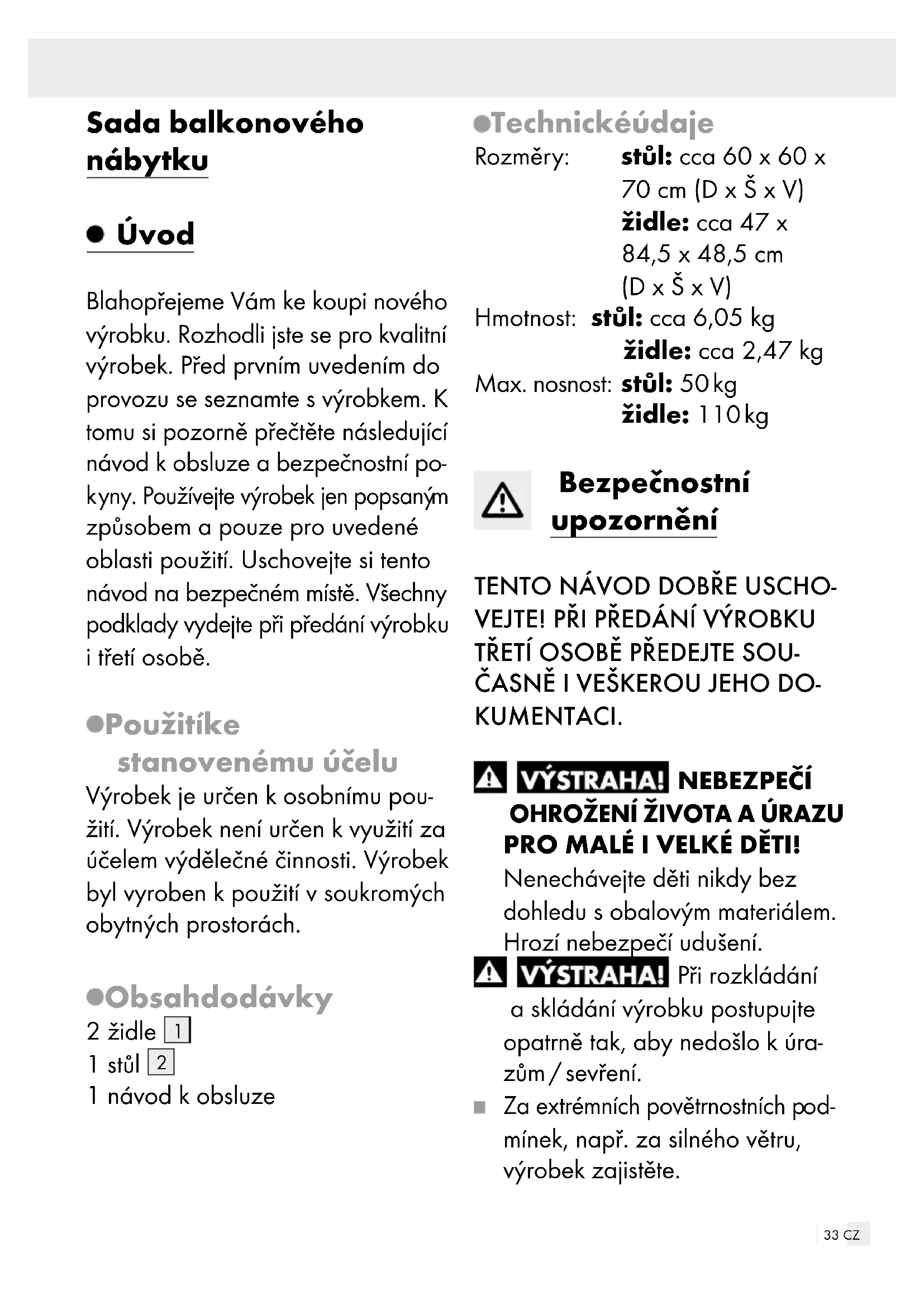 neobdržel pravidelnou údržbu. Záruka platí na vady materiálu a vý- robní vady. Tato záruka se nevzta- huje na díly výrobku podléhající opotřebení (např. na baterie), dále na poškození křehkých, choulosti- vých dílů, např. vypínačů, akumulá- torů nebo dílů zhotovených ze skla.36 CZ Postup v případě uplatňování záruky Pro zajištění rychlého zpracování Vašeho případu se řiďte následují- cími pokyny: Pro všechny požadavky si připravte pokladní stvrzenku a číslo artiklu (např. IAN 123456_7890) jako doklad o zakoupení. Číslo artiklu najdete na typovém štítku, gravuře, titulní stránce návodu (vlevo dole) nebo na nálepce na zadní nebo spodní straně. V případě poruch funkce nebo jiných závad nejdříve kontaktujte, telefo- nicky nebo e-mailem, v následujícím textu uvedené servisní oddělení. Výrobek registrovaný jako vadný potom můžete s přiloženým dokla- dem o zakoupení (pokladní stvrzen- kou) a údaji k závadě a kdy k ní došlo, bezplatně zaslat na adresu servisu, která Vám byla sdělena. Servis Servis Česká republika Tel.: 800600632 E-Mail: owim@lidl.cz37 SK Úvod ............................................................................................ Strana 38 Používanie v súlade s určeným účelom......................................Strana 38 Obsah dodávky ..........................................................................Strana 38 Technické údaje ........................................................................... Strana 38 Bezpečnostné upozornenia ........................................ Strana 38 Montáž ......................................................................................Strana 40 Čistenie a starostlivosť ...................................................Strana 40 Likvidácia ................................................................................Strana 40 Záruka ....................................................................................... Strana 40 Postup v prípade poškodenia v záruke .....................................Strana 41 Servis ............................................................................................Strana 4138 SK Súprava balkónového nábytku Úvod Blahoželáme Vám ku kúpe Vášho nového výrobku. Kúpou ste sa roz- hodli pre vysoko kvalitný produkt. Pred prvým uvedením do prevádzky sa oboznámte s výrobkom. Za týmto účelom si pozorne prečítajte nasle- dujúci návod na obsluhu a bezpeč- nostné pokyny. Výrobok používajte iba v súlade s popisom a v uvede- ných oblastiach používania. Tento návod uschovajte na bezpečnom mieste. Ak výrobok odovzdáte ďal- šej osobe, priložte k nemu aj všetky podklady. Používanie v súlade s určeným účelom Výrobok je vhodný na súkromné používanie. Výrobok nie je určený na komerčné účely. Výrobok bol vy- robený pre súkromné obytné oblasti. Obsah dodávky 2 stoličky