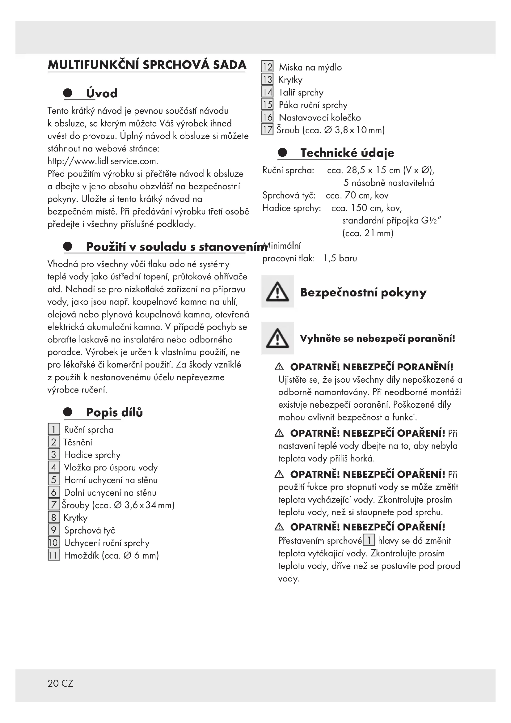 Šroub (cca. Ø 3,8 x 10 mm) Technické údaje Ruční sprcha: cca. 28,5 x 15 cm (V x Ø), 5 násobně nastavitelná Sprchová tyč: cca. 70 cm, kov Hadice sprchy: cca. 150 cm, kov, standardní přípojka G½“ (cca. 21 mm) Minimální pracovní tlak: 1,5 baru Bezpečnostní pokyny Vyhněte se nebezpečí poranění! m OPATRNĚ! NEBEZPEČÍ PORANĚNÍ! Ujistěte se, že jsou všechny díly nepoškozené a odborně namontovány. Při neodborné montáži existuje nebezpečí poranění. Poškozené díly mohou ovlivnit bezpečnost a funkci. m OPATRNĚ! NEBEZPEČÍ OPAŘENÍ! Při nastavení teplé vody dbejte na to, aby nebyla teplota vody příliš horká. m OPATRNĚ! NEBEZPEČÍ OPAŘENÍ! Při použití fukce pro stopnutí vody se může změtit teplota vycházející vody. Zkontrolujte prosím teplotu vody, než si stoupnete pod sprchu. m OPATRNĚ! NEBEZPEČÍ OPAŘENÍ! Přestavením sprchové