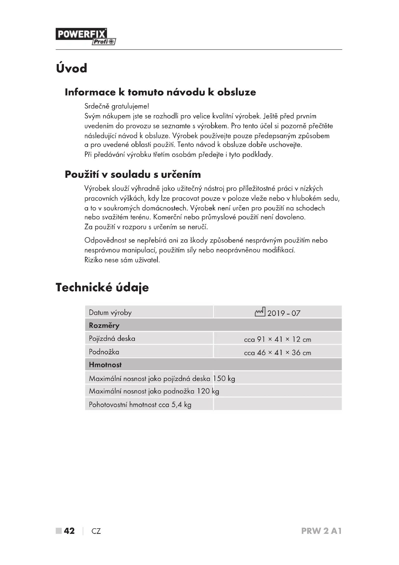CZ PRW 2 A1 Úvod Informace ktomuto návodu kobsluze Srdečně gratulujeme! Svým nákupem jste se rozhodli pro velice kvalitní výrobek. Ještě před prvním uvedením do provozu se seznamte s výrobkem. Pro tento účel si pozorně přečtěte následující návod k obsluze. Výrobek používejte pouze předepsaným způsobem a pro uvedené oblasti použití. Tento návod kobsluze dobře uschovejte. Při předávání výrobku třetím osobám předejte i tyto podklady. Použití vsouladu surčením Výrobek slouží výhradně jako užitečný nástroj pro příležitostné práci v nízkých pracovních výškách, kdy lze pracovat pouze v poloze vleže nebo v hlubokém sedu, a to v soukromých domácnostech. Výrobek není určen pro použití na schodech nebo svažitém terénu. Komerční nebo průmyslové použití není dovoleno. Za použití v rozporu surčením se neručí. Odpovědnost se nepřebírá ani za škody způsobené nesprávným použitím nebo nesprávnou manipulací, použitím síly nebo neoprávněnou modifikací. Riziko nese sám uživatel. Technické údaje Datum výroby 2019 – 07 Rozměry Pojízdná deska cca 91 × 41 × 12 cm Podnožka cca 46 × 41 × 36 cm Hmotnost Maximální nosnost jako pojízdná deska 150 kg Maximální nosnost jako podnožka 120 kg Pohotovostní hmotnost cca 5,4kgCZ