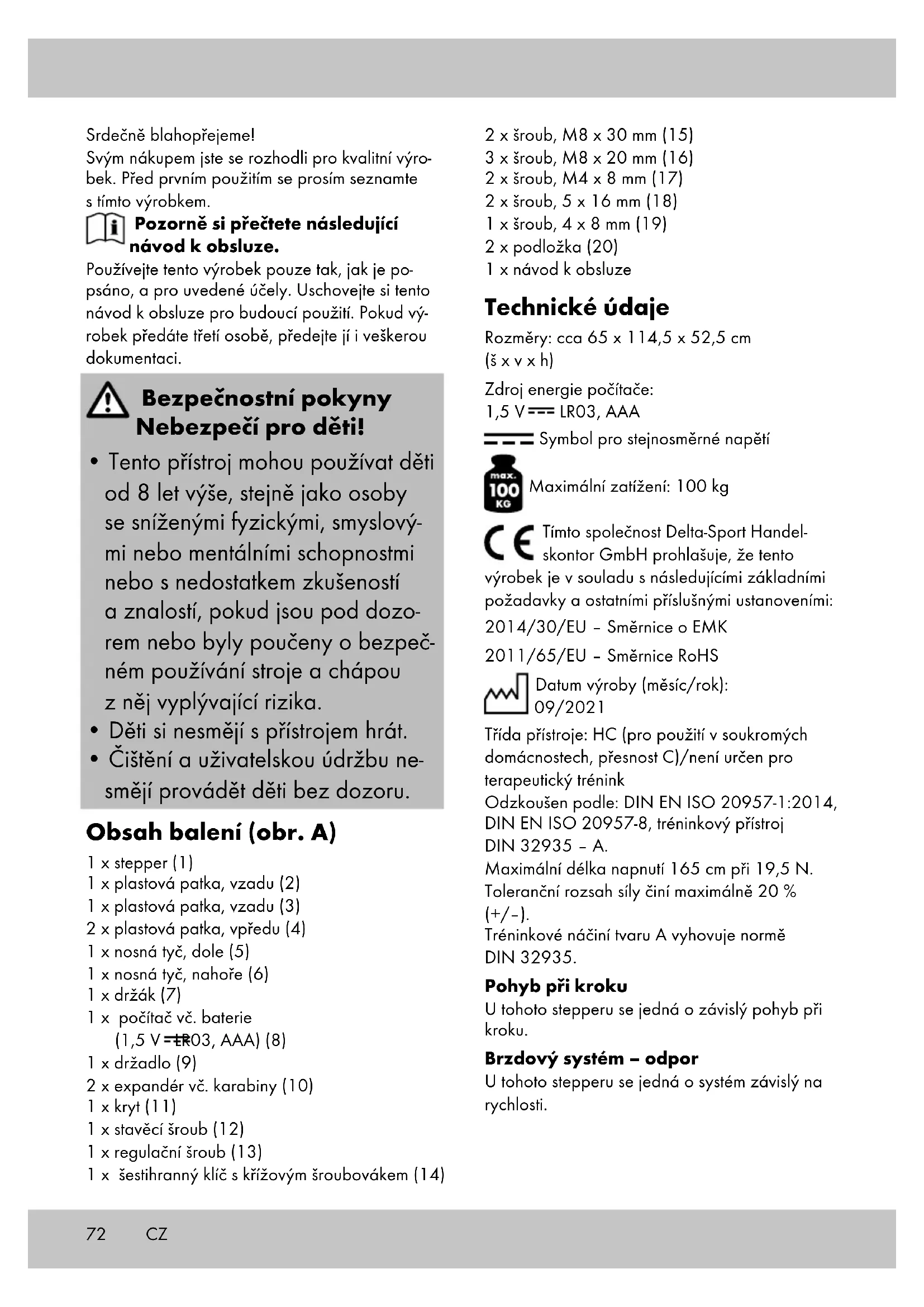 - Čištění a uživatelskou údržbu ne- smějí provádět děti bez dozoru. Obsah balení (obr. A) 1 x stepper (1) 1 x plastová patka, vzadu (2) 1 x plastová patka, vzadu (3) 2 x plastová patka, vpředu (4) 1 x nosná tyč, dole (5) 1 x nosná tyč, nahoře (6) 1 x držák (7) 1 x počítač vč. baterie (1,5 V LR03, AAA) (8) 1 x držadlo (9) 2 x expandér vč. karabiny (10) 1 x kryt (11) 1 x stavěcí šroub (12) 1 x regulační šroub (13) 1 x šestihranný klíč s křížovým šroubovákem (14) 2 x šroub, M8 x 30 mm (15) 3 x šroub, M8 x 20 mm (16) 2 x šroub, M4 x 8 mm (17) 2 x šroub, 5 x 16 mm (18) 1 x šroub, 4 x 8 mm (19) 2 x podložka (20) 1 x návod k obsluze Technické údaje Rozměry: cca 65 x 114,5 x 52,5 cm (š x v x h) Zdroj energie počítače: 1,5 V LR03, AAA Symbol pro stejnosměrné napětí Maximální zatížení: 100 kg Tímto společnost Delta-Sport Handel- skontor GmbH prohlašuje, že tento výrobek je v souladu s následujícími základními požadavky a ostatními příslušnými ustanoveními: 2014/30/EU – Směrnice o EMK 2011/65/EU – Směrnice RoHS Datum výroby (měsíc/rok): 09/2021 Třída přístroje: HC (pro použití v soukromých domácnostech, přesnost C)/není určen pro terapeutický trénink Odzkoušen podle: DIN EN ISO 20957-1:2014, DIN EN ISO 20957-8, tréninkový přístroj DIN 32935 – A. Maximální délka napnutí 165 cm při 19,5 N. Toleranční rozsah síly činí maximálně 20 %
