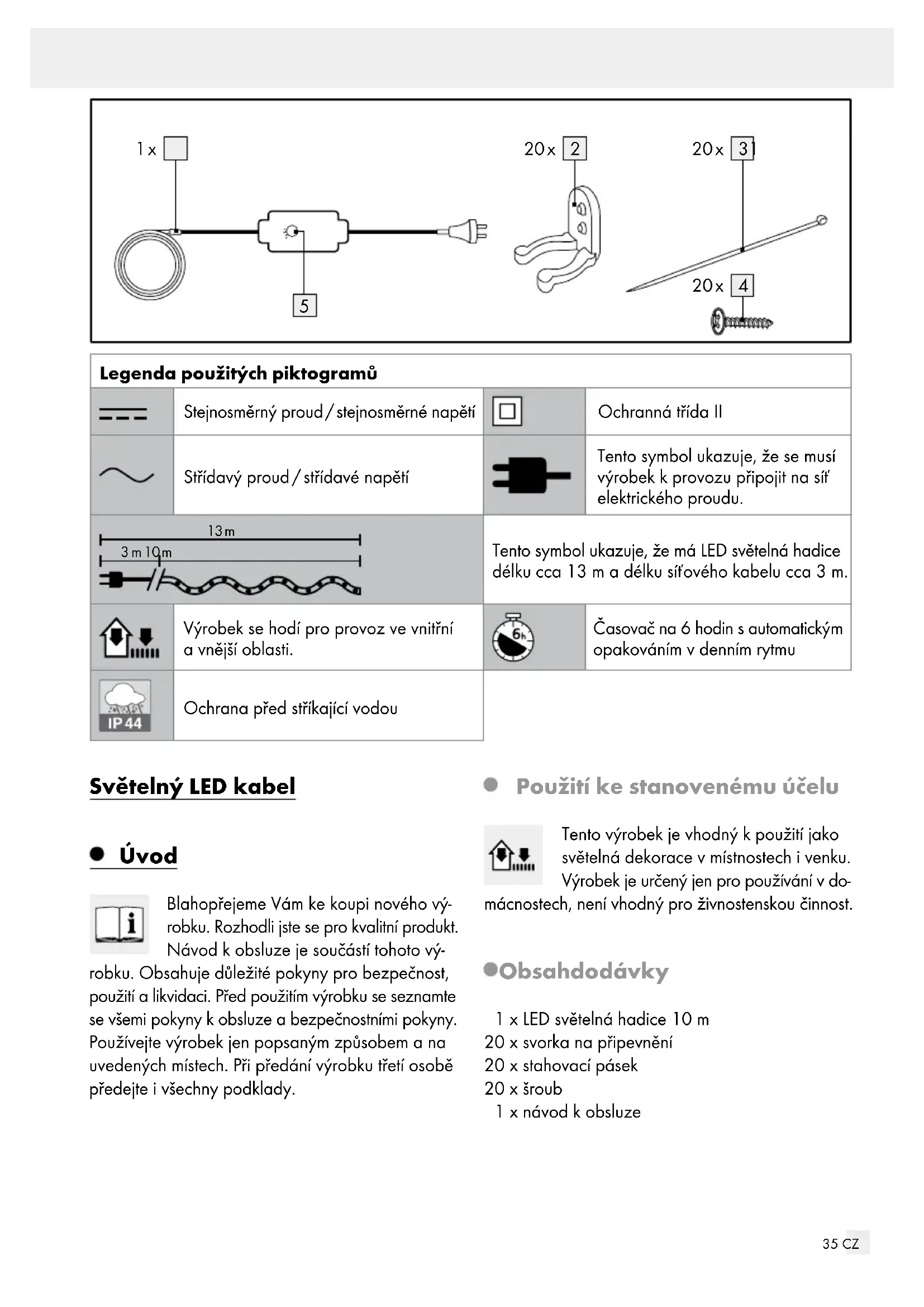 opakováním vdenním rytmu Ochrana před stříkající vodou Světelný LED kabel Úvod Blahopřejeme Vám ke koupi nového vý- robku. Rozhodli jste se pro kvalitní produkt. Návod kobsluze je součástí tohoto vý- robku. Obsahuje důležité pokyny pro bezpečnost, použití a likvidaci. Před použitím výrobku se seznamte se všemi pokyny k obsluze a bezpečnostními pokyny. Používejte výrobek jen popsaným způsobem a na uvedených místech. Při předání výrobku třetí osobě předejte i všechny podklady. Použití ke stanovenému účelu Tento výrobek je vhodný k použití jako světelná dekorace v místnostech i venku. Výrobek je určený jen pro používání vdo- mácnostech, není vhodný pro živnostenskou činnost. Obsah dodávky 1 x LED světelná hadice 10 m 20 x svorka na připevnění 20 x stahovací pásek 20 x šroub 1 x návod k obsluze