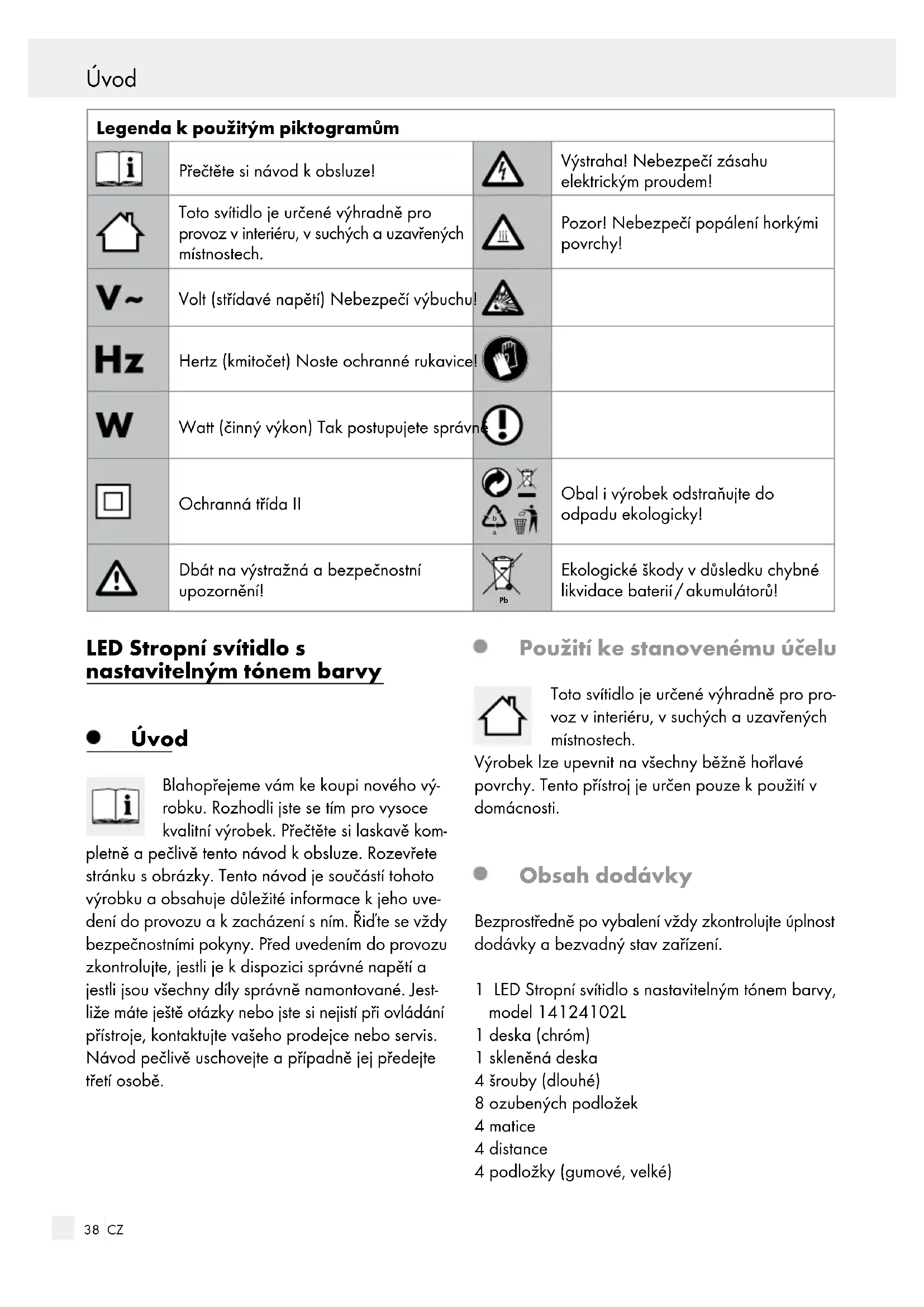 Ekologické škody v důsledku chybné likvidace baterií / akumulátorů! LED Stropní svítidlo s nastavitelným tónem barvy Úvod Blahopřejeme vám ke koupi nového vý- robku. Rozhodli jste se tím pro vysoce kvalitní výrobek. Přečtěte si laskavě kom- pletně a pečlivě tento návod k obsluze. Rozevřete stránku sobrázky. Tento návod je součástí tohoto výrobku a obsahuje důležité informace k jehouve- dení do provozu a kzacházení sním. Řiďte se vždy bezpečnostními pokyny. Před uvedením do provozu zkontrolujte, jestli je kdispozici správné napětí a jestli jsou všechny díly správně namontované. Jest- liže máte ještě otázky nebo jste si nejistí při ovládání přístroje, kontaktujte vašeho prodejce nebo servis. Návod pečlivě uschovejte a případně jej předejte třetí osobě. Použití ke stanovenému účelu Toto svítidlo je určené výhradně pro pro- voz vinteriéru, vsuchých a uzavřených místnostech. Výrobek lze upevnit na všechny běžně hořlavé povrchy. Tento přístroj je určen pouze k použití v domácnosti. Obsah dodávky Bezprostředně po vybalení vždy zkontrolujte úplnost dodávky a bezvadný stav zařízení. 1 LED Stropní svítidlo s nastavitelným tónem barvy, model 14124102L 1 deska (chróm) 1 skleněná deska 4 šrouby (dlouhé) 8 ozubených podložek 4 matice 4 distance 4 podložky (gumové, velké) Úvod / Bezpečnost39 CZ Úvod Úvod / Bezpečnost 4 podložky (gunmové, malé) 4 kloboukových matek 2 šrouby 2 hmoždinky 2 baterie (AAA) 1 dálkové ovládání 1 návod k montáži a obsluze Popis dílů