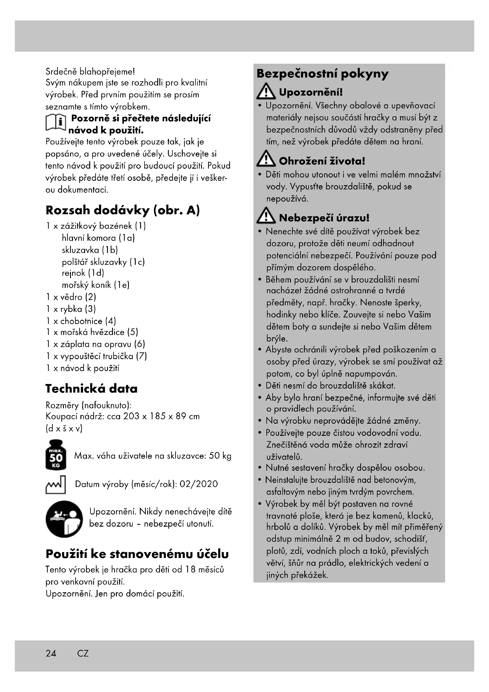 Srdečně blahopřejeme! Svým nákupem jste se rozhodli pro kvalitní výrobek. Před prvním použitím se prosím seznamte s tímto výrobkem. Pozorně si přečtete následující návod k použití. Používejte tento výrobek pouze tak, jak je popsáno, a pro uvedené účely. Uschovejte si tento návod k použití pro budoucí použití. Pokud výrobek předáte třetí osobě, předejte jí i vešker- ou dokumentaci. Rozsah dodávky (obr. A) 1 x zážitkový bazének (1) hlavní komora (1a) skluzavka (1b) polštář skluzavky (1c) rejnok (1d) mořský koník (1e) 1 x vědro (2) 1 x rybka (3) 1 x chobotnice (4) 1 x mořská hvězdice (5) 1 x záplata na opravu (6) 1 x vypouštěcí trubička (7) 1 x návod k použití Technická data Rozměry (nafouknuto): Koupací nádrž: cca 203 x 185 x 89 cm (d x š x v) Max. váha uživatele na skluzavce: 50 kg Datum výroby (měsíc/rok): 02/2020 Upozornění. Nikdy nenechávejte dítě bez dozoru – nebezpečí utonutí. Použití ke stanovenému účelu Tento výrobek je hračka pro děti od 18 měsíců pro venkovní použití. Upozornění. Jen pro domácí použití. Bezpečnostní pokyny Upozornění!