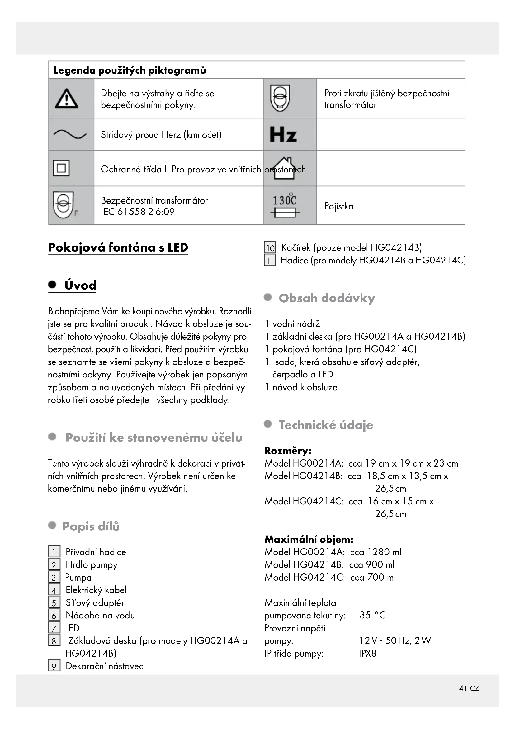 Hadice (pro modely HG04214B a HG04214C) Obsah dodávky 1 vodní nádrž 1základní deska (pro HG00214A a HG04214B) 1 pokojová fontána (pro HG04214C) 1 sada, která obsahuje síťový adaptér, čerpadlo a LED 1návod kobsluze Technické údaje Rozměry: Model HG00214A: cca 19 cm x 19 cm x 23 cm Model HG04214B: cca 18,5 cm x 13,5 cm x 26,5 cm Model HG04214C: cca 16 cm x 15 cm x 26,5 cm Maximální objem: Model HG00214A: cca 1280 ml Model HG04214B: cca 900 ml Model HG04214C: cca 700 ml Maximální teplota pumpované tekutiny: 35 °C Provozní napětí pumpy: 12 V∼ 50 Hz, 2 W IP třída pumpy: IPX842 CZ Osvětlovací prostředky: 4 x LED, 0,06 W, LED nelze vyměnit Vstupní napětí Síťový adaptér: 230–240 V∼, 50 Hz Výstupní napětí Síťový adaptér: 12 V∼ 250 mA Třída ochrany: II / IP třída síťového adaptéru: IP20 Síťový adaptér (model č. MAI-1200250) scertifi- kátem GS. Bezpečnostní pokyny NÁVOD K OBSLUZE SI PEČLIVĚ USCHOVEJTE! PŘI PŘEDÁVÁNÍ VÝROBKU TŘETÍ OSOBĚ PŘEDÁ-