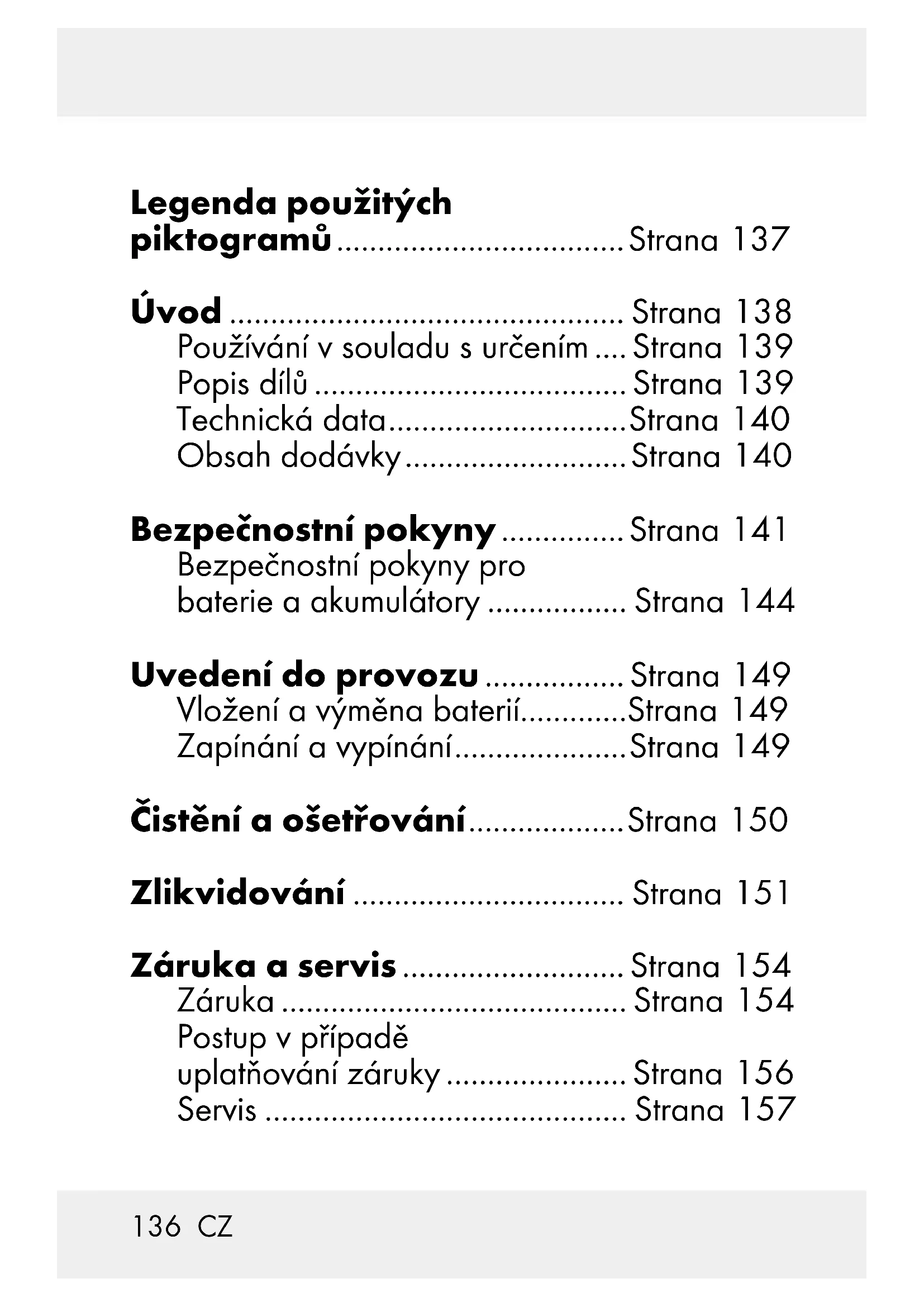 CHU! Nenabíjecí baterie nikdy znovu nenabíjejte. Baterie nebo akumu- látory nezkratujte ani je neoteví- rejte. Hrozí přehřátí, nebezpečí požáru nebo jejich prasknutí. Nikdy neházejte baterie nebo aku- mulátory do ohně ani do vody. Nevystavujte baterie nebo aku- mulátory mechanickému zatížení.146 CZ Nebezpečí vytečení baterií / akumulátorů Zabraňte extrémním podmínkám a teplotám, např. na topení anebo na slunci, které mohou negativně ovlivnit funkci baterií nebo akumulátorů. Vpřípadě vytečení baterií / akumulátorů zabraňte kontaktu chemikálií spokožkou, očima a sliznicemi! Omyjte ihned postižená místa dostatečným množstvím čisté vody a vyhledejte lékařskou pomoc! NOSTE OCHRANNÉ RU- KAVICE! Vyteklé i147 CZ poškozené baterie nebo akumu- látory mohou při kontaktu s po- kožkou způsobit její poleptání. Noste proto vhodné rukavice. V případě vytečení ihned od- straňte baterie nebo akumulátory z výrobku, abyste zabránili jeho poškození! Používejte jen baterie nebo aku- mulátory stejného typu. Nekom- binujte staré baterie nebo akumulátory s novými! Odstraňte baterie nebo akumulá- tory při delším nepoužívání z výrobku.148 CZ Nebezpečí poškození výrobku Používejte jen udaný typ baterie nebo akumulátoru! Nasazujte baterie nebo akumu- látory podle označení polarity (+) a (-) na bateriích nebo aku- mulátorech a na výrobku. Vyčistěte kontakty na baterii / akumulátoru a vpřihrádce na ba- terie před jejich vložením suchou utěrkou, která nepouští vlákna, nebo vatovým tamponem! Vybité baterie nebo akumulátory ihned vyjměte z výrobku.149 CZ Uvedení do provozu Vložení a výměna baterií Viz obr. A. Zapínání a vypínání Spínač