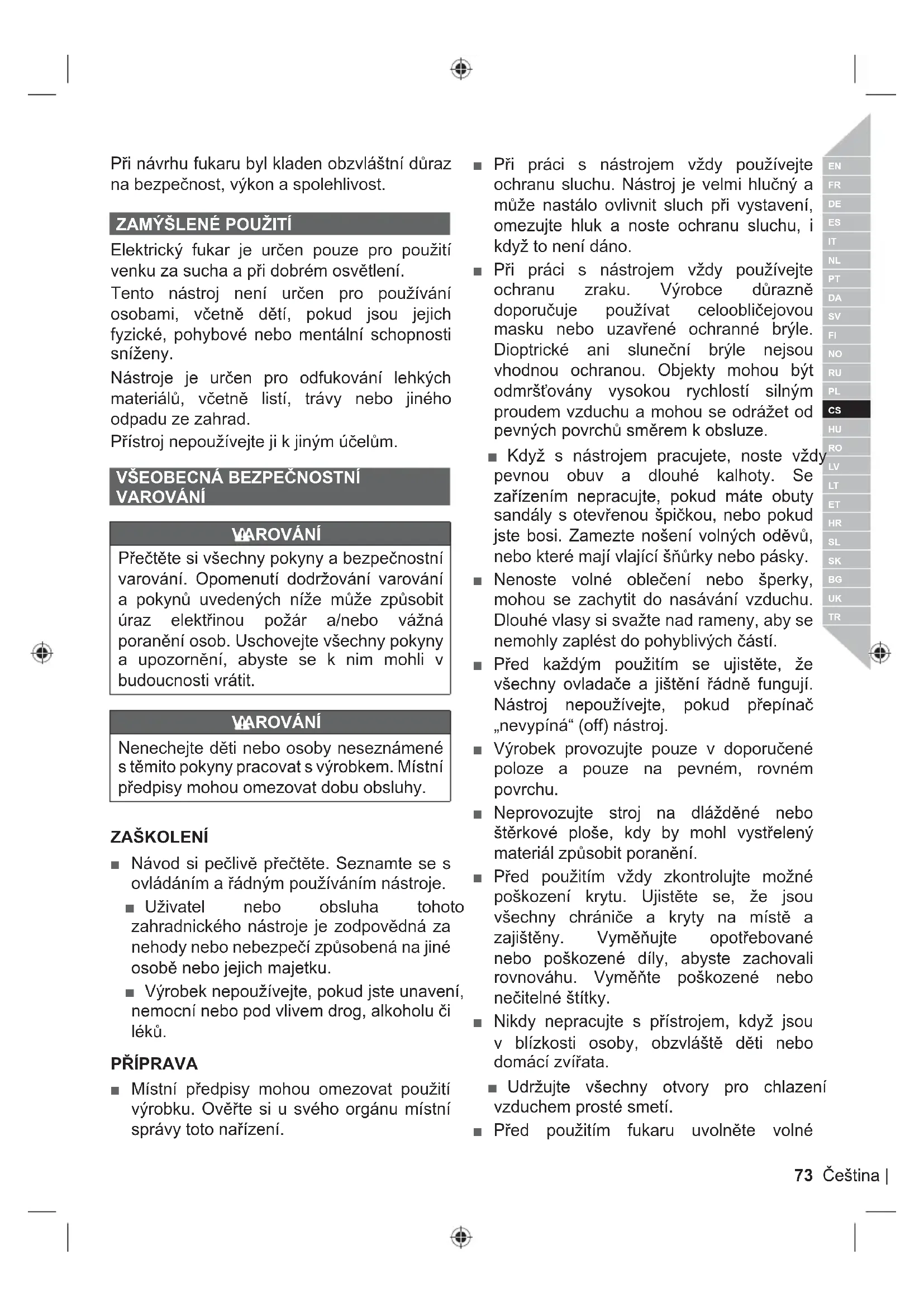 Elektrický fukar je určen pouze pro použití venku za sucha a při dobrém osvětlení. Tento nástroj není určen pro používání osobami, včetně dětí, pokud jsou jejich fyzické, pohybové nebo mentální schopnosti sníženy. Nástroje je určen pro odfukování lehkých materiálů, včetně listí, trávy nebo jiného odpadu ze zahrad. Přístroj nepoužívejte ji k jiným účelům.