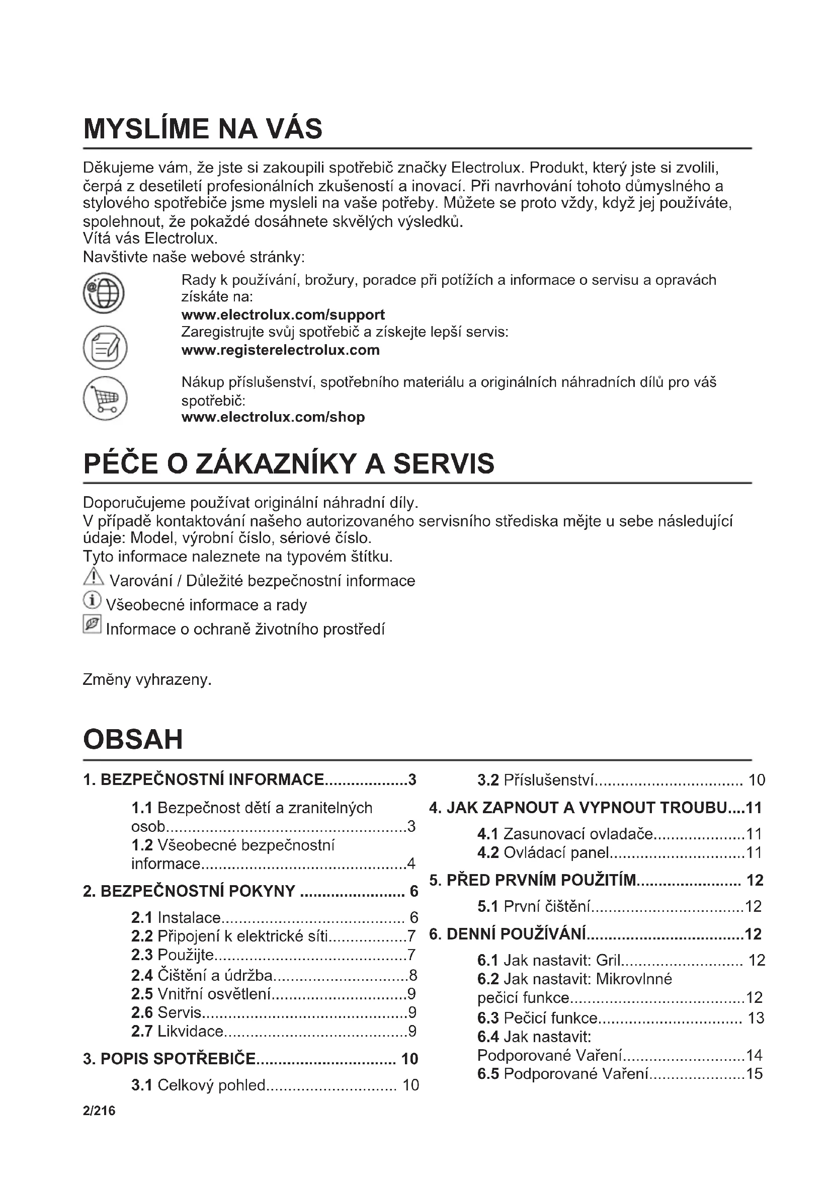 Děkujeme vám, že jste si zakoupili spotřebič značky Electrolux. Produkt, který jste si zvolili, čerpá z desetiletí profesionálních zkušeností a inovací. Při navrhování tohoto důmyslného a stylového spotřebiče jsme mysleli na vaše potřeby. Můžete se proto vždy, když jej používáte, spolehnout, že pokaždé dosáhnete skvělých výsledků. Vítá vás Electrolux. Navštivte naše webové stránky: Rady k používání, brožury, poradce při potížích a informace o servisu a opravách získáte na: www.electrolux.com/support Zaregistrujte svůj spotřebič a získejte lepší servis: www.registerelectrolux.com Nákup příslušenství, spotřebního materiálu a originálních náhradních dílů pro váš spotřebič: www.electrolux.com/shop PÉČE O ZÁKAZNÍKY A SERVIS Doporučujeme používat originální náhradní díly. V případě kontaktování našeho autorizovaného servisního střediska mějte u sebe následující údaje: Model, výrobní číslo, sériové číslo. Tyto informace naleznete na typovém štítku. Varování / Důležité bezpečnostní informace Všeobecné informace a rady Informace o ochraně životního prostředí Zmĕny vyhrazeny. OBSAH