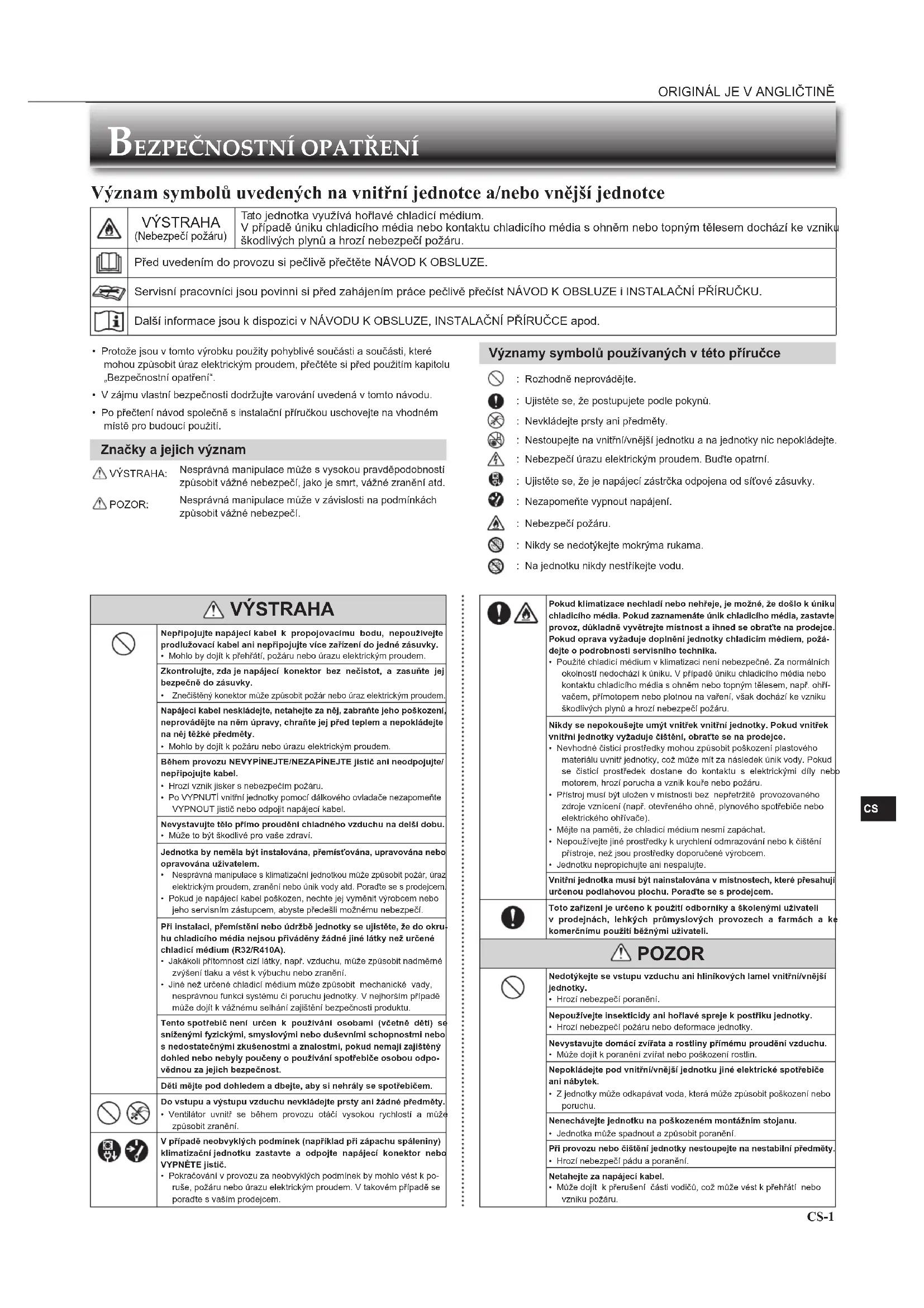 VÝSTRAHA Nepřipojujte napájecí kabel k propojovacímu bodu, nepoužívejte prodlužovací kabel ani nepřipojujte více zařízení do jedné zásuvky.• Mohlo by dojít k přehřátí, požáru nebo úrazu elektrickým proudem.Zkontrolujte, zda je napájecí konektor bez nečistot, a zasuňte jej bezpečně do zásuvky. Znečištěný konektor může způsobit požár nebo úraz elektrickým proudem.Napájecí kabel neskládejte, netahejte za něj, zabraňte jeho poškození, neprovádějte na něm úpravy, chraňte jej před teplem a nepokládejte na něj těžké předměty.• Mohlo by dojít k požáru nebo úrazu elektrickým proudem.Během provozu NEVYPÍNEJTE/NEZAPÍNEJTE jistič ani neodpojujte/nepřipojujte kabel.• Hrozí vznik jisker s nebezpečím požáru.• Po VYPNUTÍ vnitřní jednotky pomocí dálkového ovladače nezapomeňte VYPNOUT jistič nebo odpojit napájecí kabel. Nevystavujte tělo přímo proudění chladného vzduchu na delší dobu.• Může to být škodlivé pro vaše zdraví.Jednotka by neměla být instalována, přemísťována, upravována nebo opravována uživatelem. Nesprávná manipulace s klimatizační jednotkou může způsobit požár, úraz elektrickým proudem, zranění nebo únik vody atd. Poraďte se s prodejcem.• Pokud je napájecí kabel poškozen, nechte jej vyměnit výrobcem nebo jeho servisním zástupcem, abyste předešli možnému nebezpečí.Při instalaci, přemístění nebo údržbě jednotky se ujistěte, že do okru-hu chladicího média nejsou přiváděny žádné jiné látky než určené chladicí médium (R32/R410A).• Jakákoli přítomnost cizí látky, např. vzduchu, může způsobit nadměrné zvýšení tlaku a vést k výbuchu nebo zranění.• Jiné než určené chladicí médium může způsobit mechanické vady, nesprávnou funkci systému či poruchu jednotky. V nejhorším případě může dojít k vážnému selhání zajištění bezpečnosti produktu.Tento spotřebič není určen k používání osobami (včetně dětí) se sníženými fyzickými, smyslovými nebo duševními schopnostmi nebo s nedostatečnými zkušenostmi a znalostmi, pokud nemají zajištěný dohled nebo nebyly poučeny o používání spotřebiče osobou odpo-vědnou za jejich bezpečnost.Děti mějte pod dohledem a dbejte, aby si nehrály se spotřebičem. Do vstupu a výstupu vzduchu nevkládejte prsty ani žádné předměty.• Ventilátor uvnitř se během provozu otáčí vysokou rychlostí a může způsobit zranění. V případě neobvyklých podmínek (například při zápachu spáleniny) klimatizační jednotku zastavte a odpojte napájecí konektor nebo VYPNĚTE jistič.• Pokračování v provozu za neobvyklých podmínek by mohlo vést k po-ruše, požáru nebo úrazu elektrickým proudem. V takovém případě se poraďte s vaším prodejcem.• Protože jsou v tomto výrobku použity pohyblivé součásti a součásti, které mohou způsobit úraz elektrickým proudem, přečtěte si před použitím kapitolu „Bezpečnostní opatření“.• V zájmu vlastní bezpečnosti dodržujte varování uvedená v tomto návodu.• Po přečtení návod společně s instalační příručkou uschovejte na vhodném místě pro budoucí použití. Značky a jejich význam VÝSTRAHA:Nesprávná manipulace může s vysokou pravděpodobností způsobit vážné nebezpečí, jako je smrt, vážné zranění atd. POZOR:Nesprávná manipulace může v závislosti na podmínkách způsobit vážné nebezpečí. Pokud klimatizace nechladí nebo nehřeje, je možné, že došlo k úniku chladicího média. Pokud zaznamenáte únik chladicího média, zastavte provoz, důkladně vyvětrejte místnost a ihned se obraťte na prodejce. Pokud oprava vyžaduje doplnění jednotky chladicím médiem, požá-dejte o podrobnosti servisního technika.• Použité chladicí médium v klimatizaci není nebezpečné. Za normálních okolností nedochází k úniku. V případě úniku chladicího média nebo kontaktu chladicího média s ohněm nebo topným tělesem, např. ohří-vačem, přímotopem nebo plotnou na vaření, však dochází ke vzniku škodlivých plynů a hrozí nebezpečí požáru.Nikdy se nepokoušejte umýt vnitřek vnitřní jednotky. Pokud vnitřek vnitřní jednotky vyžaduje čištění, obraťte se na prodejce.• Nevhodné čisticí prostředky mohou způsobit poškození plastového materiálu uvnitř jednotky, což může mít za následek únik vody. Pokud se čisticí prostředek dostane do kontaktu s elektrickými díly nebo motorem, hrozí porucha a vznik kouře nebo požáru.• Přístroj musí být uložen v místnosti bez nepřetržitě provozovaného zdroje vznícení (např. otevřeného ohně, plynového spotřebiče nebo elektrického ohřívače).• Mějte na paměti, že chladicí médium nesmí zapáchat.• Nepoužívejte jiné prostředky k urychlení odmrazování nebo k čištění přístroje, než jsou prostředky doporučené výrobcem.• Jednotku nepropichujte ani nespalujte.Vnitřní jednotka musí být nainstalována v místnostech, které přesahují určenou podlahovou plochu. Poraďte se s prodejcem.Toto zařízení je určeno k použití odborníky a školenými uživateli v prodejnách, lehkých průmyslových provozech a farmách a ke komerčnímu použití běžnými uživateli. POZOR Nedotýkejte se vstupu vzduchu ani hliníkových lamel vnitřní/vnější jednotky.• Hrozí nebezpečí poranění.Nepoužívejte insekticidy ani hořlavé spreje k postřiku jednotky.• Hrozí nebezpečí požáru nebo deformace jednotky.Nevystavujte domácí zvířata a rostliny přímému proudění vzduchu.• Může dojít k poranění zvířat nebo poškození rostlin.Nepokládejte pod vnitřní/vnější jednotku jiné elektrické spotřebiče ani nábytek.• Z jednotky může odkapávat voda, která může způsobit poškození nebo poruchu.Nenechávejte jednotku na poš