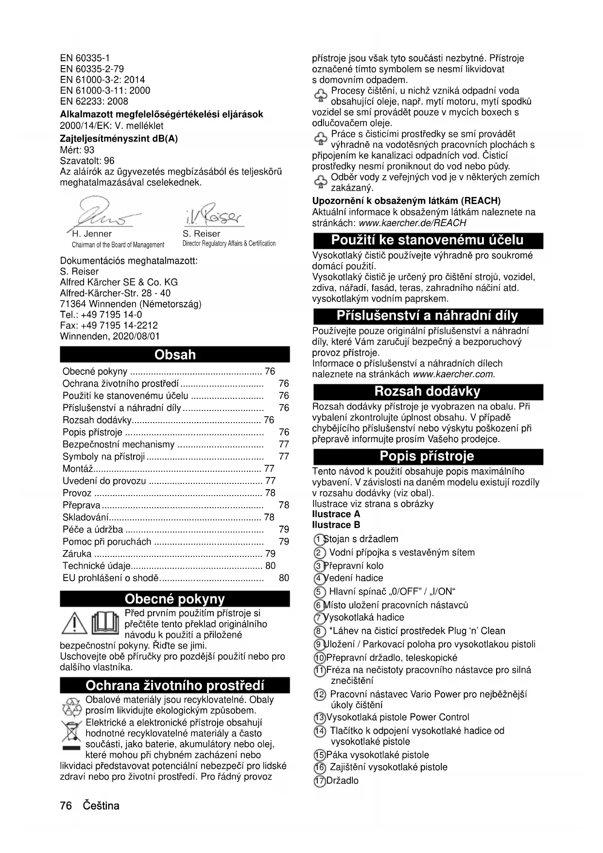 - dB(A) 96 96 K 7 Power Premium Power76 Čeština EN 60335-1 EN 60335-2-79 EN 61000-3-2: 2014 EN 61000-3-11: 2000 EN 62233: 2008 Alkalmazott megfelelőségértékelési eljárások 2000/14/EK: V. melléklet Zajteljesítményszint dB(A) Mért: 93 Szavatolt: 96 Az aláírók az ügyvezetés megbízásából és teljeskörű meghatalmazásával cselekednek. Dokumentációs meghatalmazott: S. Reiser Alfred Kärcher SE & Co. KG Alfred-Kärcher-Str. 28 - 40 71364 Winnenden (Németország) Tel.: +49 7195 14-0 Fax: +49 7195 14-2212 Winnenden, 2020/08/01 Obsah Obecné pokyny Před prvním použitím přístroje si přečtěte tento překlad originálního návodu k použití a přiložené bezpečnostní pokyny. Řiďte se jimi. Uschovejte obě příručky pro pozdější použití nebo pro dalšího vlastníka. Ochrana životního prostředí Obalové materiály jsou recyklovatelné. Obaly prosím likvidujte ekologickým způsobem. Elektrické a elektronické přístroje obsahují hodnotné recyklovatelné materiály a často součásti, jako baterie, akumulátory nebo olej, které mohou při chybném zacházení nebo likvidaci představovat potenciální nebezpečí pro lidské zdraví nebo pro životní prostředí. Pro řádný provoz přístroje jsou však tyto součásti nezbytné. Přístroje označené tímto symbolem se nesmí likvidovat s domovním odpadem. Procesy čištění, u nichž vzniká odpadní voda obsahující oleje, např. mytí motoru, mytí spodků vozidel se smí provádět pouze v mycích boxech s odlučovačem oleje. Práce s čisticími prostředky se smí provádět výhradně na vodotěsných pracovních plochách s připojením ke kanalizaci odpadních vod. Čisticí prostředky nesmí proniknout do vod nebo půdy. Odběr vody z veřejných vod je v některých zemích zakázaný. Upozornění k obsaženým látkám (REACH) Aktuální informace k obsaženým látkám naleznete na stránkách: www.kaercher.de/REACH Použití ke stanovenému účelu Vysokotlaký čistič používejte výhradně pro soukromé domácí použití. Vysokotlaký čistič je určený pro čištění strojů, vozidel, zdiva, nářadí, fasád, teras, zahradního náčiní atd. vysokotlakým vodním paprskem. Příslušenství a náhradní díly Používejte pouze originální příslušenství a náhradní díly, které Vám zaručují bezpečný a bezporuchový provoz přístroje. Informace o příslušenství a náhradních dílech naleznete na stránkách www.kaercher.com. Rozsah dodávky Rozsah dodávky přístroje je vyobrazen na obalu. Při vybalení zkontrolujte úplnost obsahu. V případě chybějícího příslušenství nebo výskytu poškození při přepravě informujte prosím Vašeho prodejce. Popis přístroje Tento návod k použití obsahuje popis maximálního vybavení. V závislosti na daném modelu existují rozdíly v rozsahu dodávky (viz obal). Ilustrace viz strana s obrázky Ilustrace A Ilustrace B 1 Stojan s držadlem 2 Vodní přípojka s vestavěným sítem 3 Přepravní kolo 4 Vedení hadice 5 Hlavní spínač „0/OFF” / „I/ON“ 6 Místo uložení pracovních nástavců 7 Vysokotlaká hadice 8 *Láhev na čisticí prostředek Plug ‘n’ Clean 9 Uložení / Parkovací poloha pro vysokotlakou pistoli 10 Přepravní držadlo, teleskopické 11 Fréza na nečistoty pracovního nástavce pro silná znečištění 12 Pracovní nástavec Vario Power pro nejběžnější úkoly čištění 13 Vysokotlaká pistole Power Control 14 Tlačítko k odpojení vysokotlaké hadice od vysokotlaké pistole 15 Páka vysokotlaké pistole 16 Zajištění vysokotlaké pistole 17 Držadlo Obecné pokyny p. 76