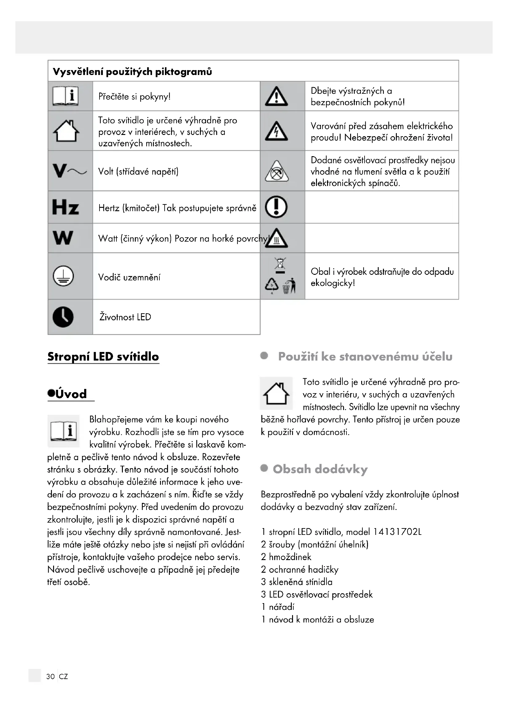 Obal i výrobek odstraňujte do odpadu ekologicky! Životnost LED Stropní LED svítidlo Úvod Blahopřejeme vám ke koupi nového výrobku. Rozhodli jste se tím pro vysoce kvalitní výrobek. Přečtěte si laskavě kom- pletně a pečlivě tento návod k obsluze. Rozevřete stránku sobrázky. Tento návod je součástí tohoto výrobku a obsahuje důležité informace k jehouve- dení do provozu a kzacházení sním. Řiďte se vždy bezpečnostními pokyny. Před uvedením do provozu zkontrolujte, jestli je kdispozici správné napětí a jestli jsou všechny díly správně namontované. Jest- liže máte ještě otázky nebo jste si nejistí při ovládání přístroje, kontaktujte vašeho prodejce nebo servis. Návod pečlivě uschovejte a případně jej předejte třetí osobě. Použití ke stanovenému účelu Toto svítidlo je určené výhradně pro pro- voz vinteriéru, vsuchých a uzavřených místnostech. Svítidlo lze upevnit na všechny běžně hořlavé povrchy. Tento přístroj je určen pouze k použití v domácnosti. Obsah dodávky Bezprostředně po vybalení vždy zkontrolujte úplnost dodávky a bezvadný stav zařízení. 1 stropní LED svítidlo, model 14131702L 2 šrouby (montážní úhelník) 2 hmoždinek 2ochranné hadičky 3 skleněná stínidla 3 LED osvětlovací prostředek 1 nářadí 1 návod k montáži a obsluze31 CZ Úvod / Bezpečnost Úvod Popis dílů