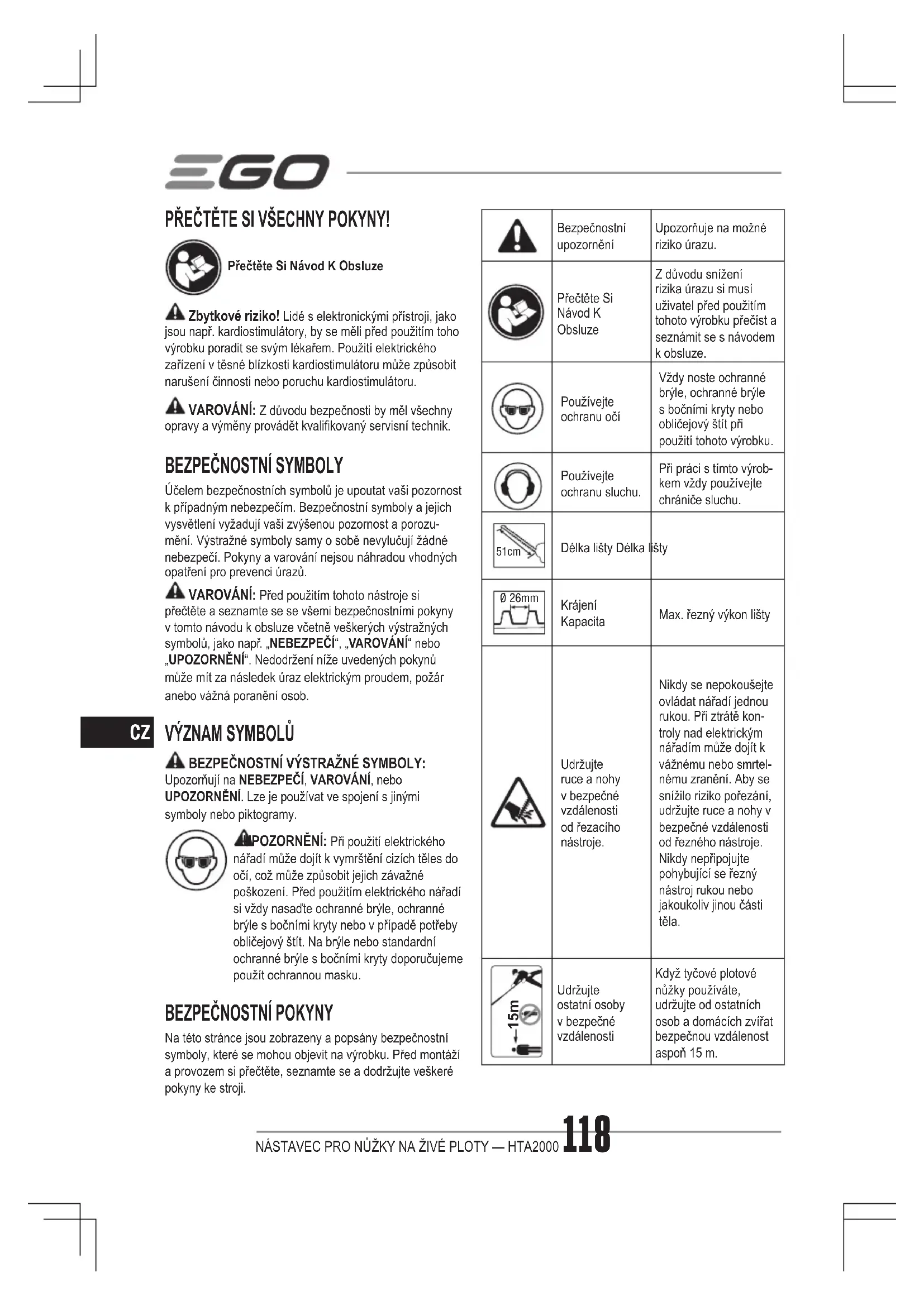Na této stránce jsou zobrazeny a popsány bezpečnostní symboly, které se mohou objevit na výrobku. Před montáží a provozem si přečtěte, seznamte se a dodržujte veškeré pokyny ke stroji.Bezpečnostní upozorněníUpozorňuje na možné riziko úrazu.Přečtěte Si Návod K ObsluzeZ důvodu snížení rizika úrazu si musí uživatel před použitím tohoto výrobku přečíst a seznámit se s návodem k obsluze.Používejte ochranu očíVždy noste ochranné brýle, ochranné brýle s bočními kryty nebo obličejový štít při použití tohoto výrobku.Používejte ochranu sluchu.Při práci s tímto výrob-kem vždy používejte chrániče sluchu. 51cm Délka lišty Délka lištyØ 26mmKrájení KapacitaMax. řezný výkon lištyUdržujte ruce a nohy v bezpečné vzdálenosti od řezacího nástroje.Nikdy se nepokoušejte ovládat nářadí jednou rukou. Při ztrátě kon-troly nad elektrickým nářadím může dojít k vážnému nebo smrtel-nému zranění. Aby se snížilo riziko pořezání, udržujte ruce a nohy v bezpečné vzdálenosti od řezného nástroje. Nikdy nepřipojujte pohybující se řezný nástroj rukou nebo jakoukoliv jinou části těla. 15m Udržujte ostatní osoby v bezpečné vzdálenostiKdyž tyčové plotové nůžky používáte, udržujte od ostatních osob a domácích zvířat bezpečnou vzdálenost aspoň 15 m.NÁSTAVEC PRO NŮŽKY NA ŽIVÉ PLOTY — HTA2000 119
