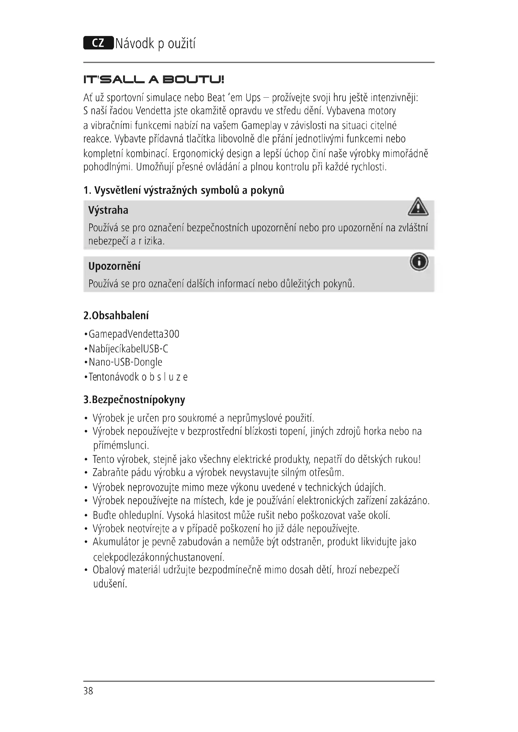 Tímto Hama GmbH &CoKGprohlašuje, že typ rádiového zařízení [00186075] je vsouladu se směrnicí 2014/53/EU.Úplné znění EU prohlášení oshodě je kdispozici na této internetové adrese: www.hama.com->00186075->Downloads. Kmitočtové pásmo/kmitočtová pásma 2400 -2483 MHz Maximální radiofrekvenční výkon vysílaný 0dBm42 Q Návod na obsluhu IT'S ALLABOUT U! Čuužšportové simulácie alebo Beat ‘em Ups –zaži teraz svoju hru ešte intenzívnejšie: Snašou sériou Vendetta budeš ihneď skutočne uprostred. Vybavený motormi a vibračnými funkciami ti teraz podľasituácie ponúkajú citeľné reakcie na tvoju hru. Prídavné tlačidlá si môžeš voľne obsadiť podľaželaní jednotlivými funkciami alebo celými skupinami. Ergonomický dizajn anajlepšie uchopenie robia naše výrobky zvlášť komfortnými .Umožňujú presné ovládanie aplný kontrolu pri každej rýchlosti.