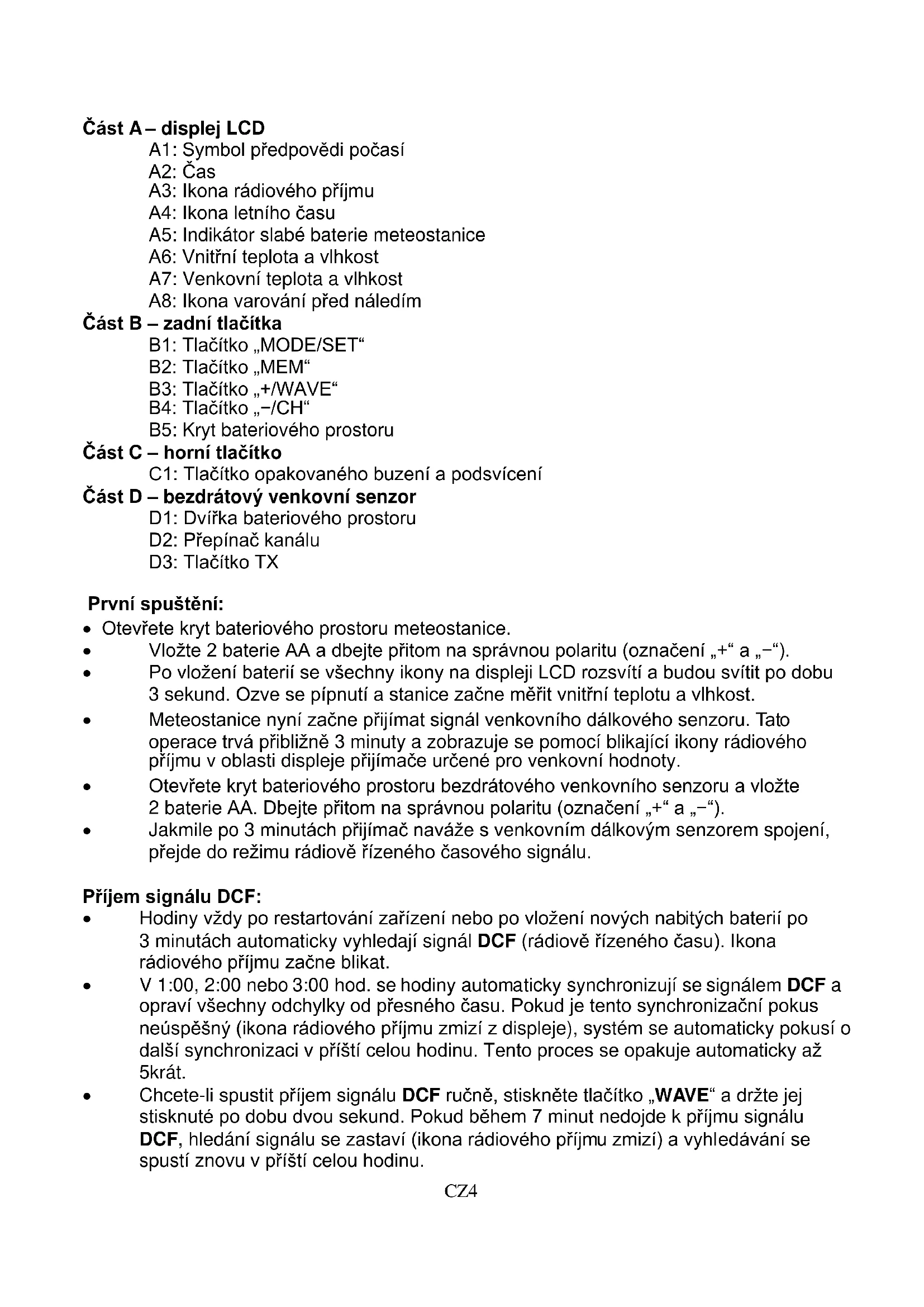 Část A – displej LCD A1: Symbol předpovědi počasí A2: Čas A3: Ikona rádiového příjmu A4: Ikona letního času A5: Indikátor slabé baterie meteostanice A6: Vnitřní teplota a vlhkost A7: Venkovní teplota a vlhkost A8: Ikona varování před náledím Část B – zadní tlačítka B1: Tlačítko „MODE/SET“ B2: Tlačítko „MEM“ B3: Tlačítko „+/WAVE“ B4: Tlačítko „−/CH“ B5: Kryt bateriového prostoru Část C – horní tlačítko C1: Tlačítko opakovaného buzení a podsvícení Část D – bezdrátový venkovní senzor D1: Dvířka bateriového prostoru D2: Přepínač kanálu D3: Tlačítko TX První spuštění: Otevřete kryt bateriového prostoru meteostanice. Vložte 2 baterie AA a dbejte přitom na správnou polaritu (označení „+“ a „−“). Po vložení baterií se všechny ikony na displeji LCD rozsvítí a budou svítit po dobu 3 sekund. Ozve se pípnutí a stanice začne měřit vnitřní teplotu a vlhkost. Meteostanice nyní začne přijímat signál venkovního dálkového senzoru. Tato operace trvá přibližně 3 minuty a zobrazuje se pomocí blikající ikony rádiového příjmu v oblasti displeje přijímače určené pro venkovní hodnoty. Otevřete kryt bateriového prostoru bezdrátového venkovního senzoru a vložte 2 baterie AA. Dbejte přitom na správnou polaritu (označení „+“ a „−“). Jakmile po 3 minutách přijímač naváže s venkovním dálkovým senzorem spojení, přejde do režimu rádiově řízeného časového signálu. Příjem signálu DCF: Hodiny vždy po restartování zařízení nebo po vložení nových nabitých baterií po 3 minutách automaticky vyhledají signál DCF (rádiově řízeného času). Ikona rádiového příjmu začne blikat. V 1:00, 2:00 nebo 3:00 hod. se hodiny automaticky synchronizují se signálem DCF a opraví všechny odchylky od přesného času. Pokud je tento synchronizační pokus neúspěšný (ikona rádiového příjmu zmizí z displeje), systém se automaticky pokusí o další synchronizaci v příští celou hodinu. Tento proces se opakuje automaticky až 5krát. Chcete-li spustit příjem signálu DCF ručně, stiskněte tlačítko „WAVE“ a držte jej stisknuté po dobu dvou sekund. Pokud během 7 minut nedojde k příjmu signálu DCF, hledání signálu se zastaví (ikona rádiového příjmu zmizí) a vyhledávání se spustí znovu v příští celou hodinu.CZ5 Chcete-li během příjmu signálu DCF ukončit vyhledávání rádiového signálu, stiskněte jednou tlačítko „WAVE“. Upozornění: Blikající ikona rádiového příjmu značí, že začal příjem DCF signálu. Souvisle zobrazovaná ikona rádiového příjmu značí, že signál DCF byl úspěšně přijat. Doporučujeme minimální vzdálenost 2,5 metru od všech zdrojů elektromagnetického rušení, jako jsou televize nebo počítačové monitory. Příjem rádiového signál je slabší v pokojích s betonovými zdmi (např. ve sklepích) a v kancelářích. V takovýchto extrémních podmínkách umístěte systém do blízkosti okna. V režimu příjmu signálu DCF je funkční pouze tlačítko opakovaného buzení a podsvícení a tlačítko „WAVE“. Ostatní tlačítka nefungují. Chcete-li použít jiné funkce, ukončete stisknutím tlačítka „WAVE“ režim příjmu signálu DCF. Ruční nastavení času Stiskněte tlačítko „MODE“ a držte jej stisknuté po dobu 2 sekund. Začne blikat jednotka teploty °C. Nyní pomocí tlačítek „+“ a „−“ zvolte mezi jednotkou teploty °C nebo °F. Stisknutím tlačítka „MODE“ potvrďte nastavení. Začne blikat text „12/24HR“. Nyní pomocí tlačítek „+“ a „−“ nastavte 12- nebo 24hodinový režim času. Stisknutím tlačítka „MODE“ potvrďte nastavení. Začne blikat časové pásmo. Nyní pomocí tlačítek „+“ a „−“ nastavte časové pásmo (-12 až +12). Například pro Velkou Británii je časové pásmo −01, pro Německo 00. Stisknutím tlačítka „MODE“ potvrďte nastavení. Začne blikat zobrazení hodin. Nyní nastavte hodiny pomocí tlačítek „+“ a „−“. Stisknutím tlačítka „MODE“ potvrďte nastavení. Začne blikat zobrazení minut. Nyní nastavte minuty pomocí tlačítek „+“ a „−“. Stisknutím tlačítka „MODE“ potvrďte nastavení. Začne blikat zobrazení symbolu předpovědi počasí. Nyní pomocí tlačítek „+“ a „−“ vyberte aktuální symbol předpovědi počasí. Stisknutím tlačítka „MODE“ potvrďte nastavení a ukončete proces nastavování. Stanice poté přejde do normálního režimu. Upozornění: Pokud během 20 sekund nedojde k žádné akci, stanice přejde z režimu nastavování automaticky do režimu normálního zobrazení času. Nastavení budíku: Stiskněte jednou tlačítko „+“. Na displeji LCD se zobrazí ikona „ “ a zapne se funkce budíku. Poté ještě jednou stiskněte tlačítko „+“. Ikona „ “ z displeje zmizí a funkce budíku se vypne. Stiskněte jednou tlačítko „MODE“ a na displeji LCD se zobrazí čas budíku. Poté stiskněte tlačítko „MODE“ a držte jej stisknuté po dobu 2 sekund, dokud nezačnou blikat hodiny v času budíku. Pomocí tlačítek „+“ a „-“ nastavte hodiny. Stisknutím tlačítka „MODE“ potvrďte nastavení. Začnou blikat minuty v času budíku. Pomocí tlačítek „+“ a „−“ nastavte minuty. Stisknutím tlačítka „MODE“ potvrďte nastavení.CZ6 Začne blikat doba pro opakované buzení budíkem. Pomocí tlačítek „+“ a „−“ nastavte požadované minuty. Dobu pro opakované buzení lze nastavit od hodnoty vypnuto do 60 minut. Stisknutím tlačítka „MODE“ potvrďte nastavení a ukončete proces nastavování. Upozornění: Pokud během 20 sekund nedojde k žádné akci, stanice automaticky přejde z režimu nastavování času budíku do režimu normálního zobrazení času. Budík bude z