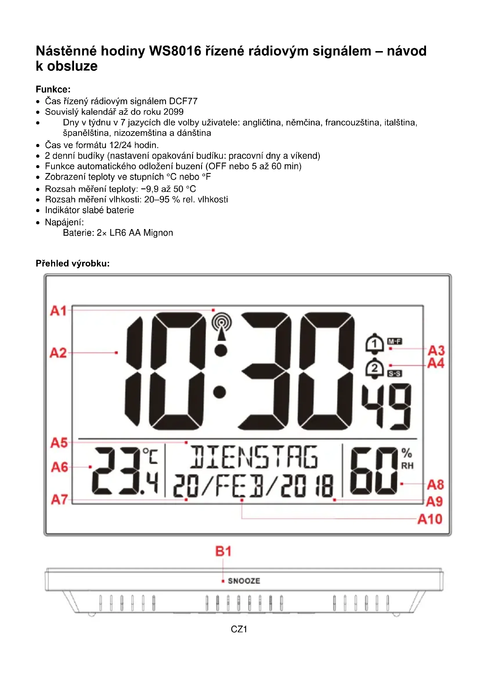 Část A – přední část s displejem LCD A1: Ikona RCC A2: Čas A3: Ikona budíku 1 A4: Ikona budíku 2 A5: Den v týdnu A6: Teplota A7: Datum A8: Vlhkost A9: Rok A10: Měsíc