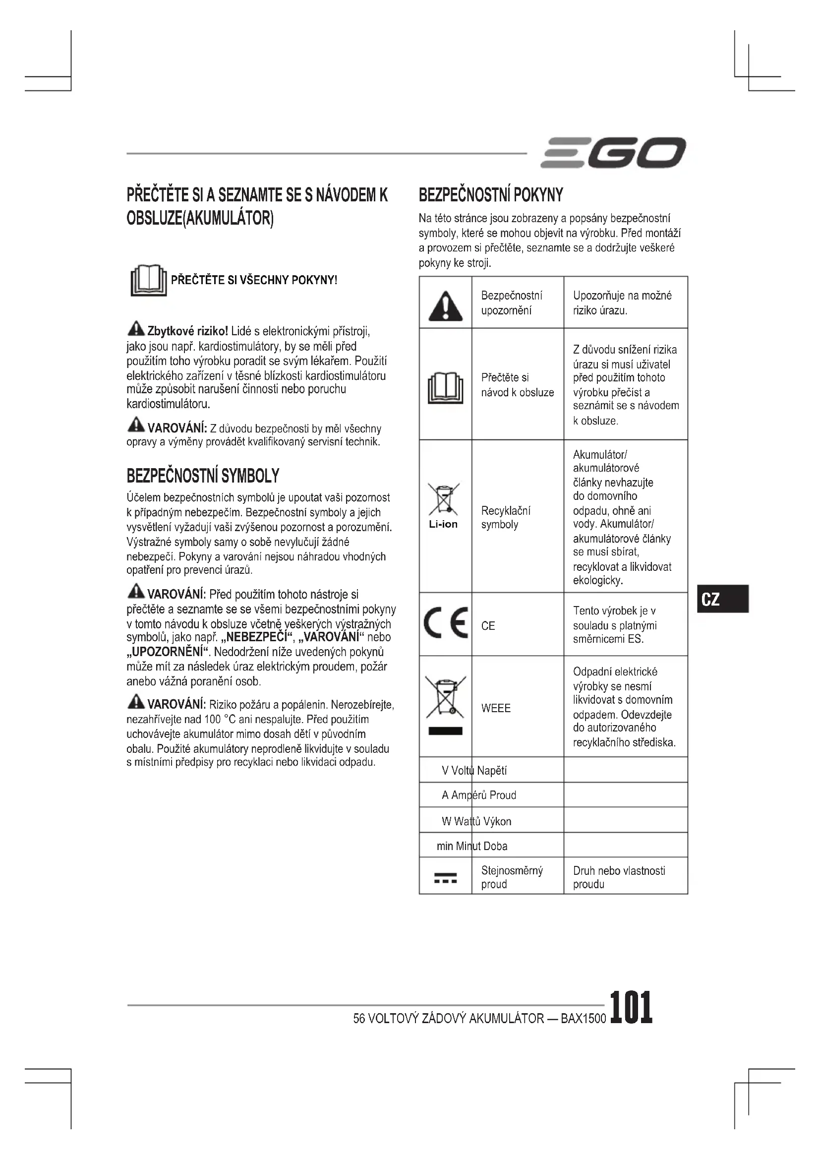 BAX1501 - Baterie EGO - Bezplatný návod k obsluze