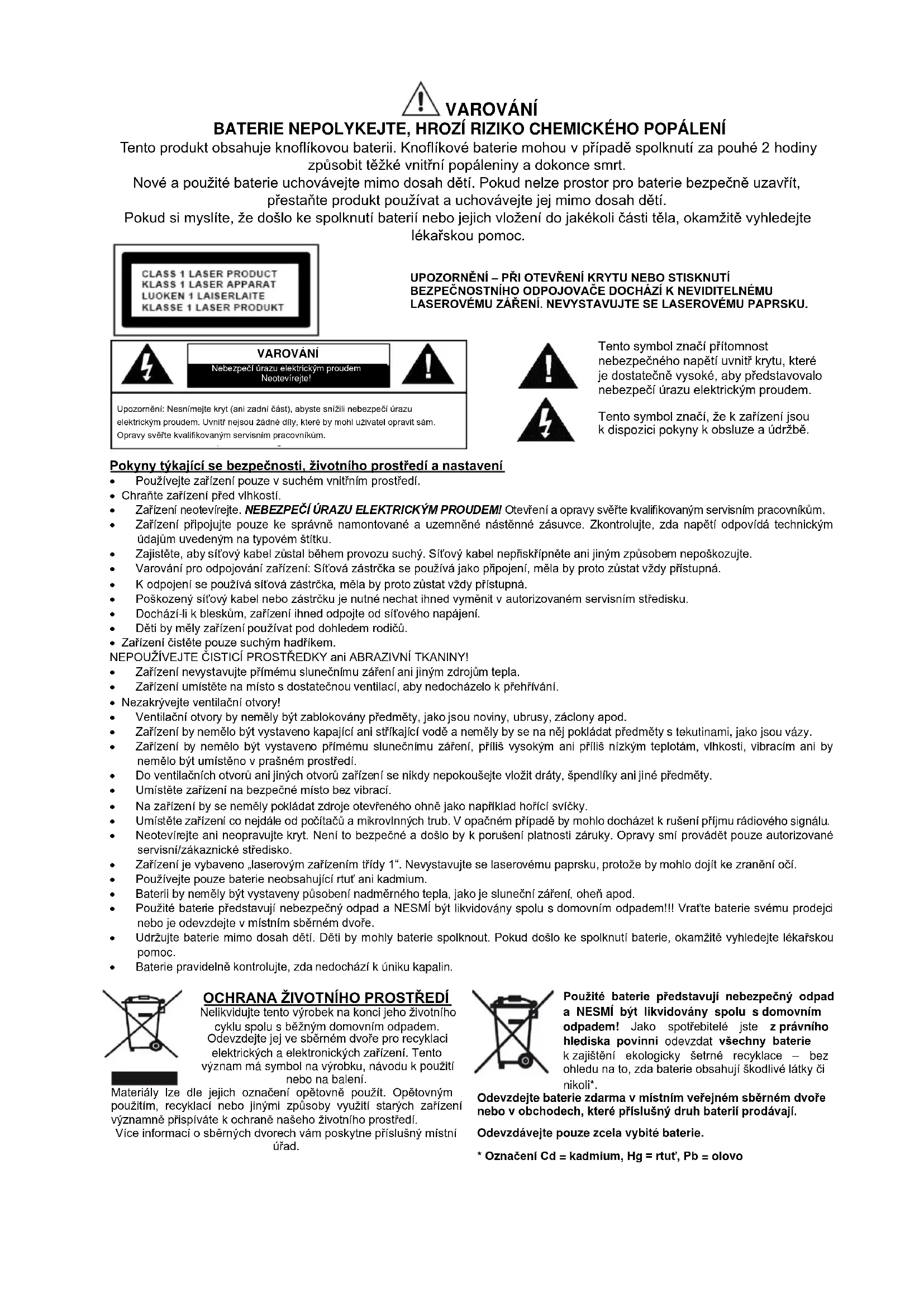 Tento symbol značí, že k zařízení jsou k dispozici pokyny k obsluze a údržbě. Pokyny týkající se bezpečnosti, životního prostředí a nastavení Používejte zařízení pouze v suchém vnitřním prostředí. Chraňte zařízení před vlhkostí. Zařízení neotevírejte. NEBEZPEČÍ ÚRAZU ELEKTRICKÝM PROUDEM! Otevření a opravy svěřte kvalifikovaným servisním pracovníkům. Zařízení připojujte pouze ke správně namontované a uzemněné nástěnné zásuvce. Zkontrolujte, zda napětí odpovídá technickým údajům uvedeným na typovém štítku. Zajistěte, aby síťový kabel zůstal během provozu suchý. Síťový kabel nepřiskřípněte ani jiným způsobem nepoškozujte. Varování pro odpojování zařízení: Síťová zástrčka se používá jako připojení, měla by proto zůstat vždy přístupná. K odpojení se používá síťová zástrčka, měla by proto zůstat vždy přístupná. Poškozený síťový kabel nebo zástrčku je nutné nechat ihned vyměnit v autorizovaném servisním středisku. Dochází-li k bleskům, zařízení ihned odpojte od síťového napájení. Děti by měly zařízení používat pod dohledem rodičů. Zařízení čistěte pouze suchým hadříkem. NEPOUŽÍVEJTE ČISTICÍ PROSTŘEDKY ani ABRAZIVNÍ TKANINY! Zařízení nevystavujte přímému slunečnímu záření ani jiným zdrojům tepla. Zařízení umístěte na místo s dostatečnou ventilací, aby nedocházelo k přehřívání. Nezakrývejte ventilační otvory! Ventilační otvory by neměly být zablokovány předměty, jako jsou noviny, ubrusy, záclony apod. Zařízení by nemělo být vystaveno kapající ani stříkající vodě a neměly by se na něj pokládat předměty s tekutinami, jako jsou vázy. Zařízení by nemělo být vystaveno přímému slunečnímu záření, příliš vysokým ani příliš nízkým teplotám, vlhkosti, vibracím ani by nemělo být umístěno v prašném prostředí. Do ventilačních otvorů ani jiných otvorů zařízení se nikdy nepokoušejte vložit dráty, špendlíky ani jiné předměty. Umístěte zařízení na bezpečné místo bez vibrací. Na zařízení by se neměly pokládat zdroje otevřeného ohně jako například hořící svíčky. Umístěte zařízení co nejdále od počítačů a mikrovlnných trub. V opačném případě by mohlo docházet k rušení příjmu rádiového signálu. Neotevírejte ani neopravujte kryt. Není to bezpečné a došlo by k porušení platnosti záruky. Opravy smí provádět pouze autorizované servisní/zákaznické středisko. Zařízení je vybaveno „laserovým zařízením třídy 1“. Nevystavujte se laserovému paprsku, protože by mohlo dojít ke zranění očí. Používejte pouze baterie neobsahující rtuť ani kadmium. Baterii by neměly být vystaveny působení nadměrného tepla, jako je sluneční záření, oheň apod. Použité baterie představují nebezpečný odpad a NESMÍ být likvidovány spolu s domovním odpadem!!! Vraťte baterie svému prodejci nebo je odevzdejte v místním sběrném dvoře. Udržujte baterie mimo dosah dětí. Děti by mohly baterie spolknout. Pokud došlo ke spolknutí baterie, okamžitě vyhledejte lékařskou pomoc. Baterie pravidelně kontrolujte, zda nedochází k úniku kapalin.