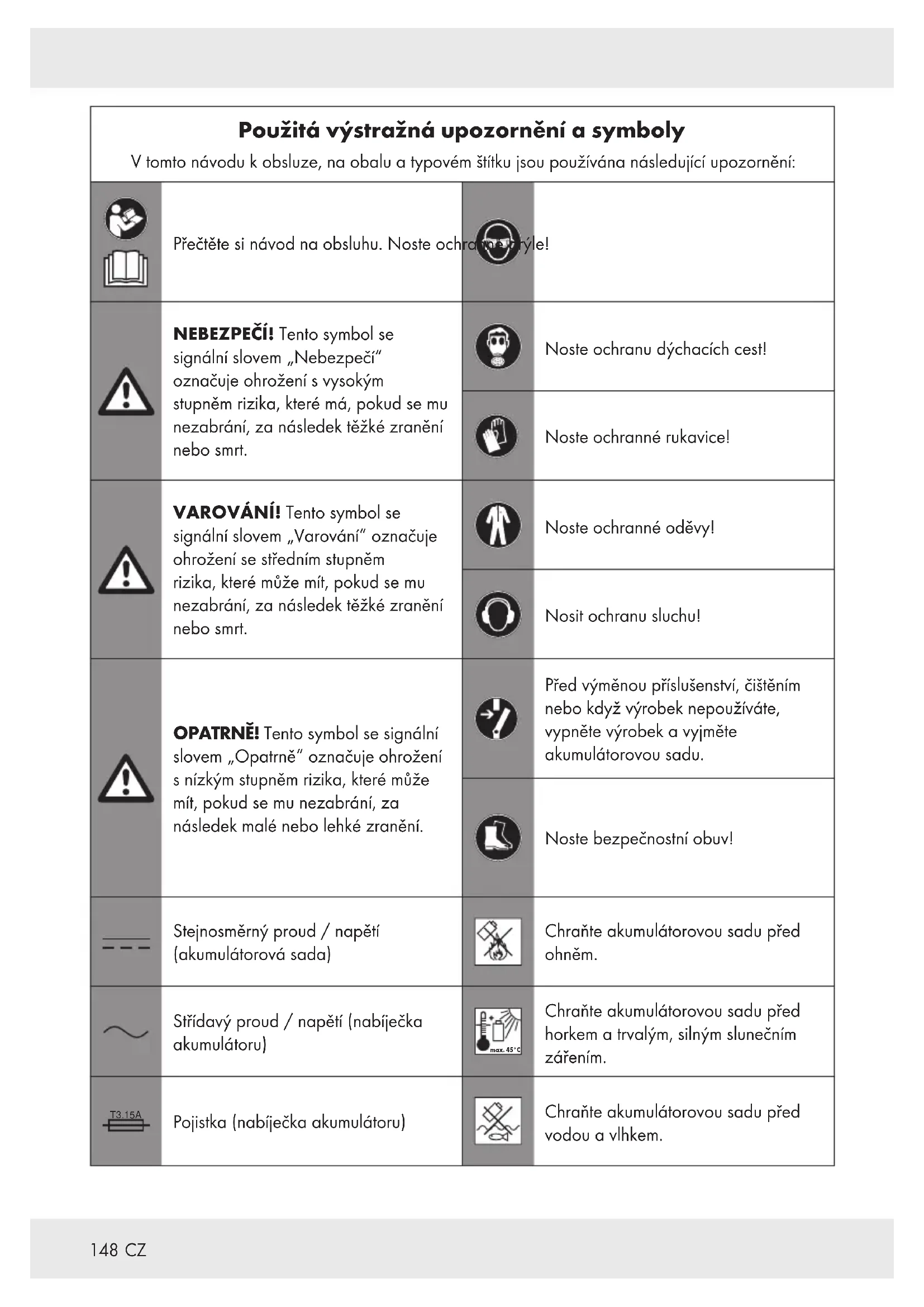 Použitá výstražná upozornění a symboly V tomto návodu k obsluze, na obalu a typovém štítku jsou používána následující upozornění: Přečtěte si návod na obsluhu. Noste ochranné brýle! NEBEZPEČÍ! Tento symbol se signální slovem „Nebezpečí“ označuje ohrožení s vysokým stupněm rizika, které má, pokud se mu nezabrání, za následek těžké zranění nebo smrt. Noste ochranu dýchacích cest! Noste ochranné rukavice! VAROVÁNÍ! Tento symbol se signální slovem „Varování“ označuje ohrožení se středním stupněm rizika, které může mít, pokud se mu nezabrání, za následek těžké zranění nebo smrt. Noste ochranné oděvy! Nosit ochranu sluchu! OPATRNĚ! Tento symbol se signální slovem „Opatrně“ označuje ohrožení s nízkým stupněm rizika, které může mít, pokud se mu nezabrání, za následek malé nebo lehké zranění. Před výměnou příslušenství, čištěním nebo když výrobek nepoužíváte, vypněte výrobek a vyjměte akumulátorovou sadu. Noste bezpečnostní obuv! Stejnosměrný proud / napětí (akumulátorová sada) Chraňte akumulátorovou sadu před ohněm. Střídavý proud / napětí (nabíječka akumulátoru) max. 45°C Chraňte akumulátorovou sadu před horkem a trvalým, silným slunečním zářením. T3.15A Pojistka (nabíječka akumulátoru) Chraňte akumulátorovou sadu před vodou a vlhkem.149