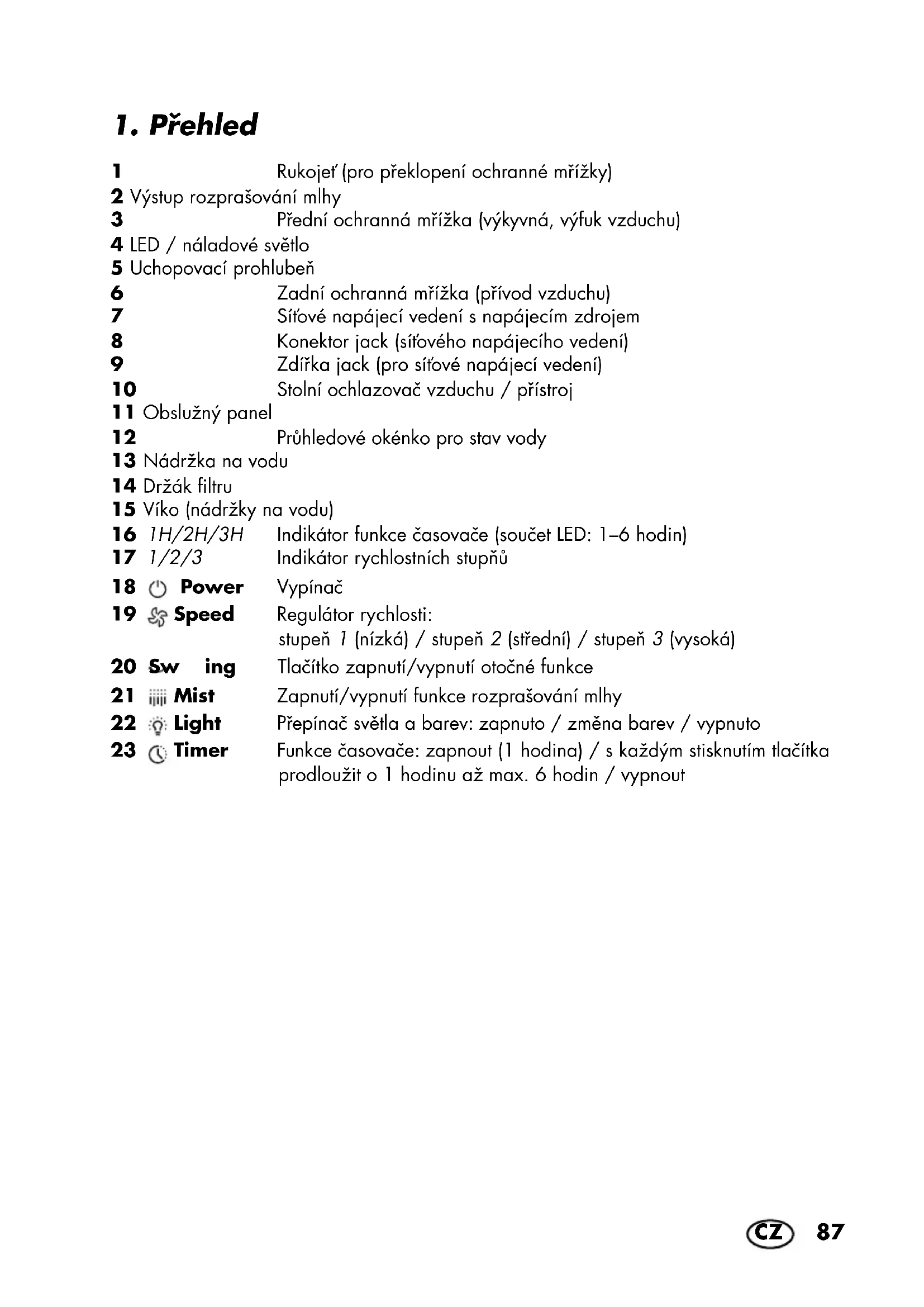 1 Rukojeť (pro překlopení ochranné mřížky) 2 Výstup rozprašování mlhy 3 Přední ochranná mřížka (výkyvná, výfuk vzduchu) 4 LED / náladové světlo 5 Uchopovací prohlubeň 6 Zadní ochranná mřížka (přívod vzduchu) 7 Síťové napájecí vedení s napájecím zdrojem 8 Konektor jack (síťového napájecího vedení) 9 Zdířka jack (pro síťové napájecí vedení) 10 Stolní ochlazovač vzduchu / přístroj 11 Obslužný panel 12 Průhledové okénko pro stav vody 13 Nádržka na vodu 14 Držák filtru 15 Víko (nádržky na vodu) 16 1H/2H/3H Indikátor funkce časovače (součet LED: 1–6 hodin) 17 1/2/3 Indikátor rychlostních stupňů 18 Power Vypínač 19 Speed Regulátor rychlosti: stupeň 1 (nízká) / stupeň 2 (střední) / stupeň 3 (vysoká) 20 Sw ing Tlačítko zapnutí/vypnutí otočné funkce 21 Mist Zapnutí/vypnutí funkce rozprašování mlhy 22 Light Přepínač světla a barev: zapnuto / změna barev / vypnuto 23 Timer Funkce časovače: zapnout (1 hodina) / s každým stisknutím tlačítka prodloužit o 1 hodinu až max. 6 hodin / vypnout __393753_2107_Tischluftkuehler_B8.book Seite 87 Mittwoch, 15. Dezember 2021 9:18 0988