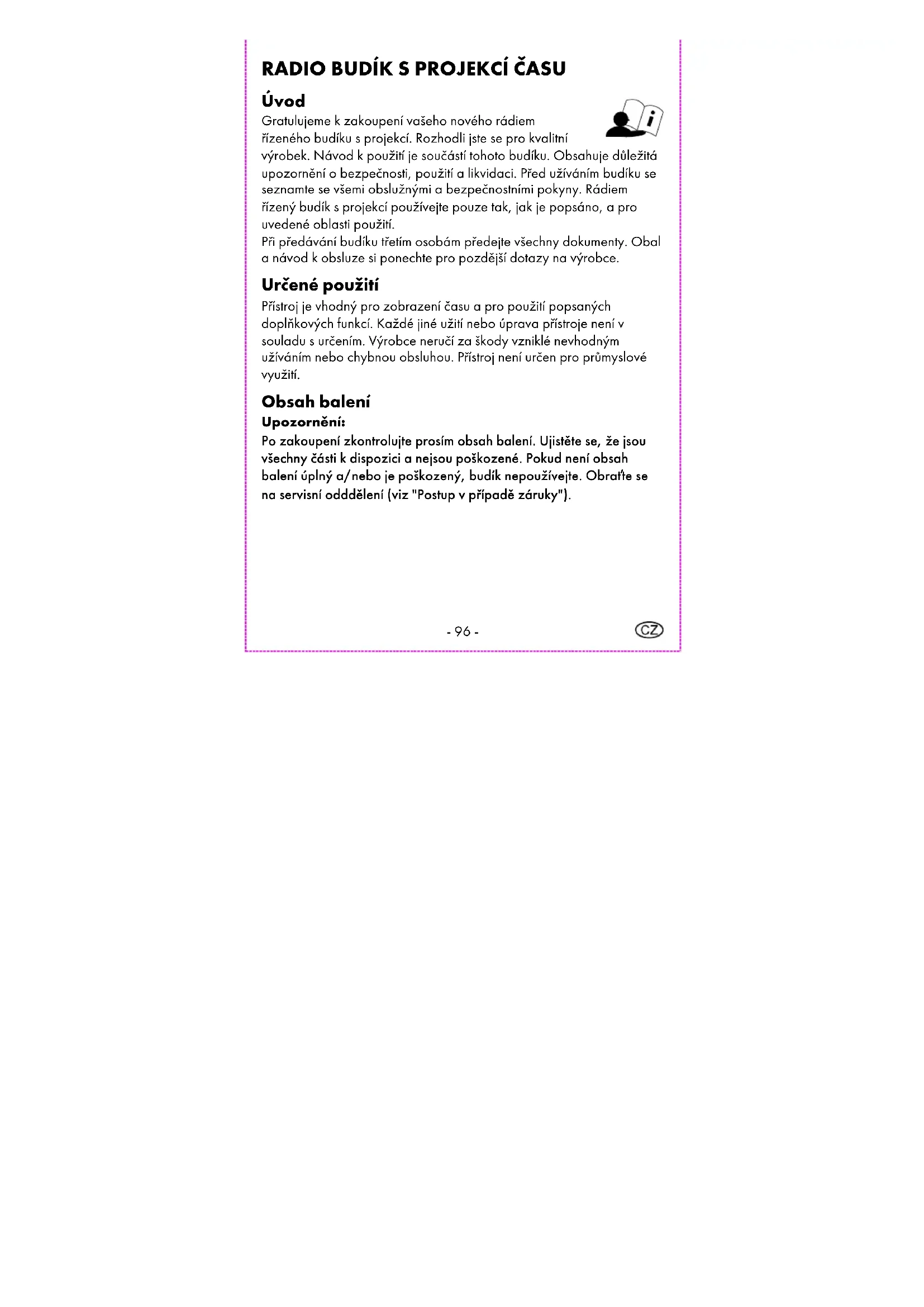Úvod Gratulujeme k zakoupení vašeho nového rádiem řízeného budíku s projekcí. Rozhodli jste se pro kvalitní výrobek. Návod k použití je součástí tohoto budíku. Obsahuje důležitá upozornění o bezpečnosti, použití a likvidaci. Před užíváním budíku se seznamte se všemi obslužnými a bezpečnostními pokyny. Rádiem řízený budík s projekcí používejte pouze tak, jak je popsáno, a pro uvedené oblasti použití. Při předávání budíku třetím osobám předejte všechny dokumenty. Obal a návod k obsluze si ponechte pro pozdější dotazy na výrobce. Určené použití Přístroj je vhodný pro zobrazení času a pro použití popsaných doplňkových funkcí. Každé jiné užití nebo úprava přístroje není v souladu s určením. Výrobce neručí za škody vzniklé nevhodným užíváním nebo chybnou obsluhou. Přístroj není určen pro průmyslové využití. Obsah balení Upozornění: Po zakoupení zkontrolujte prosím obsah balení. Ujistěte se, že jsou všechny části k dispozici a nejsou poškozené. Pokud není obsah balení úplný a/nebo je poškozený, budík nepoužívejte. Obraťte se na servisní odddělení (viz "Postup v případě záruky").- 97 - 1 x rádiem řízený budík s projekcí 1 x síťový adaptér 2 x baterie typu 1,5 V AA LR6 1 x návod k použití Technické údaje Rádiem řízený budík s projekcí Rádiem řízený čas DCF77 Rozměry: cca 130 x 98 x 45 mm Hmotnost: cca 184 g (bez baterií) Vstup: 5,0 V 50 mA, 0,25 W Klimatické podmínky pro skladování: -20 ~ 85 °C Provoz se dvěma bateriemi 1,5 V AA LR6/R6P – označení pro stejnosměrné napětí Provoz se síťovým adaptérem, model: AV35-050-005T Síťový adaptér Model: AV35-050-005T Výrobce: Dongguan Jiayi Electric Co., Ltd. Rozměry: cca 5,8 x 44,7 x 37,6 mm Hmotnost: cca 150 g Délka kabelu: cca 2 m Vstup: 230 - 240 V, ~ 50 Hz Výstup: 5,0 V 50 mA, 0,25 W Průměrná provozní účinnost: 35,07 % Účinnost při malém zatížení (10 %): 27,77 % Spotřeba energie bez zátěže: 0,1 W. Třída ochrany: II Stupeň krytí: IP20- 98 - Vysvětlivky k symbolům