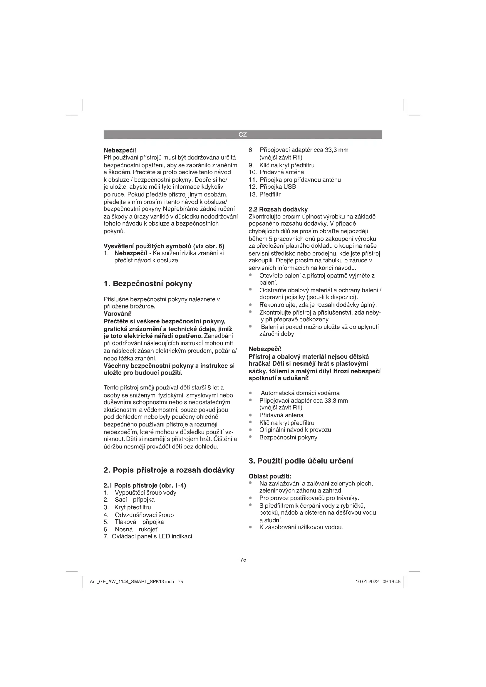 řízení. Dodržujte maximální dopravní výšku, popř. zvolte jiný průměr nebo jinou délku hadic. Motor nenaskočí Chybí síťové napětí Zkontrolujte pojistky a elektrické zapojení. Kolo čerpadla zablokované Skrze kryt ventilátoru otočte pomocí šroubováku hřídelí motoru (uvolněte zaseklé těsnění s třecími kroužky). Tepelný spínač čerpadlo vypne Přehřátí nebo přetížení čerpadla Nechte zařízení ochladit! Teplota dopravované kapa- liny nebo okolního prostředí je příliš vysoká Dávejte pozor na povolenou teplotu dopravované kapaliny. Zajistěte dostatečné chlazení čerpadla. Chod čerpadla nasucho Odstraňte příčinu chodu nasucho. Postupujte podle pokynů v bodě „Čerpadlo nen- asává“. Zabraňte chodu nasucho. Anl_GE_AW_1144_SMART_SPK13.indb 82Anl_GE_AW_1144_SMART_SPK13.indb 82 10.01.2022 09:16:4610.01.2022 09:16:46CZ