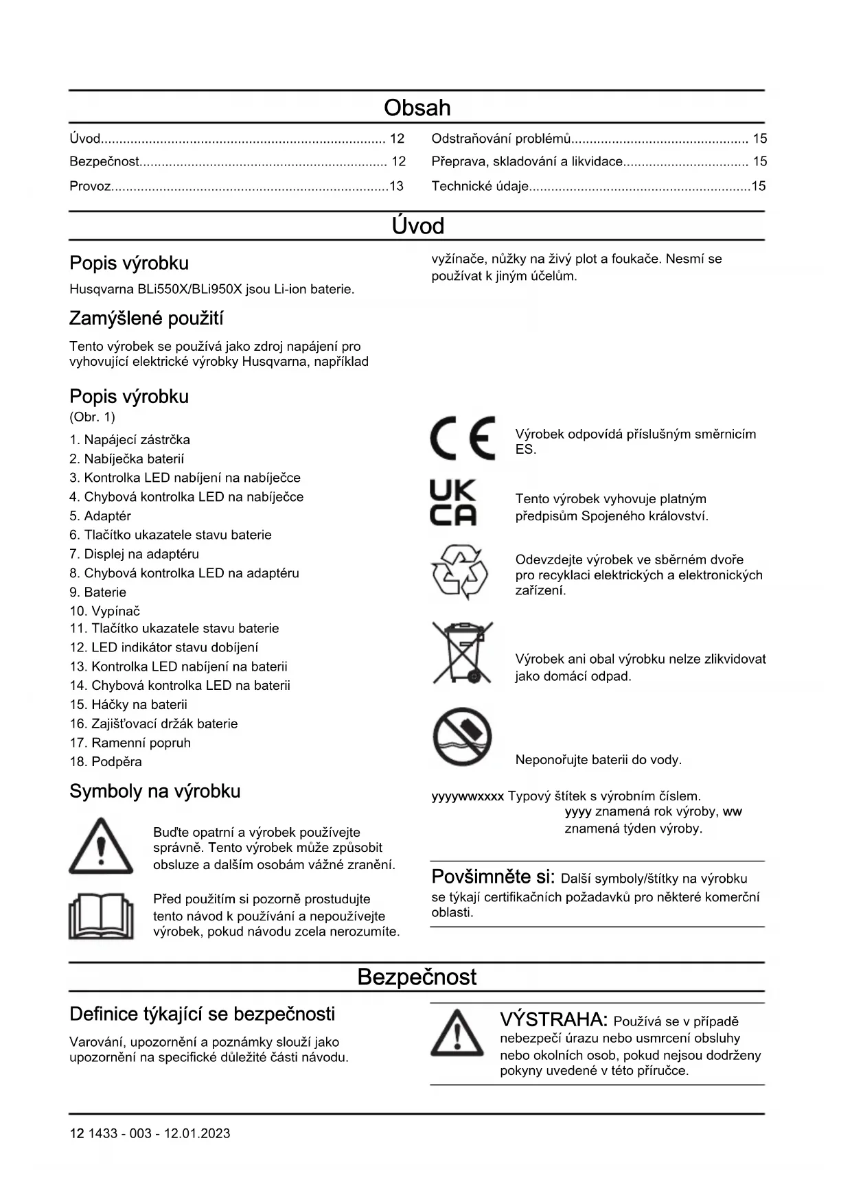 - Технически характеристики За технически характеристики направете справка с типовата табелка на акумулаторната батерия. 1433 - 003 - 12.01.2023 11Obsah Úvod p. 12