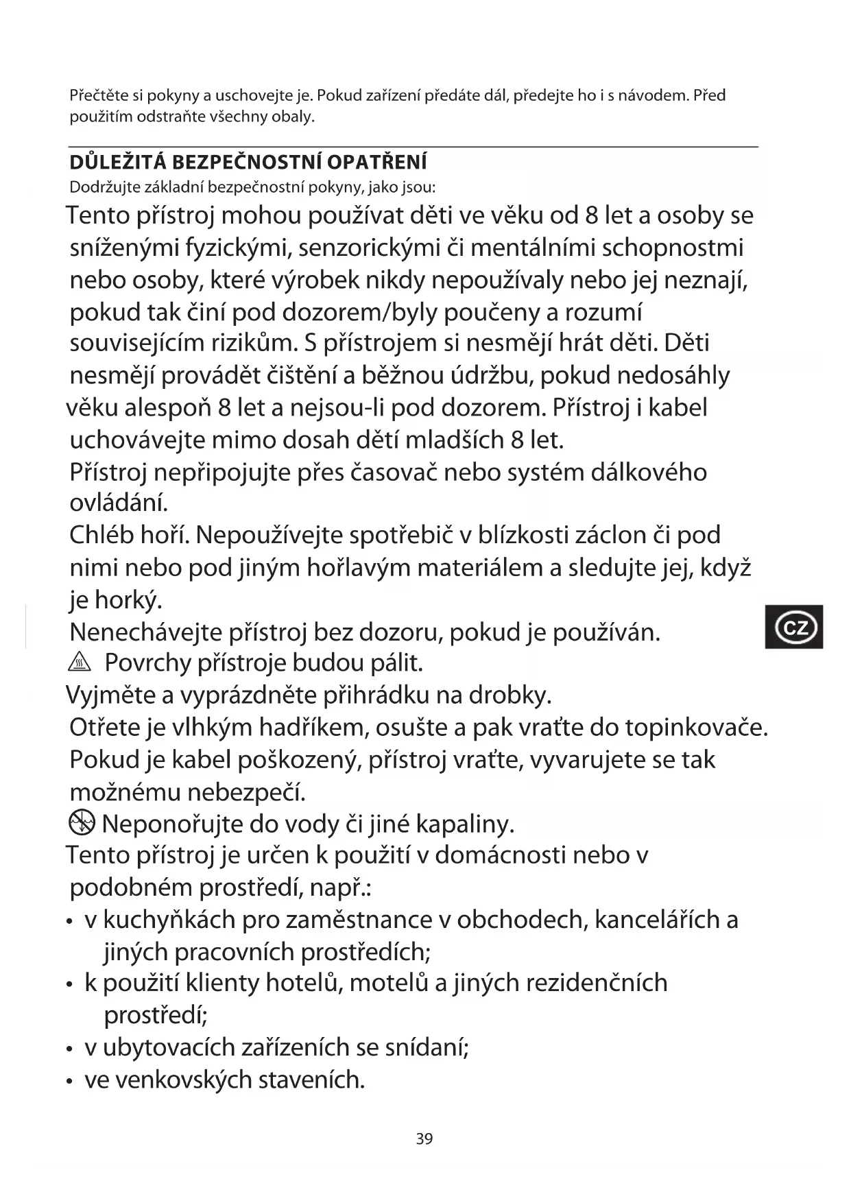 Во избежание воздействия вредных веществ на окружающую среду и здоровье приборы и батареи одноразового или многоразового использования, помеченные одним из этих символов, необходимо утилизировать отдельно от несортированных бытовых отходов. Обязательно утилизируйте электрические и электронные изделия, а также (если это применимо) батареи одноразового или многоразового использования в соответствующих официальных пунктах повторной переработки / сбора отходов.39 Přečtěte si pokyny a uschovejte je. Pokud zařízení předáte dál, předejte ho i s návodem. Před použitím odstraňte všechny obaly. DŮLEŽITÁ BEZPEČNOSTNÍ OPATŘENÍ Dodržujte základní bezpečnostní pokyny, jako jsou: Tento přístroj mohou používat děti ve věku od 8 let a osoby se sníženými fyzickými, senzorickými či mentálními schopnostmi nebo osoby, které výrobek nikdy nepoužívaly nebo jej neznají, pokud tak činí pod dozorem/byly poučeny a rozumí souvisejícím rizikům. S přístrojem si nesmějí hrát děti. Děti nesmějí provádět čištění a běžnou údržbu, pokud nedosáhly věku alespoň 8 let a nejsou-li pod dozorem. Přístroj i kabel uchovávejte mimo dosah dětí mladších 8 let. Přístroj nepřipojujte přes časovač nebo systém dálkového ovládání. Chléb hoří. Nepoužívejte spotřebič v blízkosti záclon či pod nimi nebo pod jiným hořlavým materiálem a sledujte jej, když je horký. Nenechávejte přístroj bez dozoru, pokud je používán. h Povrchy přístroje budou pálit. Vyjměte a vyprázdněte přihrádku na drobky. Otřete je vlhkým hadříkem, osušte a pak vraťte do topinkovače. Pokud je kabel poškozený, přístroj vraťte, vyvarujete se tak možnému nebezpečí. i Neponořujte do vody či jiné kapaliny. Tento přístroj je určen k použití v domácnosti nebo v podobném prostředí, např.: