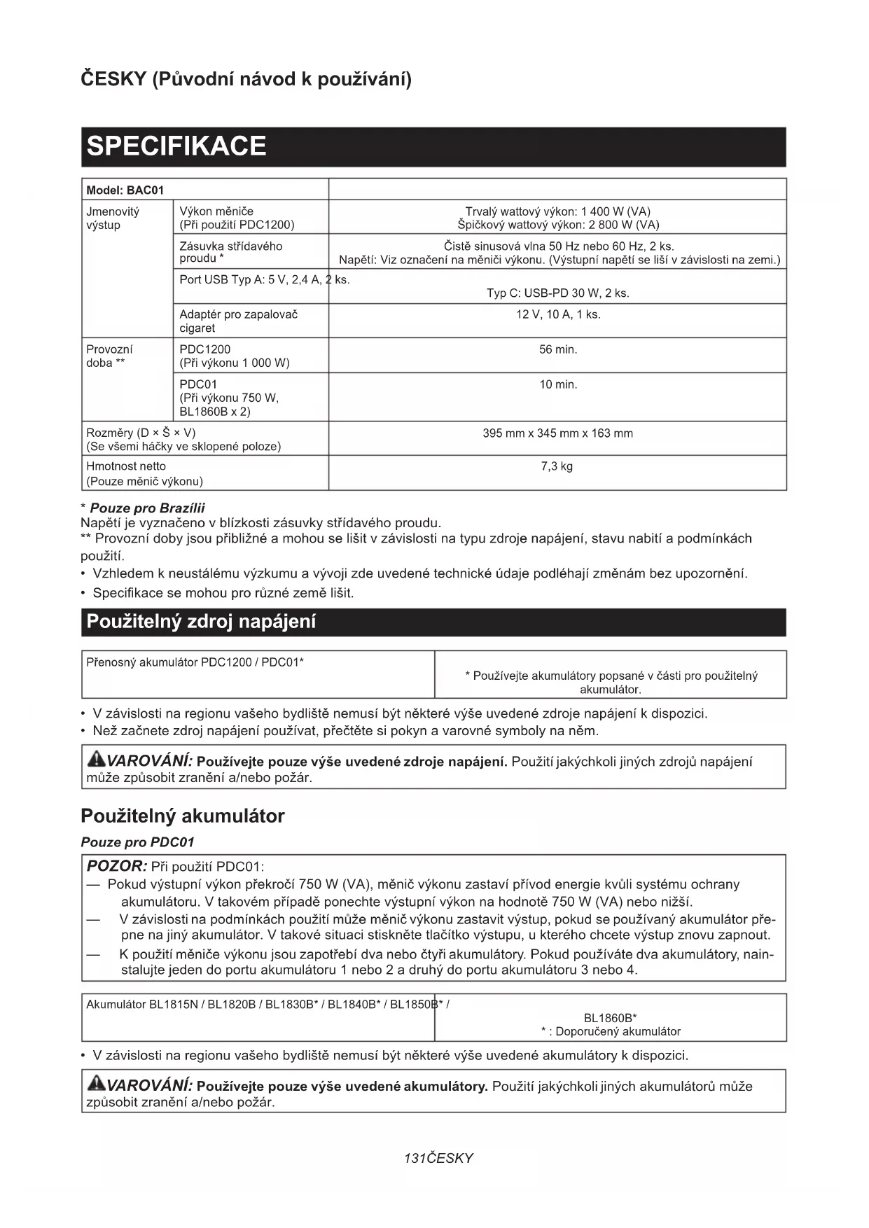 - MAKPAC POZNÁMKA: Niektoré položky zo zoznamu môžu byť súčasťou balenia nástrojov vo forme štandard- ného príslušenstva. Rozsah týchto položiek môže byť v každej krajine odlišný.131 ČESKY ČESKY (Původní návod k používání) SPECIFIKACE Model: BAC01 Jmenovitý výstup Výkon měniče (Při použití PDC1200) Trvalý wattový výkon: 1 400 W (VA) Špičkový wattový výkon: 2 800 W (VA) Zásuvka střídavého proudu * Čistě sinusová vlna 50 Hz nebo 60 Hz, 2 ks. Napětí: Viz označení na měniči výkonu. (Výstupní napětí se liší v závislosti na zemi.) Port USB Typ A: 5 V, 2,4 A, 2 ks. Typ C: USB-PD 30 W, 2 ks. Adaptér pro zapalovač cigaret 12 V, 10 A, 1 ks. Provozní doba ** PDC1200 (Při výkonu 1 000 W) 56 min. PDC01 (Při výkonu 750 W, BL1860B x 2) 10 min. Rozměry (D × Š × V) (Se všemi háčky ve sklopené poloze) 395 mm x 345 mm x 163 mm Hmotnost netto (Pouze měnič výkonu) 7,3 kg