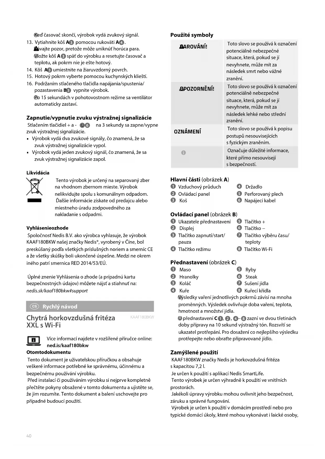 zazní ve dvou třetinách doby přípravy na 10sekund výstražný tón. Rozsvítí se ukazatel protřepání. Pro dosažení co nejlepšího výsledku protřepejte nebo obraťte připravované jídlo. Zamýšlené použití KAAF180BKW značky Nedis je horkovzdušná fritéza s kapacitou 7,2 l. Je určen k použití s aplikací Nedis SmartLife. Tento výrobek je určen výhradně k použití ve vnitřních prostorách. Jakékoli úpravy výrobku mohou ovlivnit jeho bezpečnost, záruku a správné fungování. Výrobek je určen k použití v domácím prostředí nebo pro typické domácí úkoly, které mohou vykonávat i laické osoby, Keď časovač skončí, výrobok vydá zvukový signál.13. Vytiahnite kôš A pomocou rukoväti A