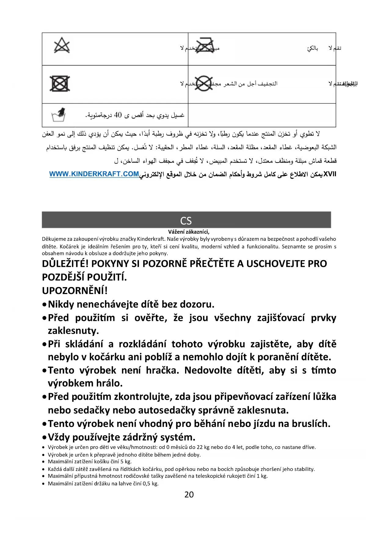 Vážení zákazníci, Děkujeme za zakoupení výrobku značky Kinderkraft. Naše výrobky byly vyrobeny s důrazem na bezpečnost a pohodlí vašeho dítěte. Kočárek je ideálním řešením pro ty, kteří si cení kvalitu, moderní vzhled a funkcionalitu. Seznamte se prosím s obsahem návodu k obsluze a dodržujte jeho pokyny. DŮLEŽITÉ! POKYNY SI POZORNĚ PŘEČTĚTE A USCHOVEJTE PRO POZDĚJŠÍ POUŽITÍ. UPOZORNĚNÍ! Nikdy nenechávejte dítě bez dozoru. Před použitím si ověřte, že jsou všechny zajišťovací prvky zaklesnuty. Při skládání a rozkládání tohoto výrobku zajistěte, aby dítě nebylo v kočárku ani poblíž a nemohlo dojít k poranění dítěte. Tento výrobek není hračka. Nedovolte dítěti, aby si s tímto výrobkem hrálo. Před použitím zkontrolujte, zda jsou připevňovací zařízení lůžka nebo sedačky nebo autosedačky správně zaklesnuta. Tento výrobek není vhodný pro běhání nebo jízdu na bruslích. Vždy používejte zádržný systém. Výrobek je určen pro děti ve věku/hmotnosti: od 0 měsíců do 22 kg nebo do 4 let, podle toho, co nastane dříve. Výrobek je určen k přepravě jednoho dítěte během jedné doby. Maximální zatížení košíku činí 5 kg. Každá další zátěž zavěšená na řídítkách kočárku, pod opěrkou nebo na bocích způsobuje zhoršení jeho stability. Maximální přípustná hmotnost rodičovské tašky zavěšené na teleskopické rukojeti činí 1 kg. Maximální zatížení držáku na lahve činí 0,5 kg. CS21 Při vjezdu na obrubník nebo jiný schod nadzvedněte přední kola. Během vkládání a vytahování dítěte musí být zablokované brzdy. Používejte výhradně části a příslušenství, která jsou dodaná nebo doporučovaná výrobcem. Nepoužívejte jiné části a příslušenství. Výrobek nestavějte poblíž otevřeného ohně nebo jiných zdrojů horka. Nepoužívejte s další plošinou. Pro novorozence doporučujeme použití té nejníže položené pozice opěradla sedátka. Týká se adaptérů na autosedačku