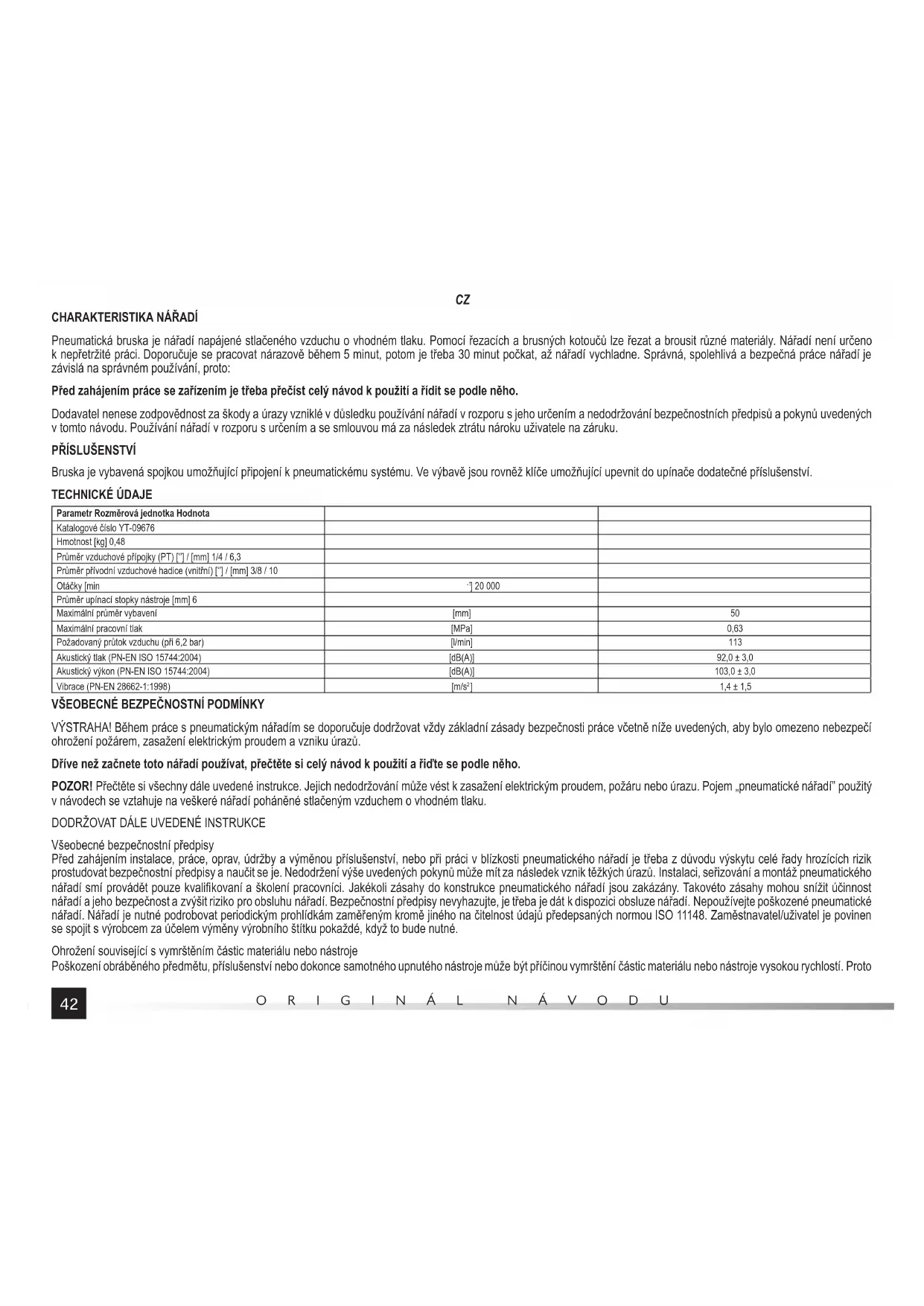 Bruska je vybavená spojkou umožňující připojení k pneumatickému systému. Ve výbavě jsou rovněž klíče umožňující upevnit do upínače dodatečné příslušenství. TECHNICKÉ ÚDAJE Parametr Rozměrová jednotka Hodnota Katalogové číslo YT-09676 Hmotnost [kg] 0,48 Průměr vzduchové přípojky (PT) [‘’] / [mm] 1/4 / 6,3 Průměr přívodní vzduchové hadice (vnitřní) [‘’] / [mm] 3/8 / 10 Otáčky [min
