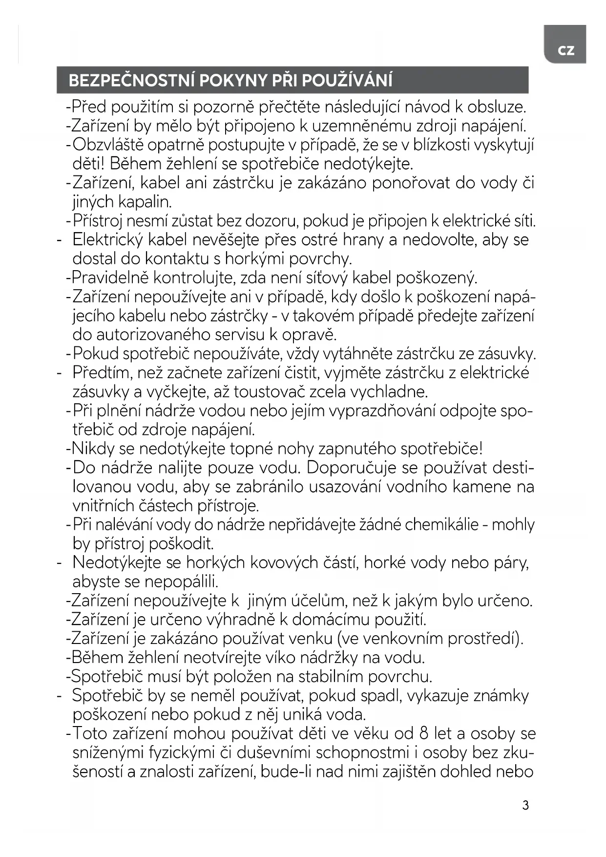 budou poučeny v oblasti bezpečného používání zařízení tak, aby riziko s tímto spojené bylo pro tyto osoby srozumitelné. Děti bez dozoru nesmějí zařízení čistit ani provádět jeho údržbu. - Zařízení i jeho napájecí kabel uchovávejte na místě, které je pro děti do 8 let nedostupné. - Děti si s přístrojem nesmí hrát. - Po skončení žehlení vylijte zbývající vodu z nádržky. - V žádném případě nežehlete oblečení nebo materiály na lidech nebo zvířatech. - Nikdy nesměřujte páru na lidi nebo zvířata. - Zástrčku nevytahujte z elektrické zásuvky taháním za kabel. - Zástrčku nezapojujte do zásuvky mokrýma rukama.