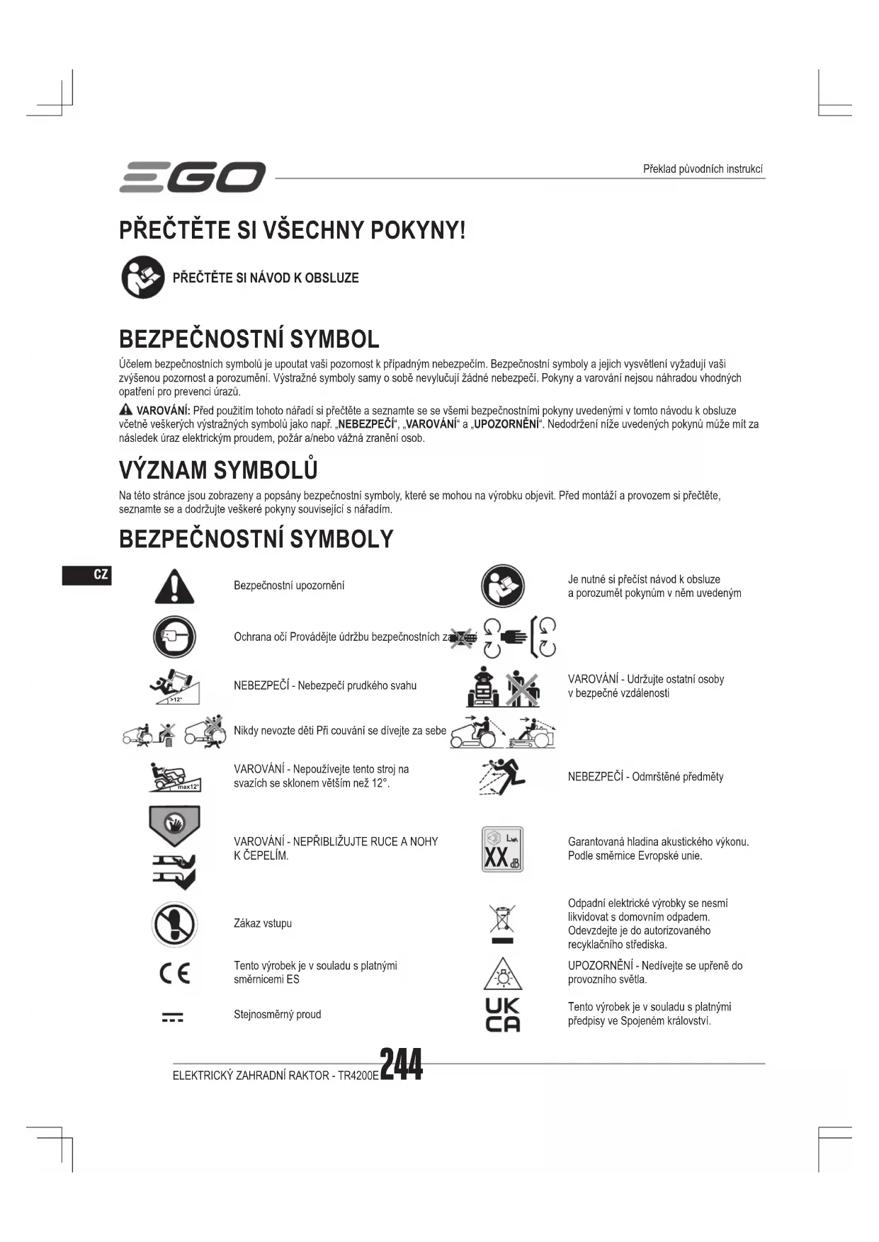 Bezpečnostní upozorněníJe nutné si přečíst návod k obsluze a porozumět pokynům v něm uvedenýmOchrana očí Provádějte údržbu bezpečnostních zařízení>12°NEBEZPEČÍ - Nebezpečí prudkého svahuVAROVÁNÍ - Udržujte ostatní osoby v bezpečné vzdálenostiNikdy nevozte děti Při couvání se dívejte za sebemax12°VAROVÁNÍ - Nepoužívejte tento stroj na svazích se sklonem větším než 12°.NEBEZPEČÍ - Odmrštěné předmětyVAROVÁNÍ - NEPŘIBLIŽUJTE RUCE A NOHY K ČEPELÍM. Garantovaná hladina akustického výkonu. Podle směrnice Evropské unie.Zákaz vstupuOdpadní elektrické výrobky se nesmí likvidovat s domovním odpadem. Odevzdejte je do autorizovaného recyklačního střediska.Tento výrobek je v souladu s platnými směrnicemi ESUPOZORNĚNÍ - Nedívejte se upřeně do provozního světla.Stejnosměrný proudTento výrobek je v souladu s platnými předpisy ve Spojeném království.Překlad původních instrukcí245ELEKTRICKÝ ZAHRADNÍ RAKTOR - TR4200E