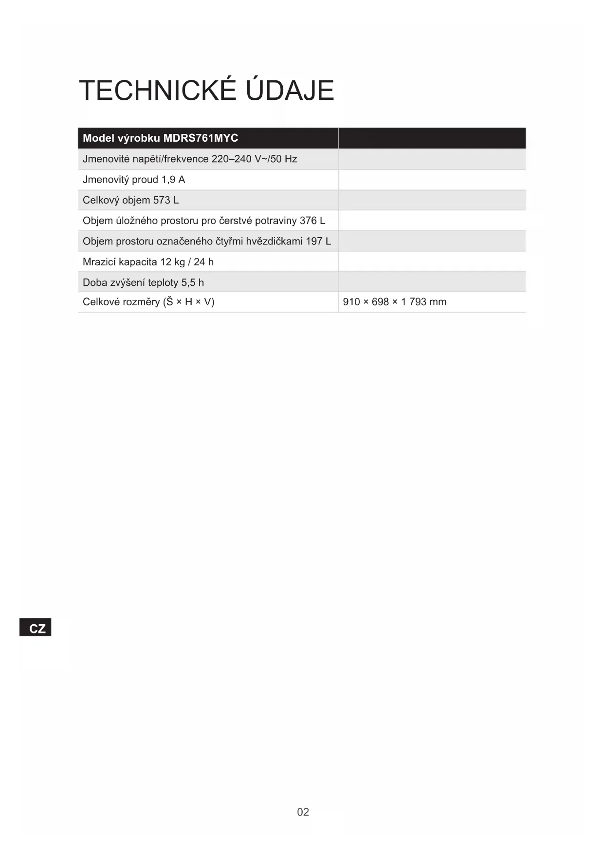 TECHNICKÉ ÚDAJE Model výrobku MDRS761MYC Jmenovité napětí/frekvence 220–240 V~/50 Hz Jmenovitý proud 1,9 A Celkový objem 573 L Objem úložného prostoru pro čerstvé potraviny 376 L Objem prostoru označeného čtyřmi hvězdičkami 197 L Mrazicí kapacita 12 kg / 24 h Doba zvýšení teploty 5,5 h Celkové rozměry (Š × H × V) 910 × 698 × 1 793 mm03