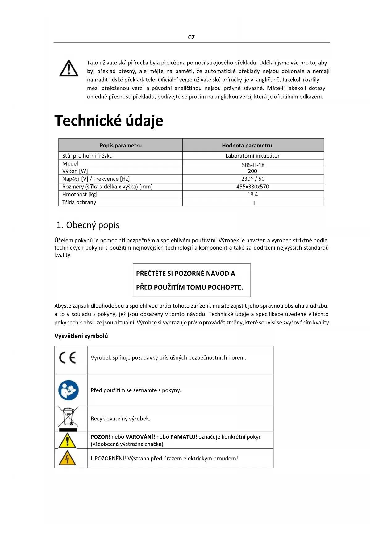 Účelem pokynů je pomoc při bezpečném a spolehlivém používání. Výrobek je navržen a vyroben striktně podle technických pokynů s použitím nejnovějších technologií a komponent a také za dodržení nejvyšších standardů kvality. PŘEČTĚTE SI POZORNĚ NÁVOD A PŘED POUŽITÍM TOMU POCHOPTE. Abyste zajistili dlouhodobou a spolehlivou práci tohoto zařízení, musíte zajistit jeho správnou obsluhu a údržbu, a to v souladu s pokyny, jež jsou obsaženy v tomto návodu. Technické údaje a specifikace uvedené v těchto pokynech k obsluze jsou aktuální. Výrobce si vyhrazuje právo provádět změny, které souvisí se zvyšováním kvality. Vysvětlení symbolů Výrobek splňuje požadavky příslušných bezpečnostních norem. Před použitím se seznamte s pokyny.