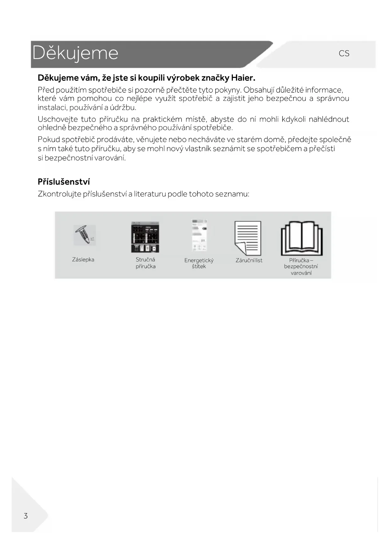Děkujeme vám, že jste si koupili výrobek značky Haier. Před použitím spotřebiče si pozorně přečtěte tyto pokyny. Obsahují důležité informace, které vám pomohou co nejlépe využít spotřebič a zajistit jeho bezpečnou a správnou instalaci, používání a údržbu. Uschovejte tuto příručku na praktickém místě, abyste do ní mohli kdykoli nahlédnout ohledně bezpečného a správného používání spotřebiče. Pokud spotřebič prodáváte, věnujete nebo necháváte ve starém domě, předejte společně s ním také tuto příručku, aby se mohl nový vlastník seznámit se spotřebičem a přečísti si bezpečnostní varování. Příslušenství Zkontrolujte příslušenství a literaturu podle tohoto seznamu: Záslepka Stručná příručka Energetický štítek Záruční list Příručka – bezpečnostní varováníCS