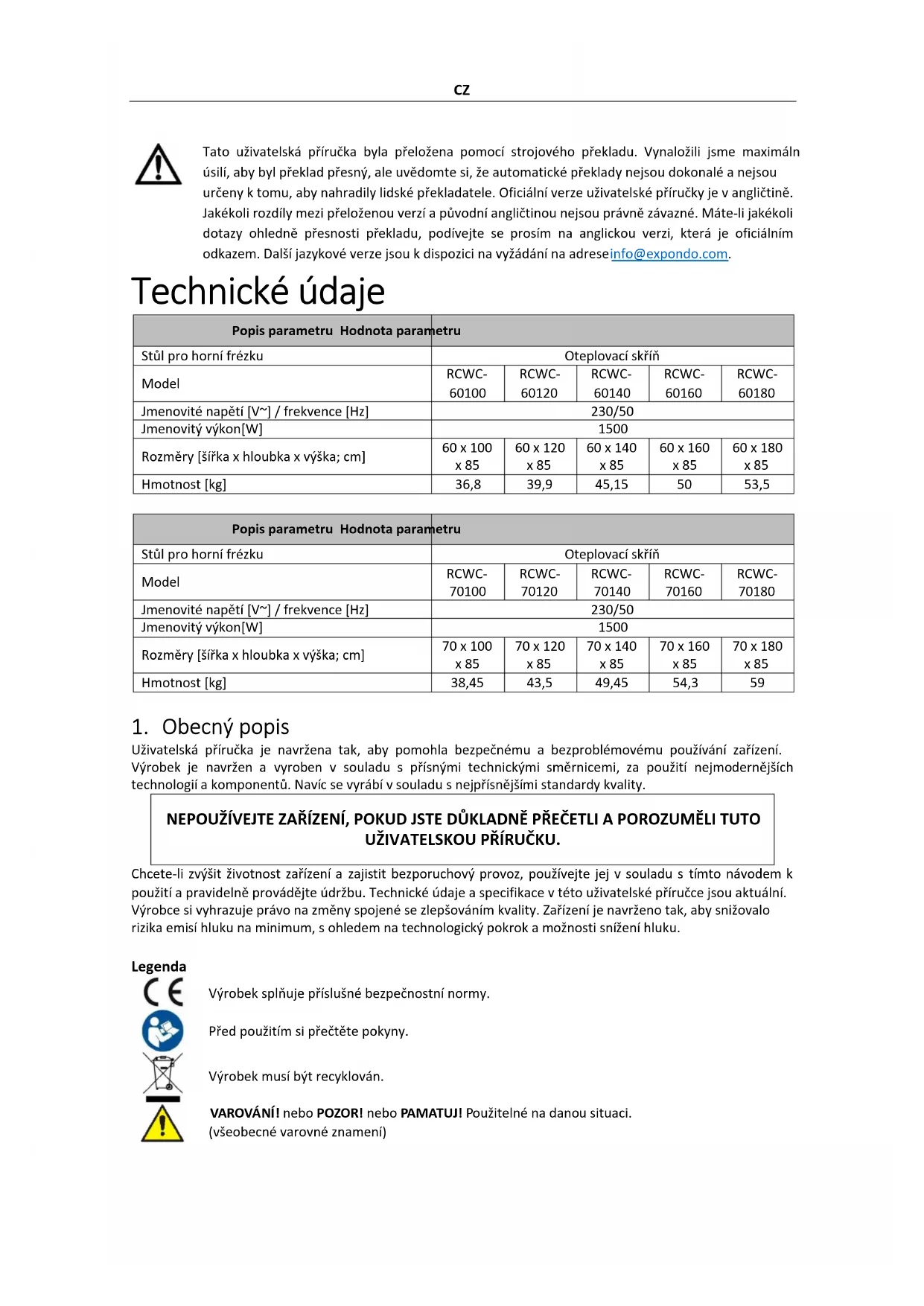 případné poškození. j) Na čistění používejte měkký a vlhký hadřík. k) K čištění nepoužívejte ostré a/nebo kovové předměty (např. drátěný kartáč nebo kovovou špachtli), protože by mohly poškodit povrchový materiál spotřebiče. l) Zařízení nečistěte kyselými látkami, prostředky pro lékařské účely, ředidly, palivy, oleji nebo jinými chemickými látkami, protože by mohly zařízení poškodit. LIKVIDACE POUŽITÉ ZAŘÍZENÍ: Nevyhazujte toto zařízení do komunálního odpadu. Předejte jej na sběrné a recyklační místo elektrických a elektrických zařízení. Zkontrolujte symbol na produktu, návodu k použití a balení. Plasty použité ke konstrukci zařízení lze recyklovat v souladu s jejich označením. Výběrem recyklace významně přispíváte k ochraně našeho životního prostředí. Informace o místním recyklačním zařízení získáte od místních úřadů.FR Ce manuel d'utilisation a été traduit à l'aide d'une traduction automatique. Nous avons fait tout notre possible pour garantir l'exactitude de la traduction, mais veuillez noter que les traductions automatiques ne sont pas parfaites et ne sont pas destinées à remplacer les traducteurs humains. La version officielle du manuel d'utilisation est en anglais. Les éventuelles différences entre la version traduite et l’original anglais ne sont pas juridiquement contraignantes. Si vous avez des questions sur l’exactitude de la traduction, veuillez vous référer à la version anglaise, qui est la référence officielle. D'autres versions linguistiques sont disponibles sur demande via info@expondo.com. Caractéristiques techniques Description du paramètre Valeur du paramètre Nom de produit Armoire chauffante Modèle RCWC-