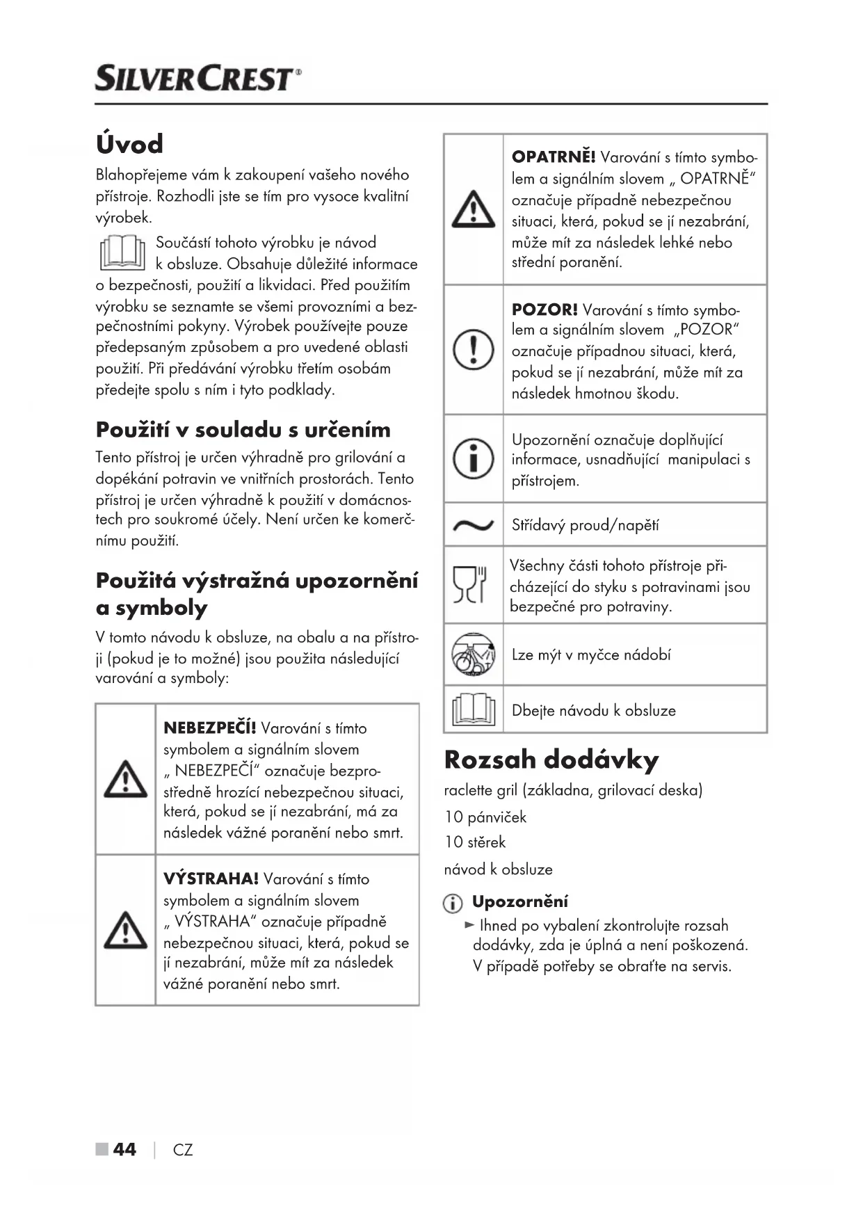 CZ Úvod Blahopřejeme vám kzakoupení vašeho nového přístroje. Rozhodli jste se tím pro vysoce kvalitní výrobek. Součástí tohoto výrobku je návod k obsluze. Obsahuje důležité informace obezpečnosti, použití alikvidaci. Před použitím výrobku se seznamte se všemi provozními abez- pečnostními pokyny. Výrobek používejte pouze předepsaným způsobem apro uvedené oblasti použití. Při předávání výrobku třetím osobám předejte spolu sním ityto podklady. Použití vsouladu surčením Tento přístroj je určen výhradně pro grilování a dopékání potravin ve vnitřních prostorách. Tento přístroj je určen výhradně kpoužití vdomácnos- tech pro soukromé účely. Není určen ke komerč- nímu použití. Použitá výstražná upozornění a symboly V tomto návodu k obsluze, na obalu a na přístro- ji (pokud je to možné) jsou použita následující varování a symboly: NEBEZPEČÍ! Varování s tímto symbolem a signálním slovem „ NEBEZPEČÍ“ označuje bezpro- středně hrozící nebezpečnou situaci, která, pokud se jí nezabrání, má za následek vážné poranění nebo smrt. VÝSTRAHA! Varování s tímto symbolem a signálním slovem „ VÝSTRAHA“ označuje případně nebezpečnou situaci, která, pokud se jí nezabrání, může mít za následek vážné poranění nebo smrt. OPATRNĚ! Varování s tímto symbo- lem a signálním slovem „ OPATRNĚ“ označuje případně nebezpečnou situaci, která, pokud se jí nezabrání, může mít za následek lehké nebo střední poranění. POZOR! Varování s tímto symbo- lem a signálním slovem „POZOR“ označuje případnou situaci, která, pokud se jí nezabrání, může mít za následek hmotnou škodu. Upozornění označuje doplňující informace, usnadňující manipulaci s přístrojem. Střídavý proud/napětí Všechny části tohoto přístroje při- cházející do styku s potravinami jsou bezpečné pro potraviny. Lze mýt v myčce nádobí Dbejte návodu kobsluze Rozsah dodávky raclette gril (základna, grilovací deska) 10 pánviček 10 stěrek návod kobsluze Upozornění ► Ihned po vybalení zkontrolujte rozsah dodávky, zda je úplná a není poškozená. Vpřípadě potřeby se obraťte na servis. IB_460256_SRGM1500B2_LB8.indb 44 11.06.2024 10:36:49CZ