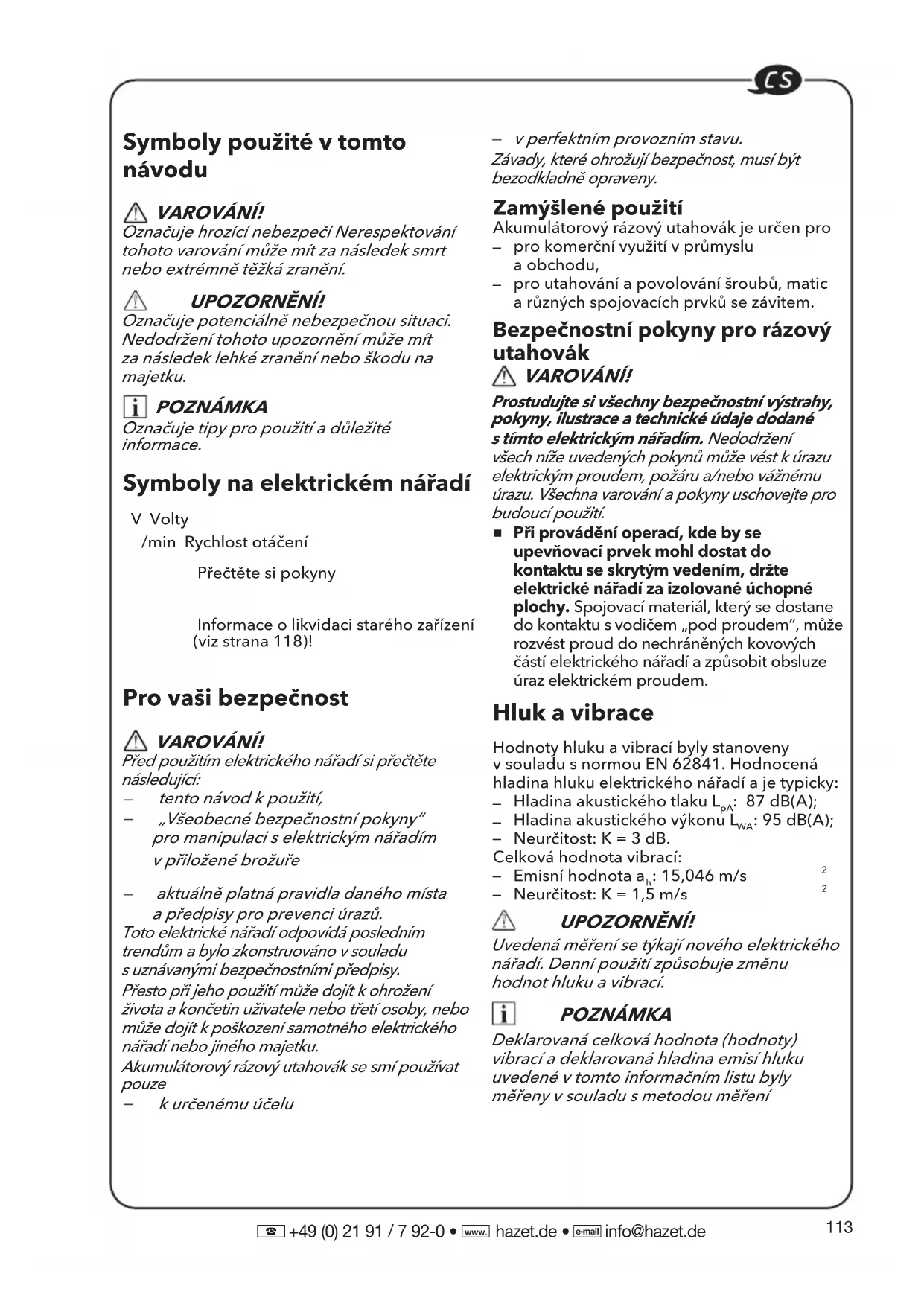 +49 (0) 21 91 / 7 92-0 • hazet.de • info@hazet.de Symboly použité vtomto návodu VAROVÁNÍ! Označuje hrozící nebezpečí Nerespektování tohoto varování může mít za následek smrt nebo extrémně těžká zranění. UPOZORNĚNÍ! Označuje potenciálně nebezpečnou situaci. Nedodržení tohoto upozornění může mít za následek lehké zranění nebo škodu na majetku. POZNÁMKA Označuje tipy pro použití adůležité informace. Symboly na elektrickém nářadí V Volty/min Rychlost otáčení Přečtěte si pokyny Informace olikvidaci starého zařízení (viz strana 118)! Pro vaši bezpečnost VAROVÁNÍ! Před použitím elektrického nářadí si přečtěte následující: tento návod kpoužití, „Všeobecné bezpečnostní pokyny“ pro manipulaci selektrickým nářadím vpřiložené brožuře aktuálně platná pravidla daného místa apředpisy pro prevenci úrazů. Toto elektrické nářadí odpovídá posledním trendům abylo zkonstruováno vsouladu suznávanými bezpečnostními předpisy. Přesto při jeho použití může dojít kohrožení života akončetin uživatele nebo třetí osoby, nebo může dojít kpoškození samotného elektrického nářadí nebo jiného majetku. Akumulátorový rázový utahovák se smí používat pouze kurčenému účelu vperfektním provozním stavu. Závady, které ohrožují bezpečnost, musí být bezodkladně opraveny. Zamýšlené použití Akumulátorový rázový utahovák je určen pro pro komerční využití vprůmysluaobchodu, pro utahování apovolování šroubů, maticarůzných spojovacích prvků se závitem. Bezpečnostní pokyny pro rázový utahovák VAROVÁNÍ! Prostudujte si všechny bezpečnostní výstrahy, pokyny, ilustrace atechnické údaje dodané stímto elektrickým nářadím. Nedodržení všech níže uvedených pokynů může vést kúrazu elektrickým proudem, požáru a/nebo vážnému úrazu. Všechna varování apokyny uschovejte pro budoucí použití.