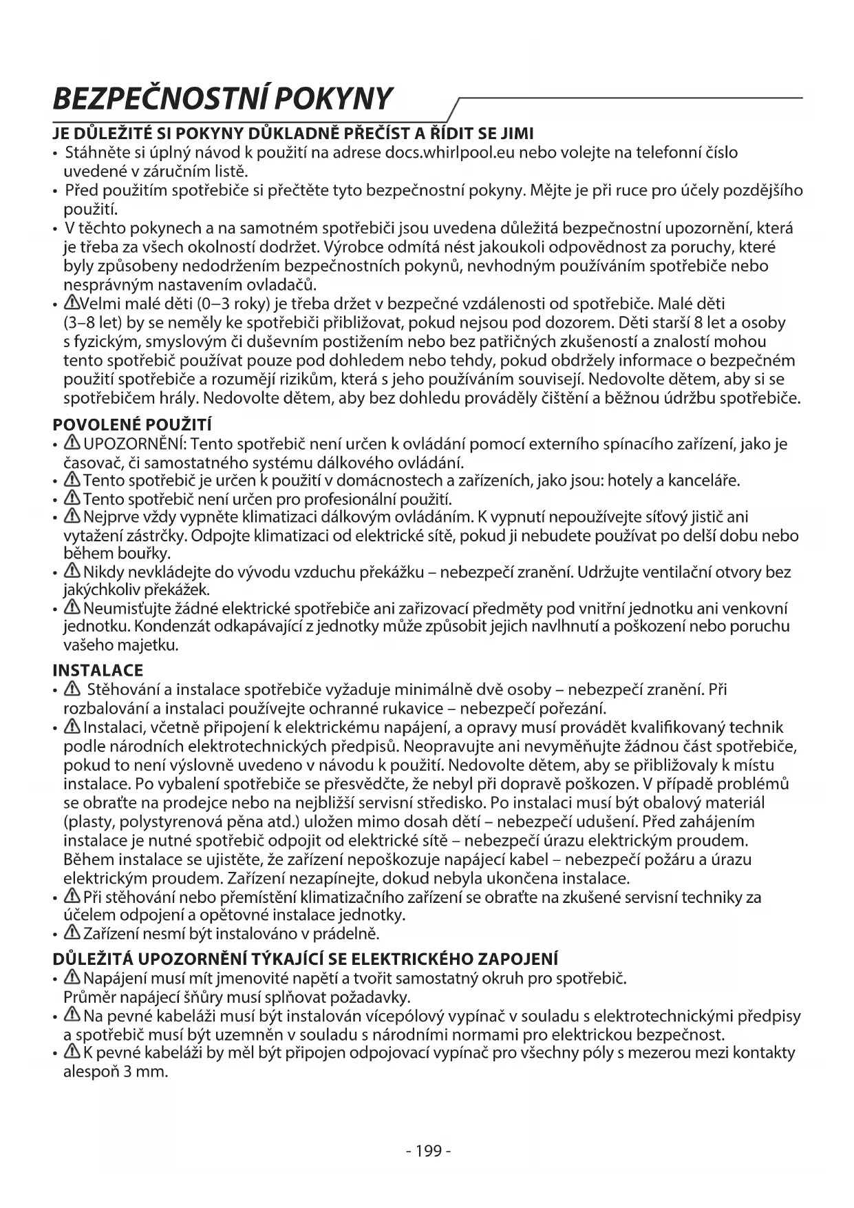 - Jednotka přechází zrežimu topení do režimu odmrazování. Indikátor zhasne avrátí se do režimu topení. Poznámka: Pokud závada dále trvá, zařízení vypněte aodpojte od napájení. Pak se obraťte na nejbližší autorizované servisní středisko Whirlpool.- 213 -
