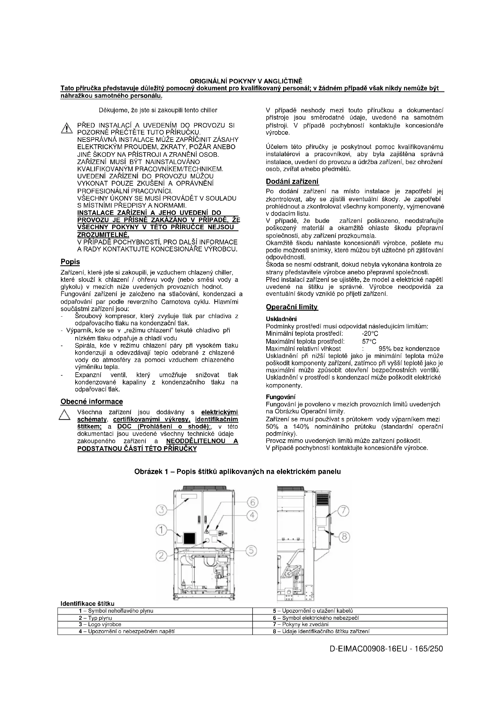 Identifikace štítku 1 – Symbol nehořlavého plynu 5 – Upozornění o utažení kabelů 2 – Typ plynu 6 – Symbol elektrického nebezpečí 3 – Logo výrobce 7 – Pokyny ke zvedání 4 – Upozornění o nebezpečném napětí 8 – Údaje identifikačního štítku zařízeníD-EIMAC00908-16EU - 166/250