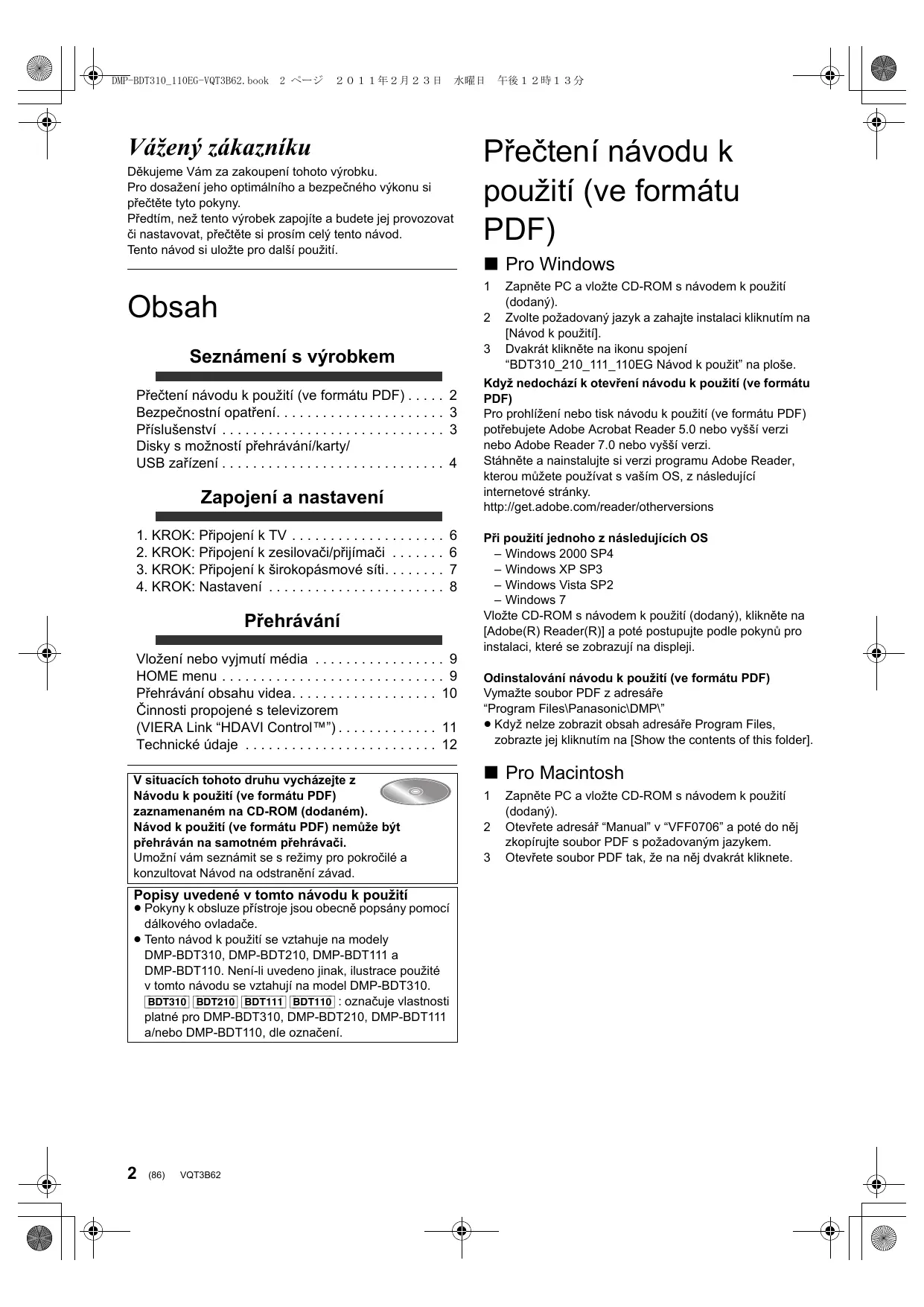 Zapněte PC a vložte CD-ROM s návodem k použití (dodaný). Zvolte požadovaný jazyk a zahajte instalaci kliknutím na [Návod k použití]. Dvakrát klikněte na ikonu spojení “BDT310_210_111_110EG Návod k použit” na ploše. Když nedochází k otevření návodu k použití (ve formátu PDF) Pro prohlížení nebo tisk návodu k použití (ve formátu PDF) potřebujete Adobe Acrobat Reader 5.0 nebo vyšší verzi nebo Adobe Reader 7.0 nebo vyšší verzi. Stáhněte a nainstalujte si verzi programu Adobe Reader, kterou můžete používat s vaším OS, z následující internetové stránky. http://get.adobe.com/reader/otherversions Při použití jednoho z následujících OS – Windows 2000 SP4 – Windows XP SP3 – Windows Vista SP2 – Windows 7 Vložte CD-ROM s návodem k použití (dodaný), klikněte na [Adobe(R) Reader(R)] a poté postupujte podle pokynů pro instalaci, které se zobrazují na displeji. Odinstalování návodu k použití (ve formátu PDF) Vymažte soubor PDF z adresáře “Program Files\Panasonic\DMP\” ≥ Když nelze zobrazit obsah adresáře Program Files, zobrazte jej kliknutím na [Show the contents of this folder]. ∫ Pro Macintosh