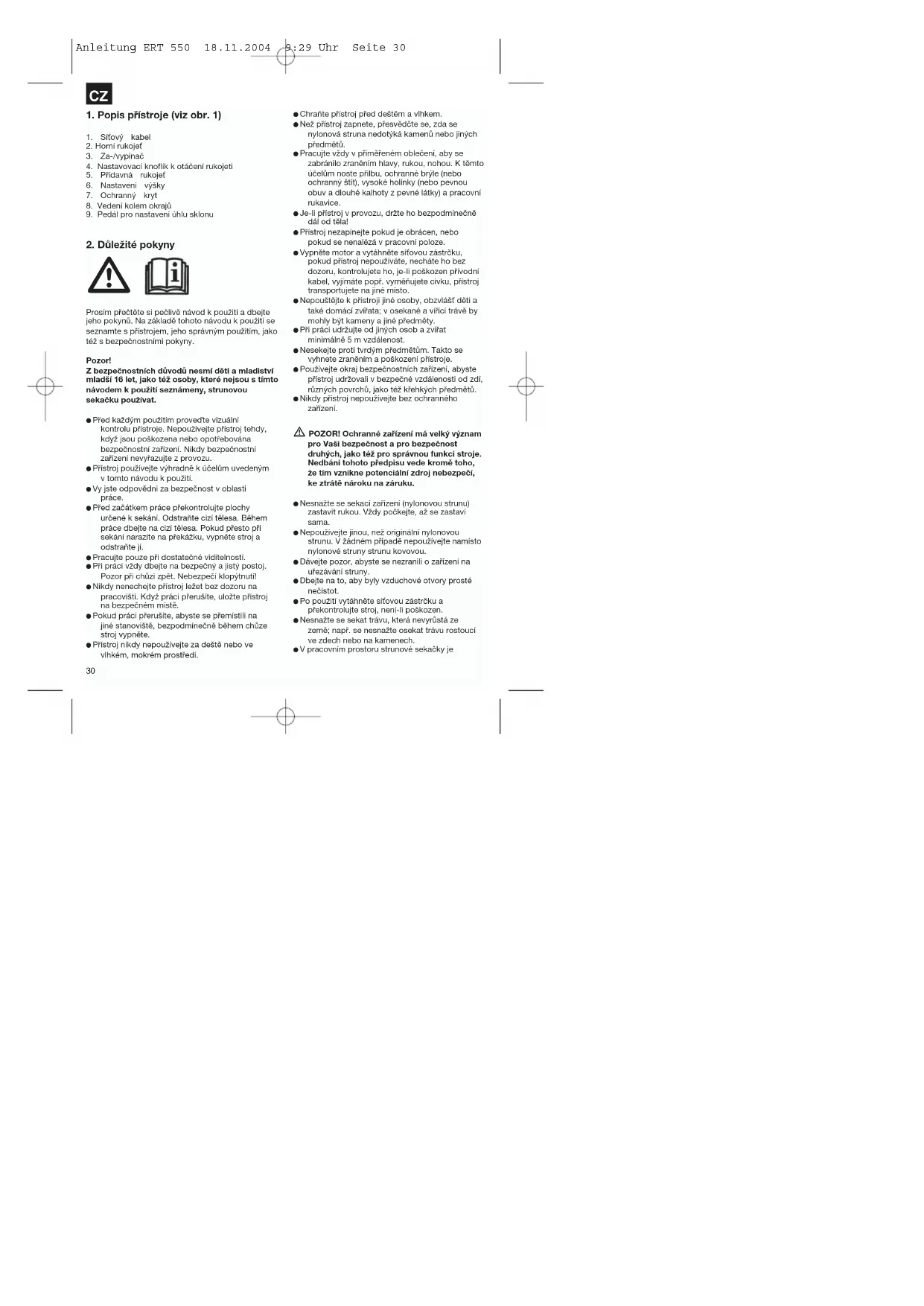 Anleitung ERT 550 18.11.2004 9:29 Uhr Seite 30uživatel zodpovědný vůči třetím osobám za škody způsobené provozem přístroje. Se zapnutým přístrojem nepřecházejte silnice a štěrkované cesty. Pokud přístroj nepoužíváte, uložte ho na suchém a dětem nepřístupném místě. Přístroj používejte pouze tak, jak je to uvedeno v tomto návodu k použití a držte ho vždy svisle k zemi. Každá jiná poloha je nebezpečná. Pravidelně kontrolujte, zda jsou šrouby pevně utaženy. Síťové napětí musí odpovídat napětí uvedenému na datovém štítku přístroje. Napájecí vedení musí být pravidelně kontrolováno zda není poškozené nebo nevykazuje stopy stárnutí. Příjstroj nesmí být používán, pokud není napájecí vedení v bezvadném stavu. Použitá napájecí vedení nesmí být lehčí než lehká vedení v pryžové hadici HO7RN-F podle DIN 57282/VDE 0282 a mít minimální průměr 1,5 mm2. Konektory musí mít ochranné kontakty a spojka musí být chráněna proti stříkající vodě. Plochu určenou k sekání vždy udržovat prostou kabelů a jiných předmětů. Pokud musí být přístroj kvůli přepravě nadzvednut, musí být vypnut motor a je třeba vyčkat, až se přístroj zastaví. Před opuštěním přístroje musí být odstaven motor a vytažena síťová zástrčka. Než přístroj připojíte na síť, ubezpečte se, zda není poškozen žádný z otáčejících se prvků a zda je cívka se strunou správně nasazena a upevněna. Během provozu nesmíte v žádném případě sekat proti tvrdým předmětům, jen tak zabráníte zraněním obsluhy a škodám na stroji. Při údržbě používat pouze originální náhradní díly. Opravy smí provádět pouze elektroodborník. Před uvedením stroje do provozu a po jakémkoliv nárazu překontrolujte stroj, zda nevykazuje známky opotřebení nebo poškození a nechejte provést nutné opravy. Ruce a nohy nikdy nepřibližujte k řezacímu zařízení, především když zapnete motor. Po vytažení nové struny držte stroj než ho zapnete vždy v jeho normální pracovní poloze. Nepoužívejte nikdy náhradní díly a příslušenství, které výrobce neuvedl nebo nedoporučil. Vytáhněte síťovou zástrčku před kontrolami, čištěním nebo pracemi na stroji a pokud není stroj používán. Pozor: Po odstavení nylonová struna ještě několik vteřin rotuje!